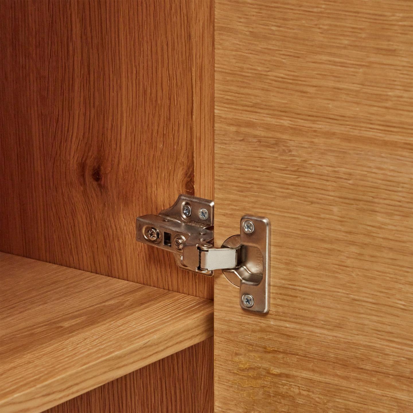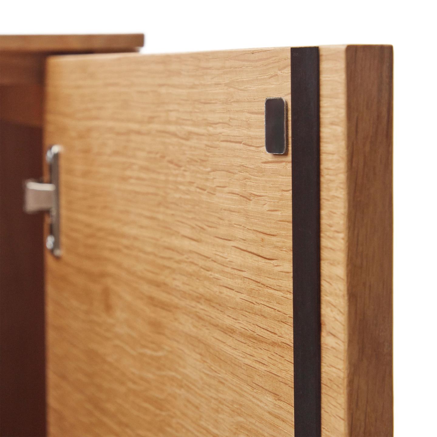 - Material das portas: MDF E0 (painel de fibra de densidade média com baixas emissões de formaldeído classe E0), Chapa de carvalho (Quercus alba)