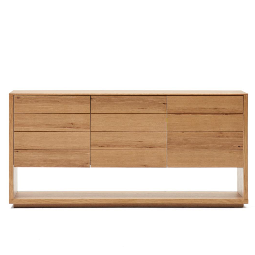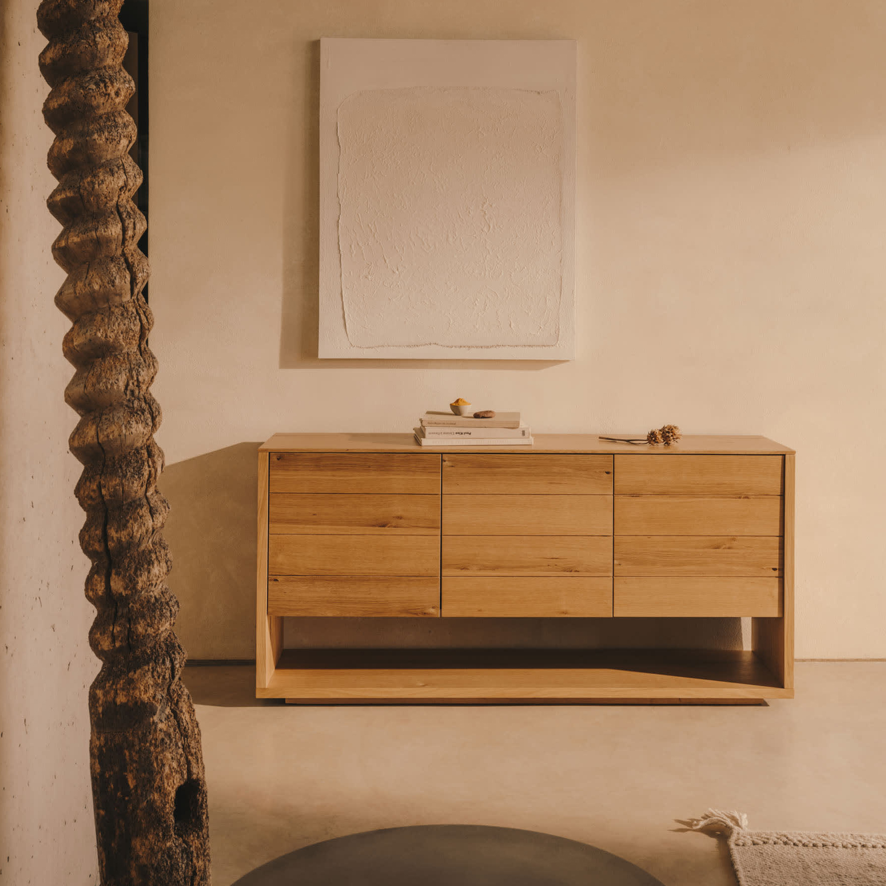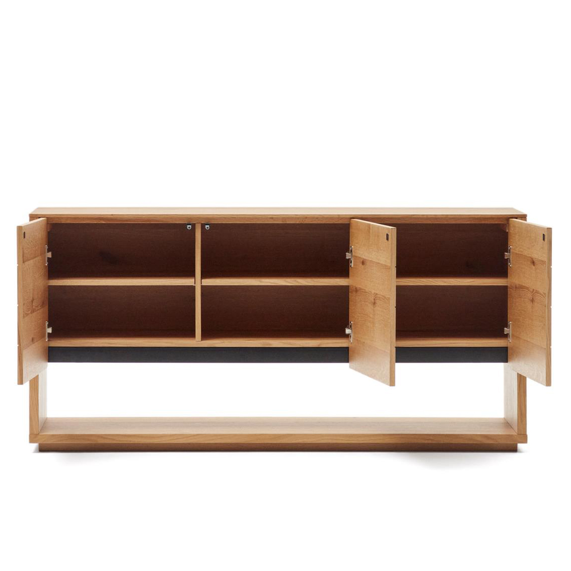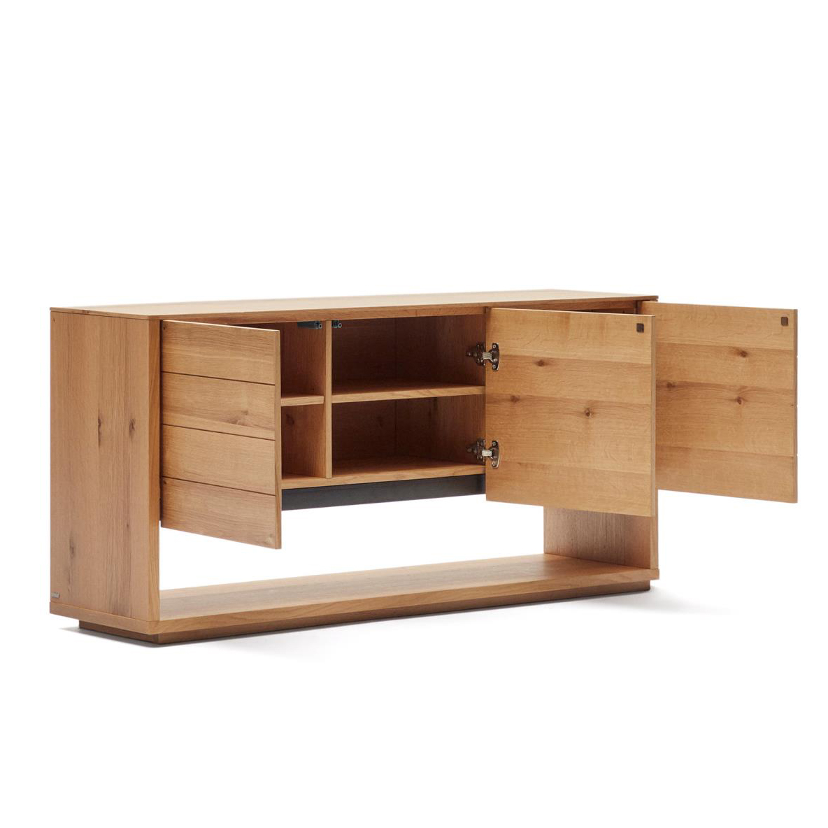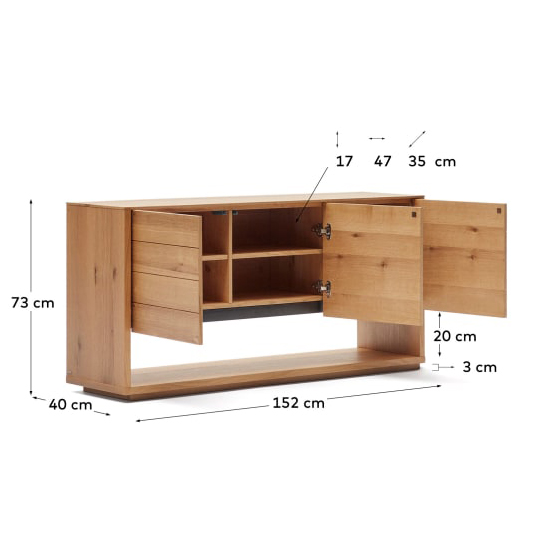 - O aparador dispõe de pés reguláveis e é composto por três portas com abertura por pressão e fecho suave.