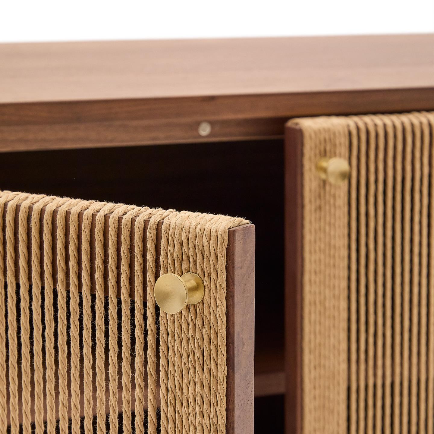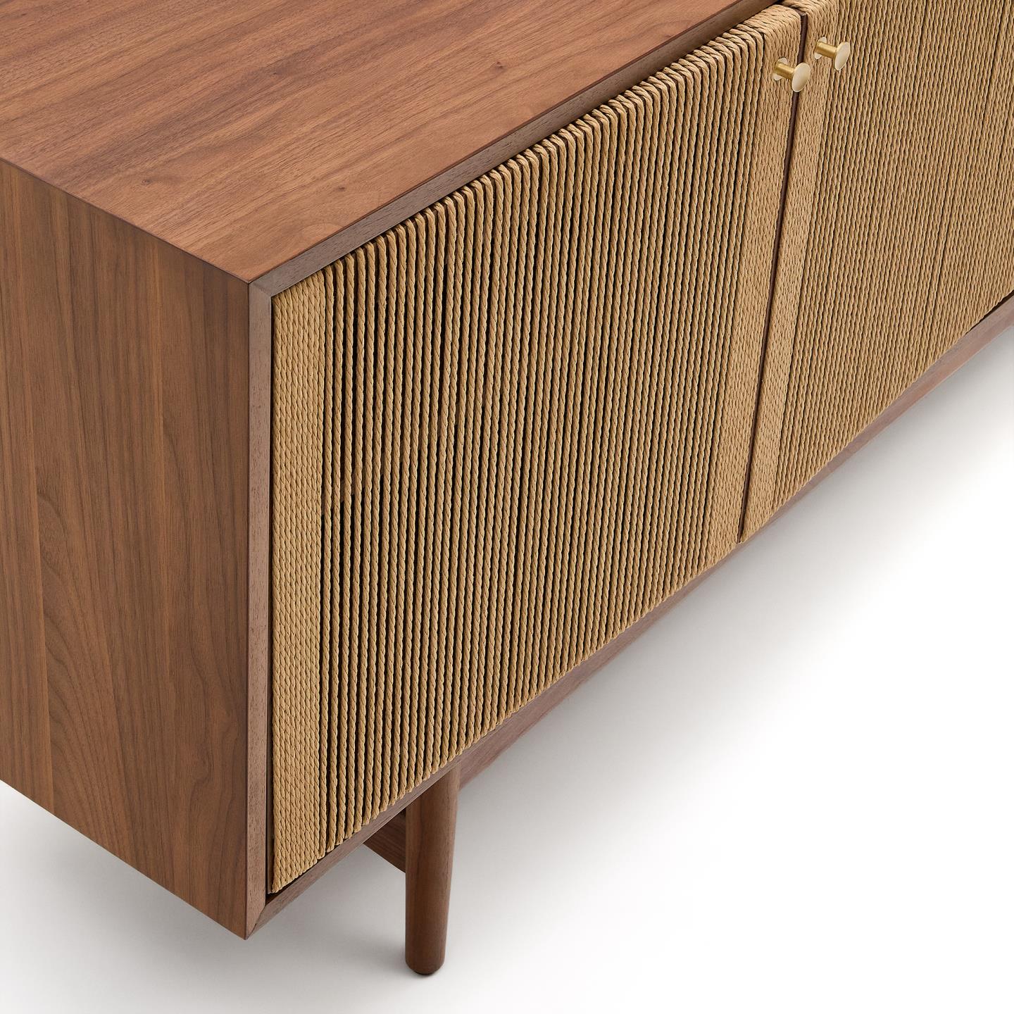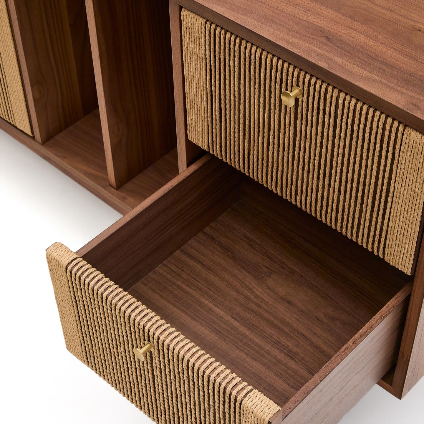 - Portas e gavetas com detalhe em corda de papel trançada à mão.