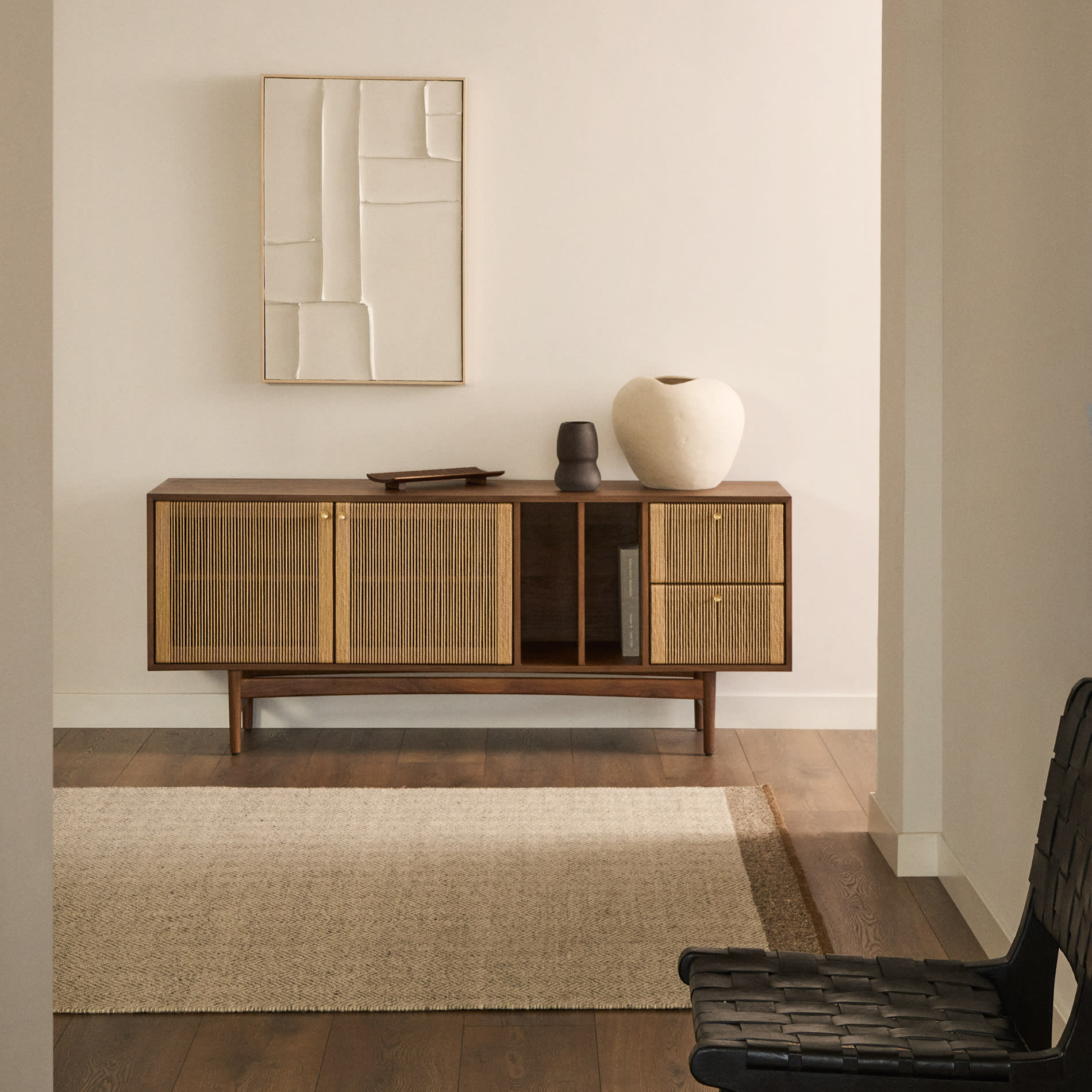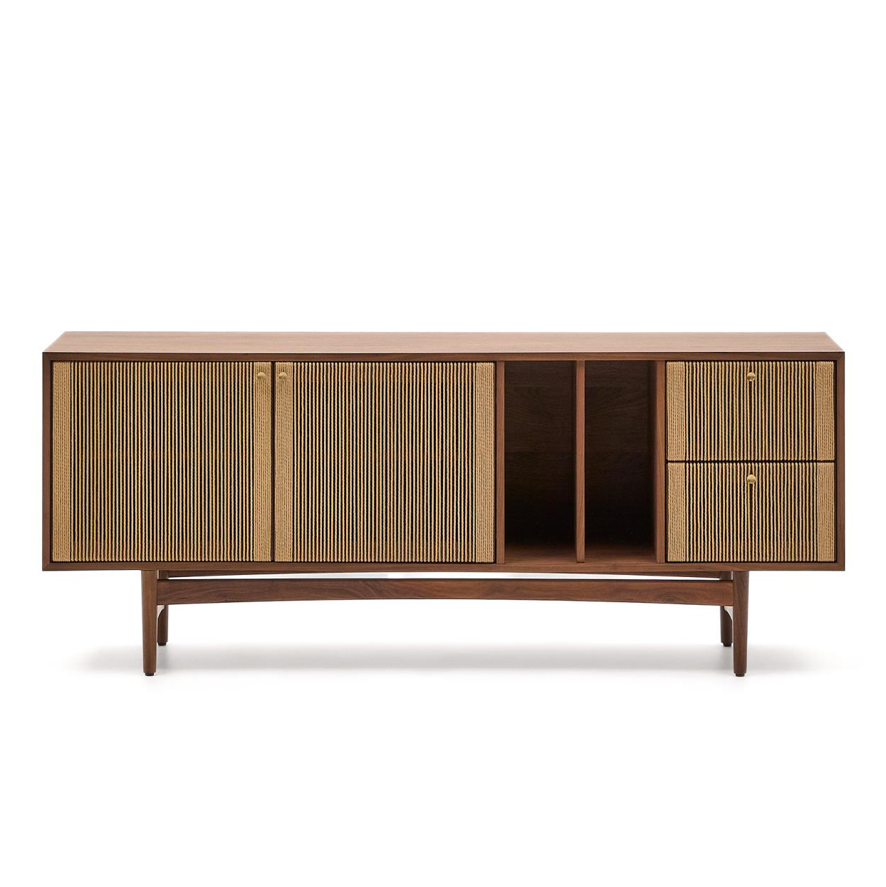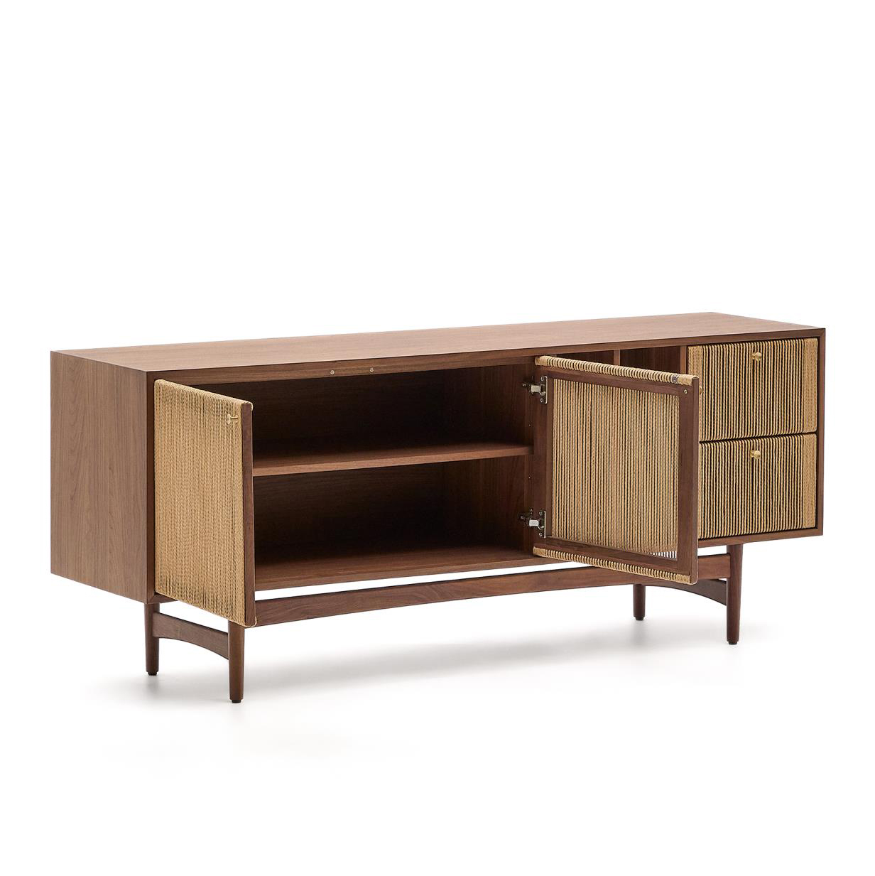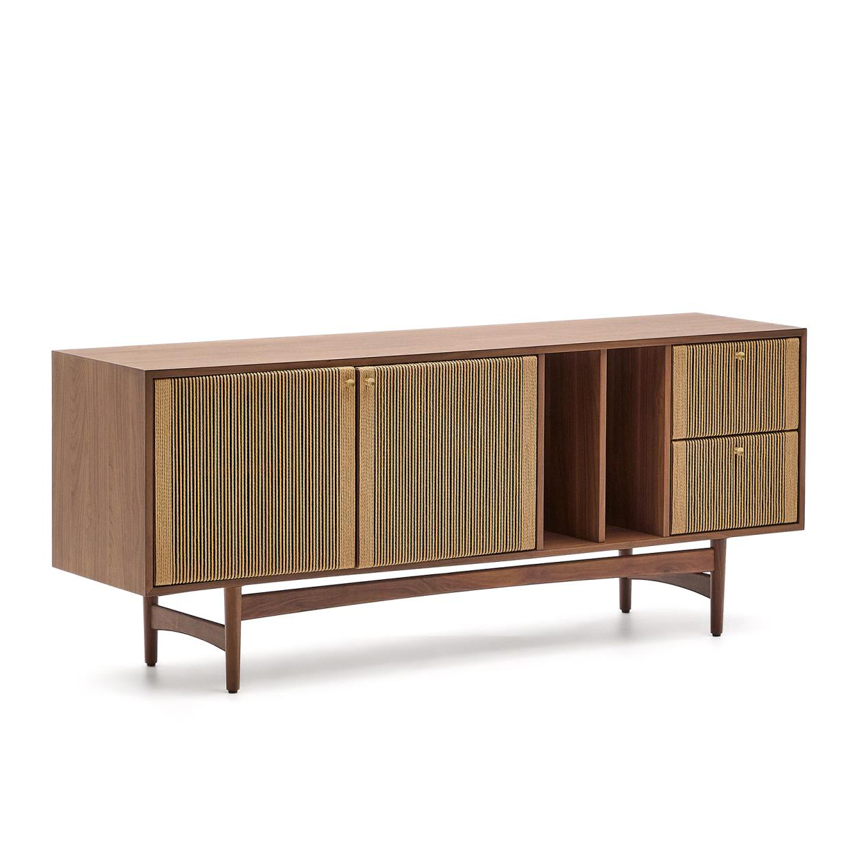 - Portas e gavetas com detalhe em corda de papel trançada à mão.