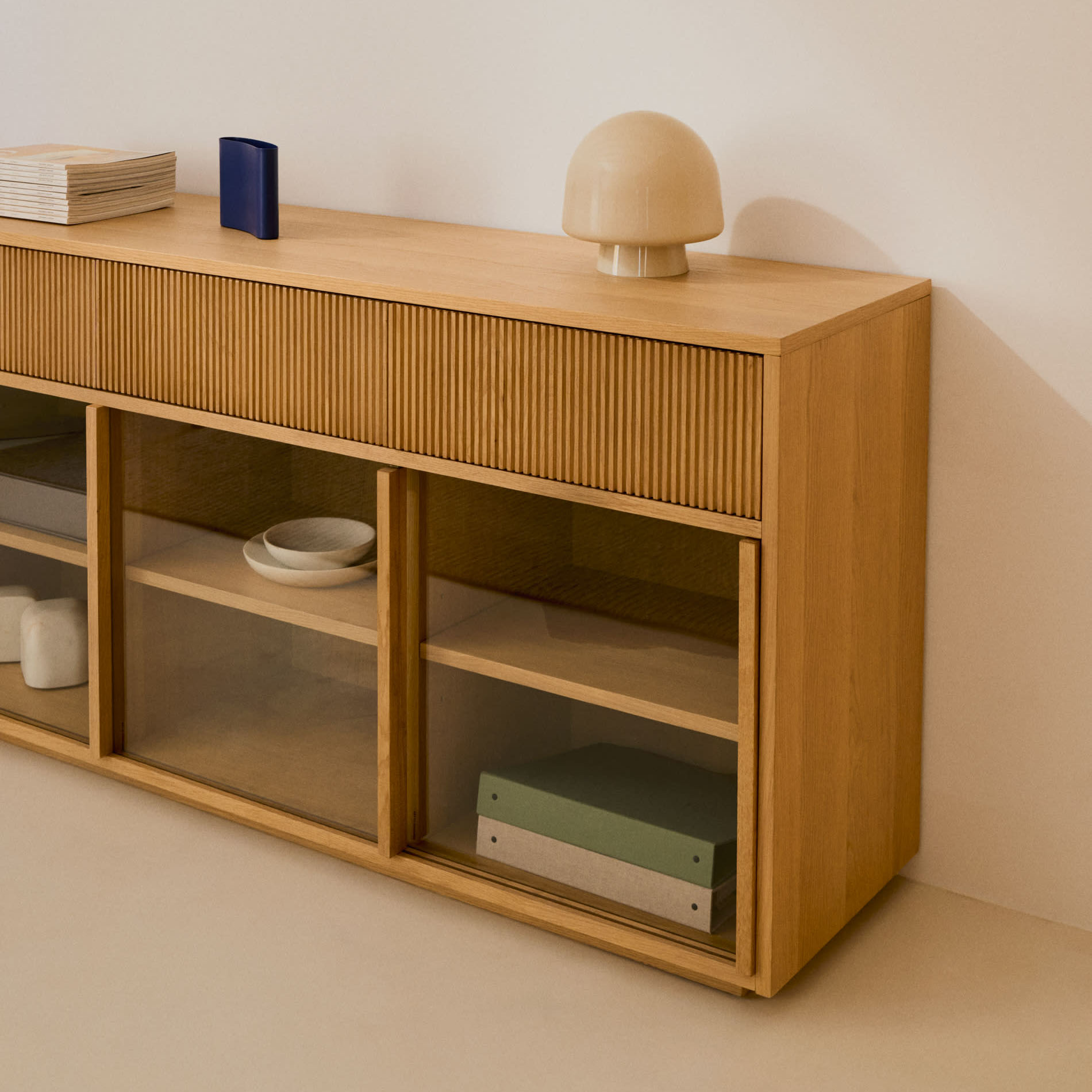 - O vidro ilumina e permite que as cores e as texturas do seu interior definam a sua aparência, enquanto a madeira confere um toque quente.