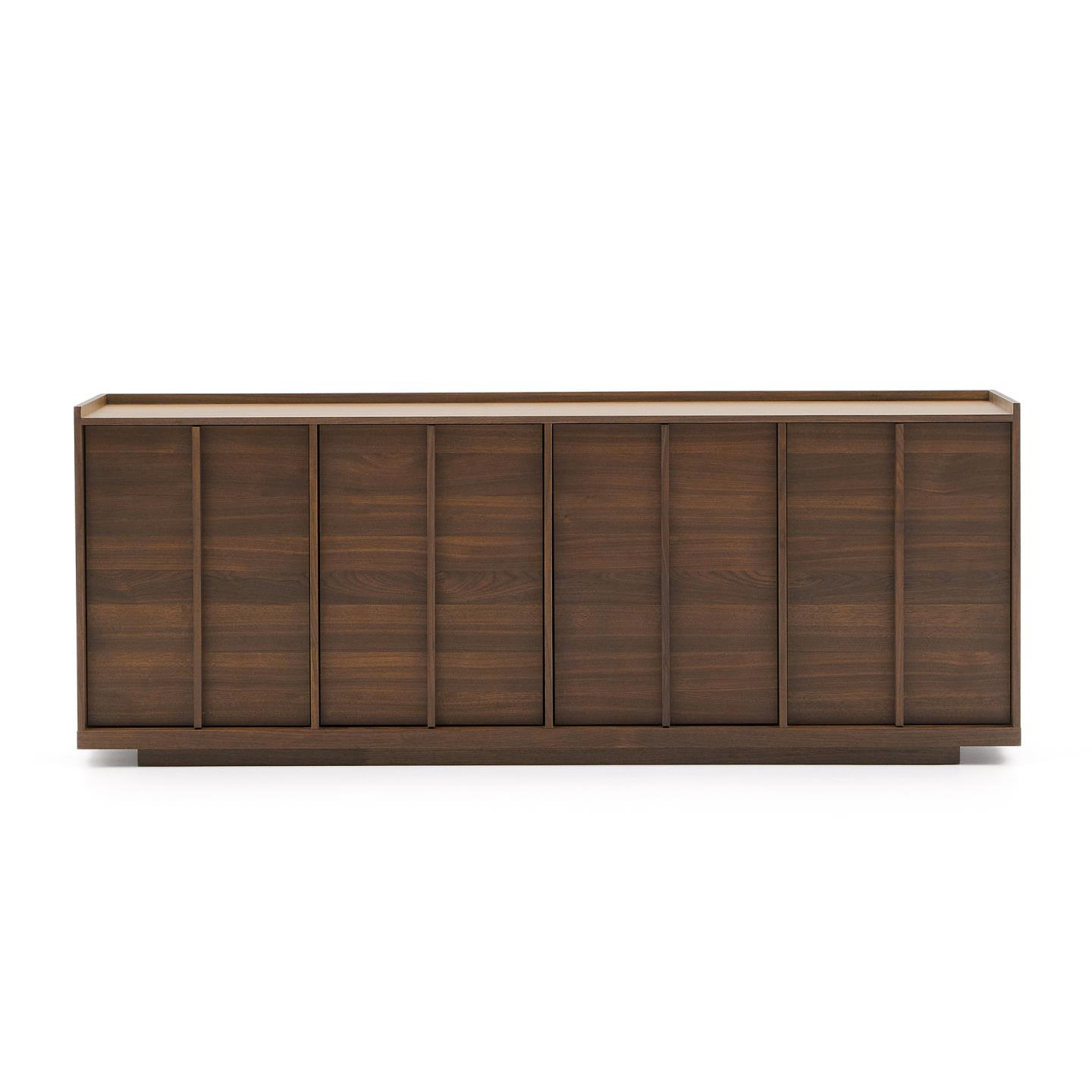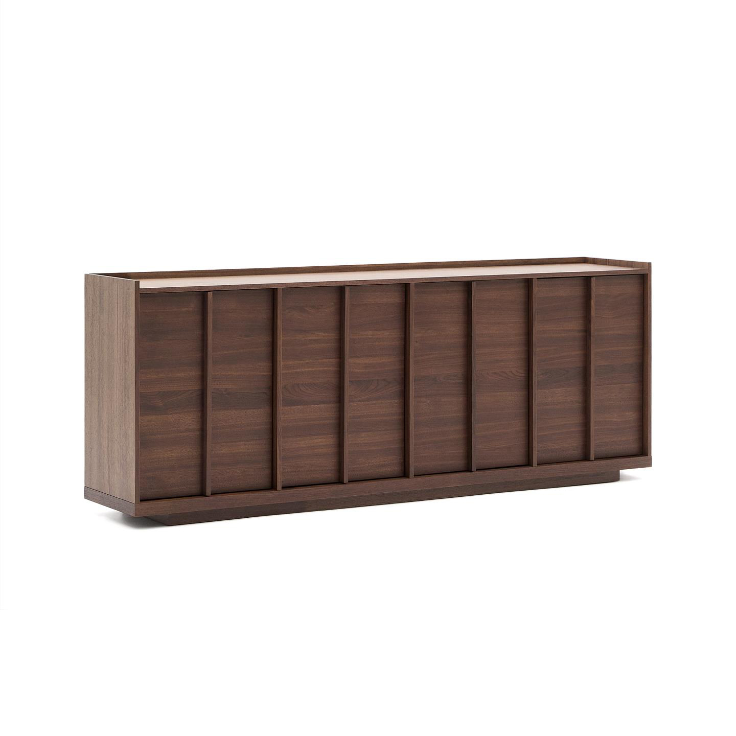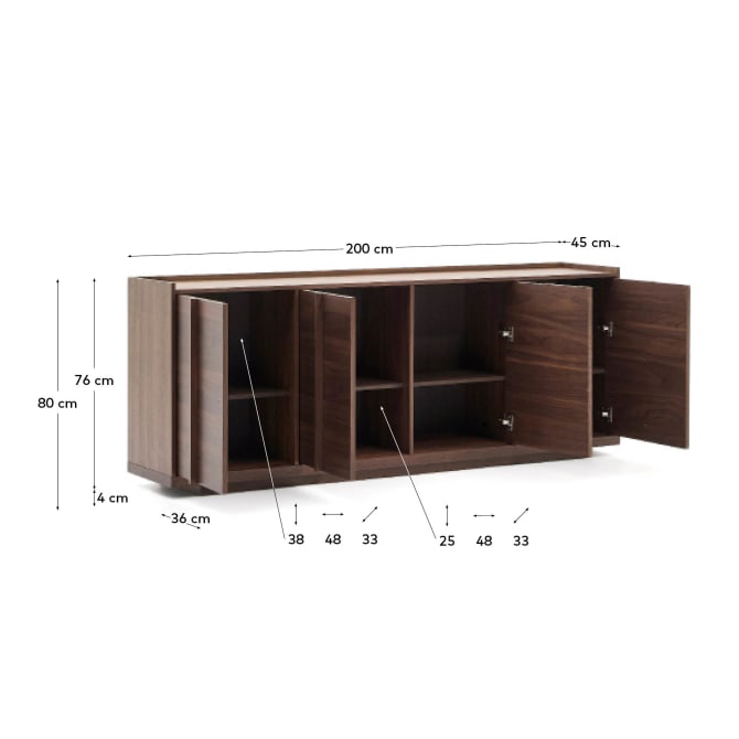 - Fabricada em MDF e chapa de nogueira com acabamento escuro em verniz de poliuretano.