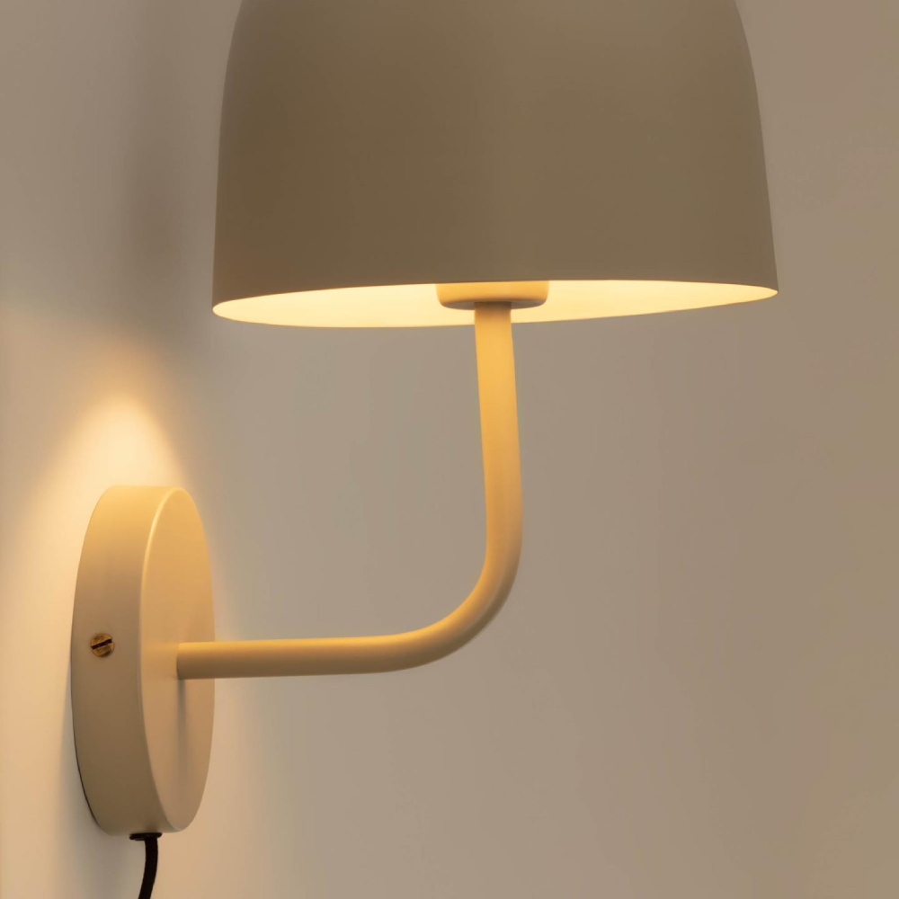 - O candeeiro de parede Alice apresenta um acabamento bege mate em metal, oferecendo uma estética minimalista com um toque vintage.