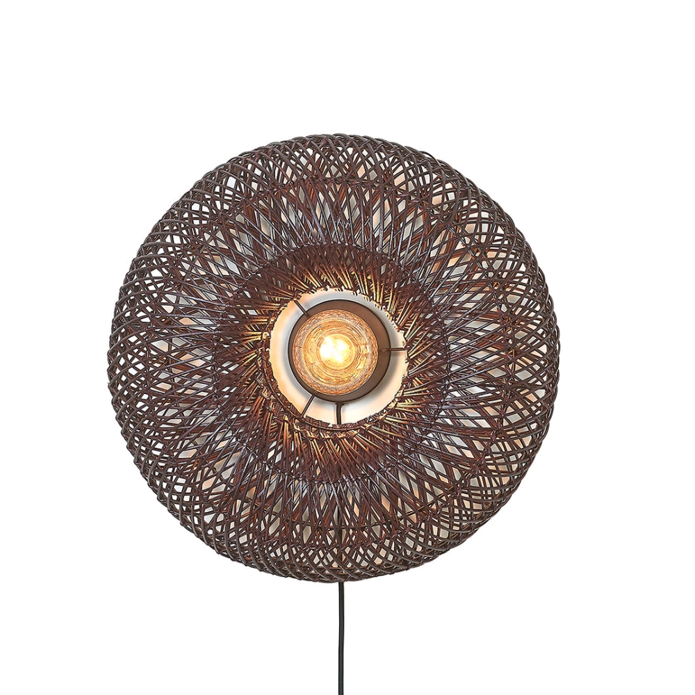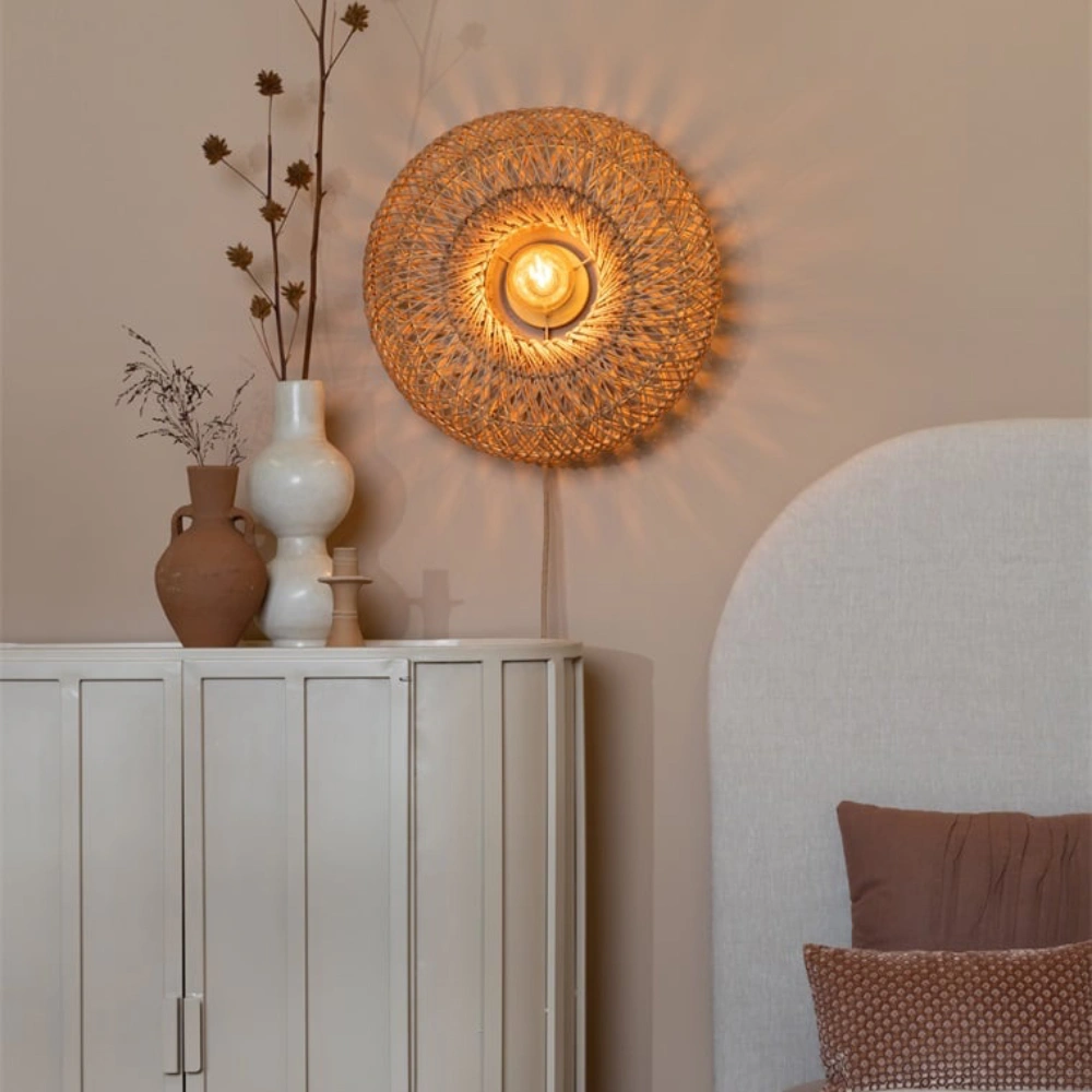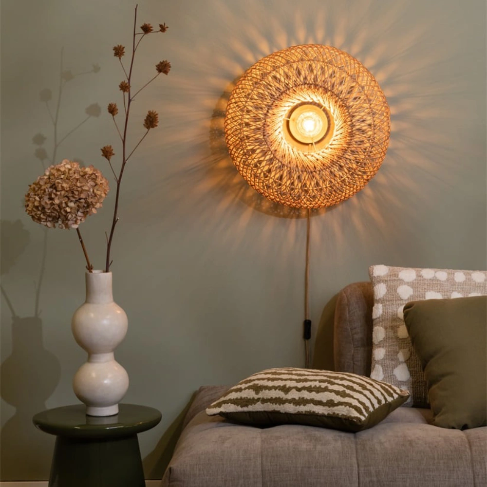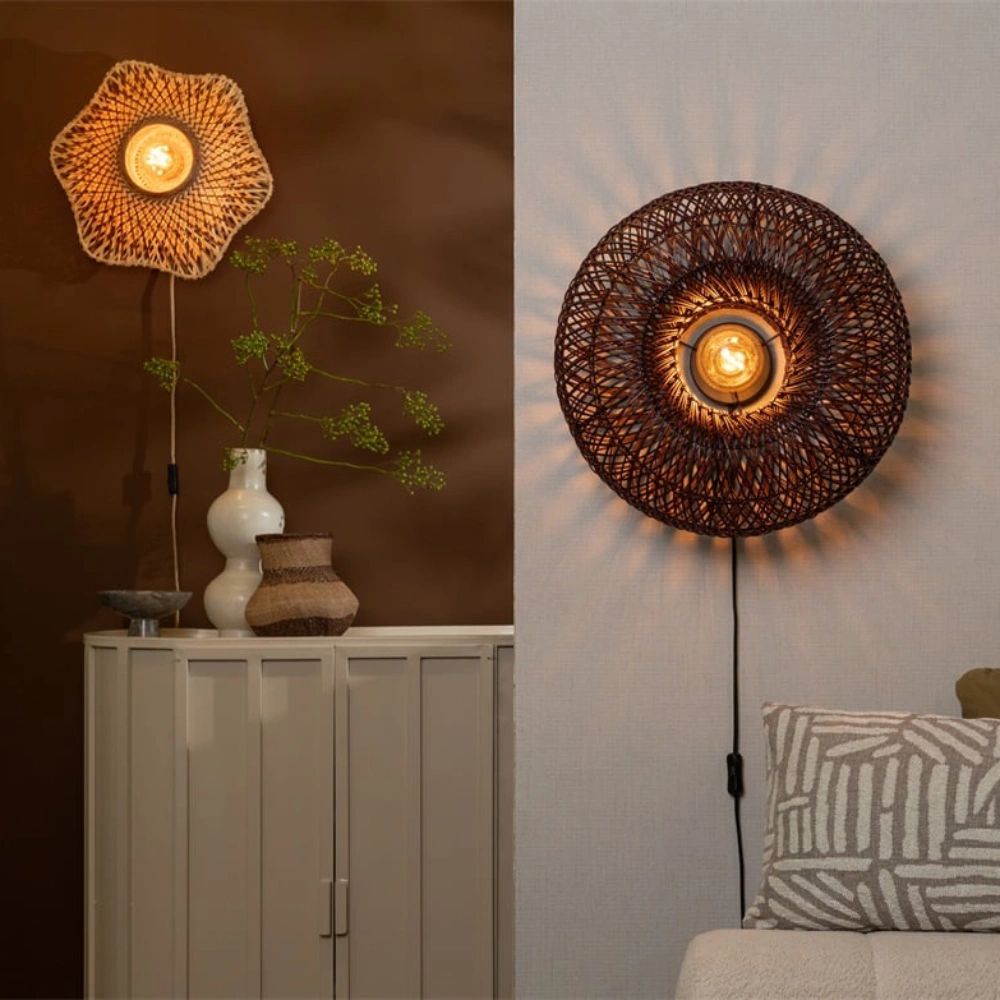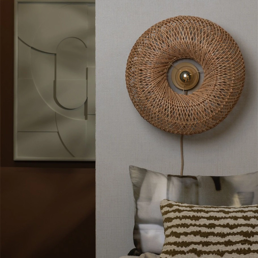 - O candeeiro de parede Arizona apresenta um abajur em rattan natural, trançado à mão, que projeta uma luz suave e texturada nas paredes.