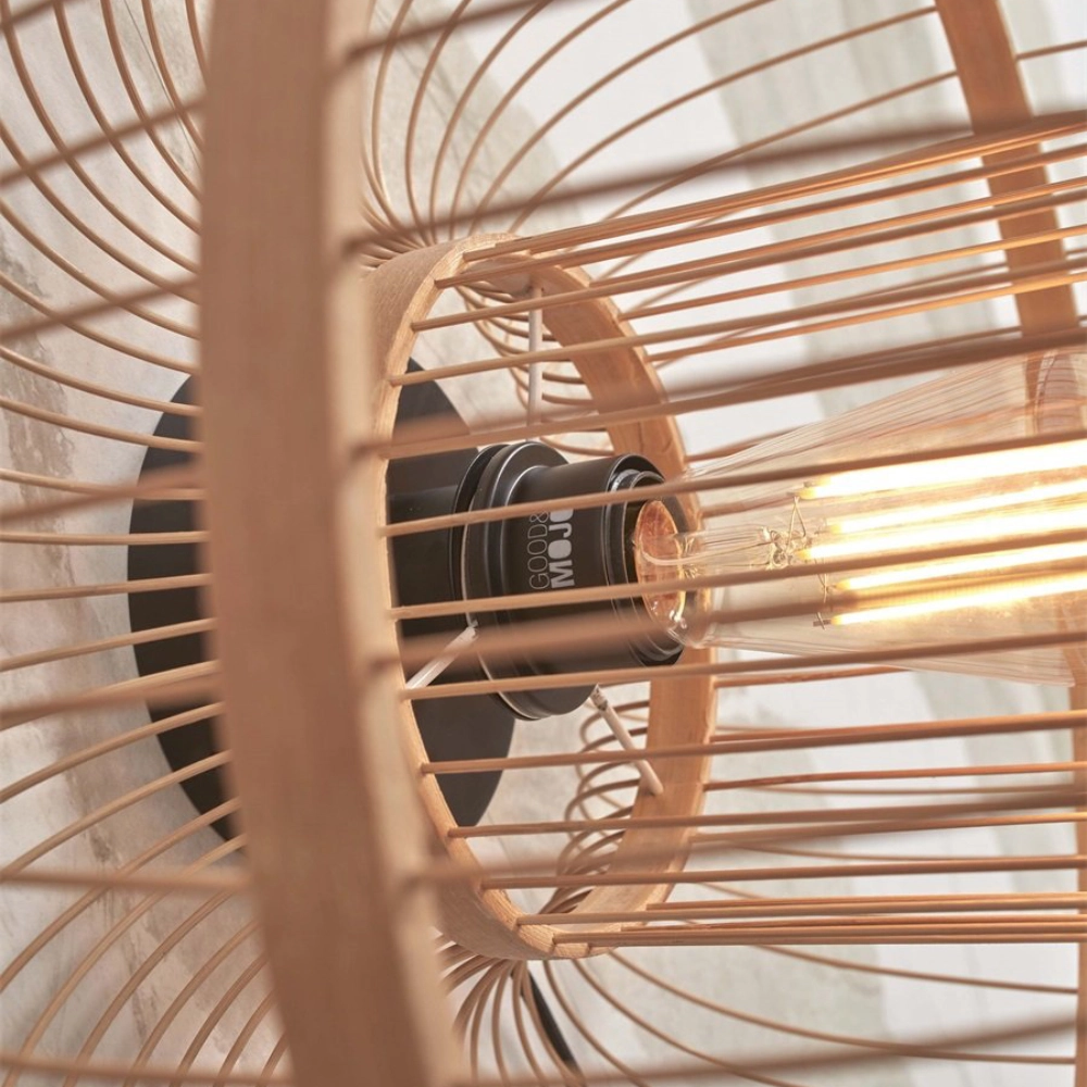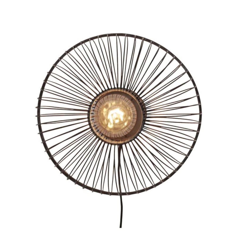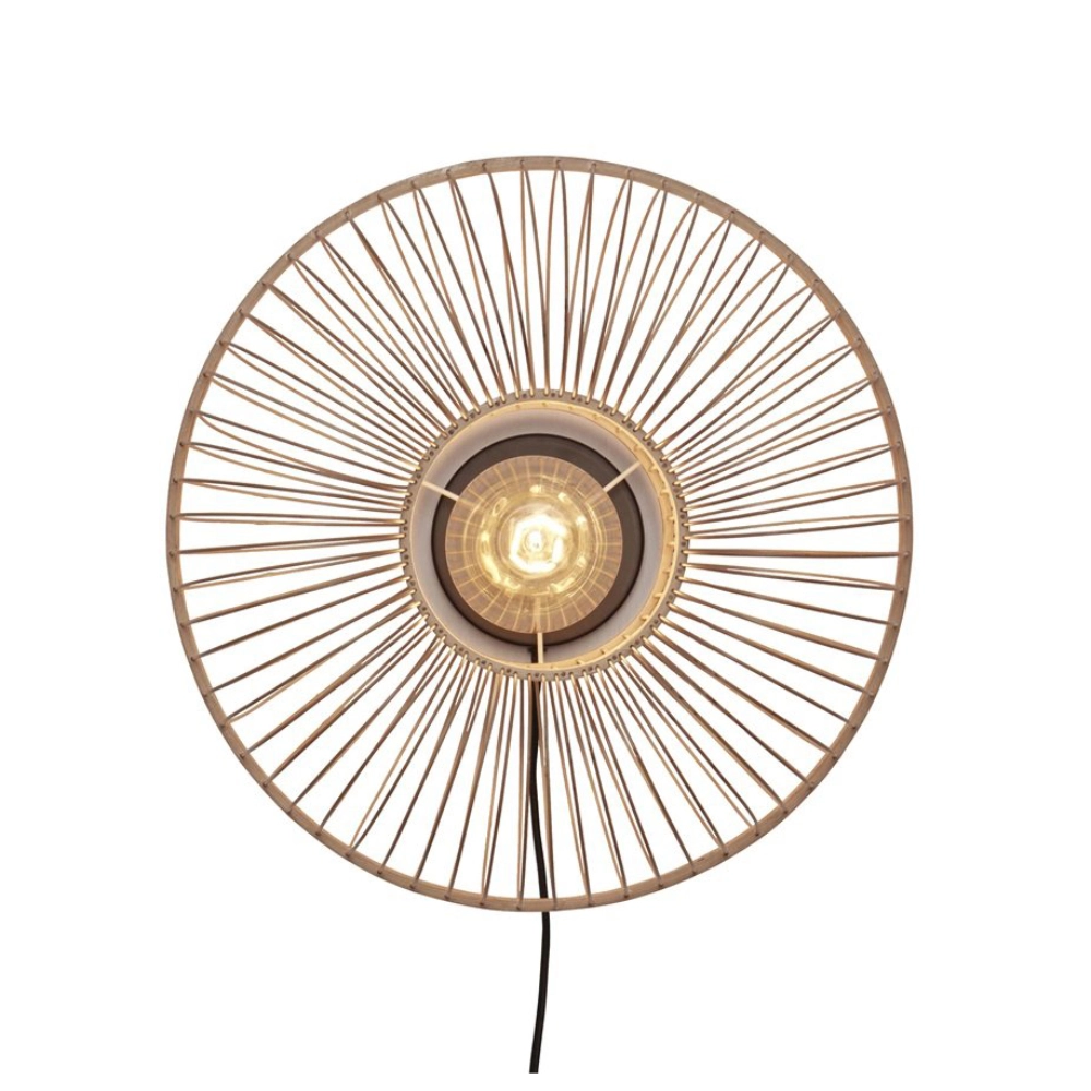 - O candeeiro de parede Hokkaido é feito à mão com bambu sustentável, num padrão radial que evoca o movimento do sol nascente e projeta efeitos de luz e sombra suaves na parede.