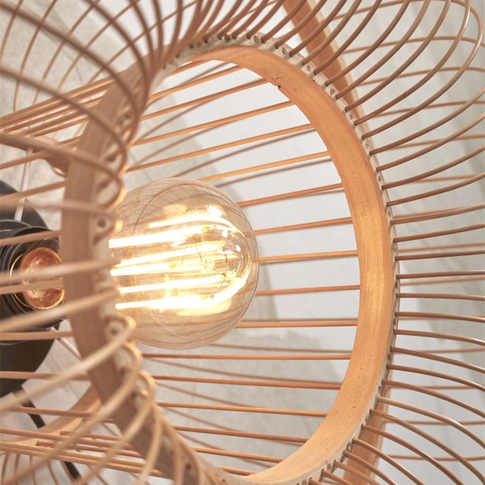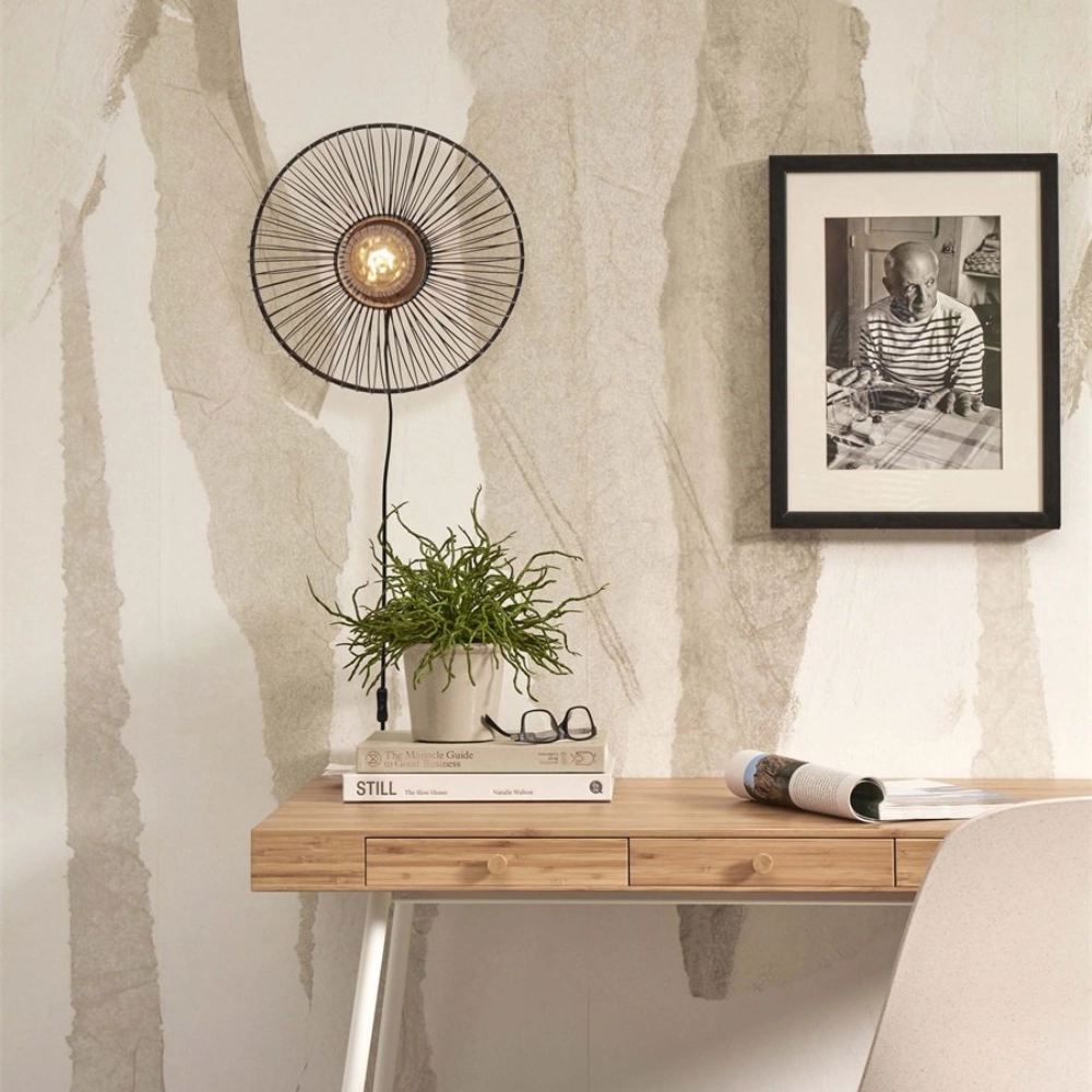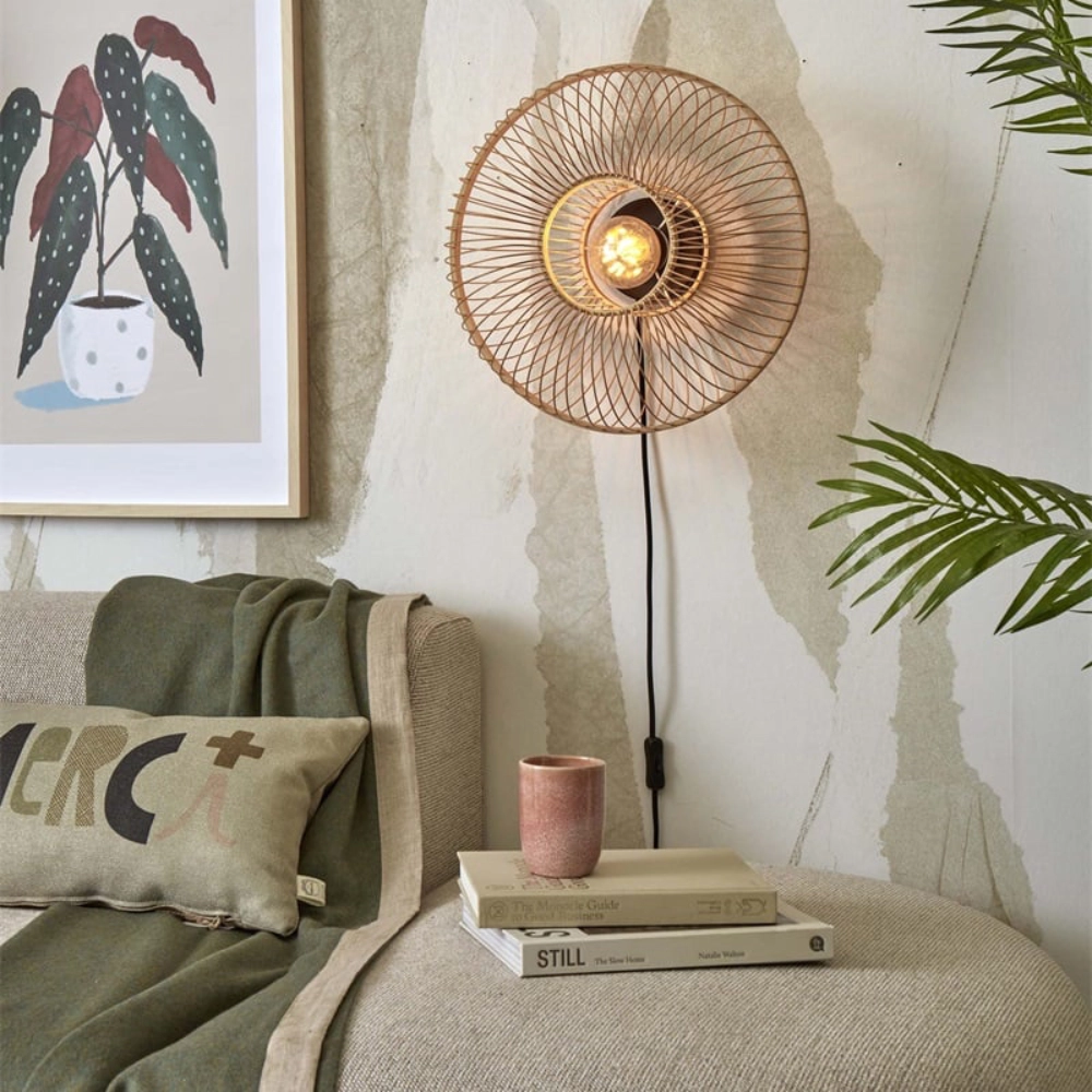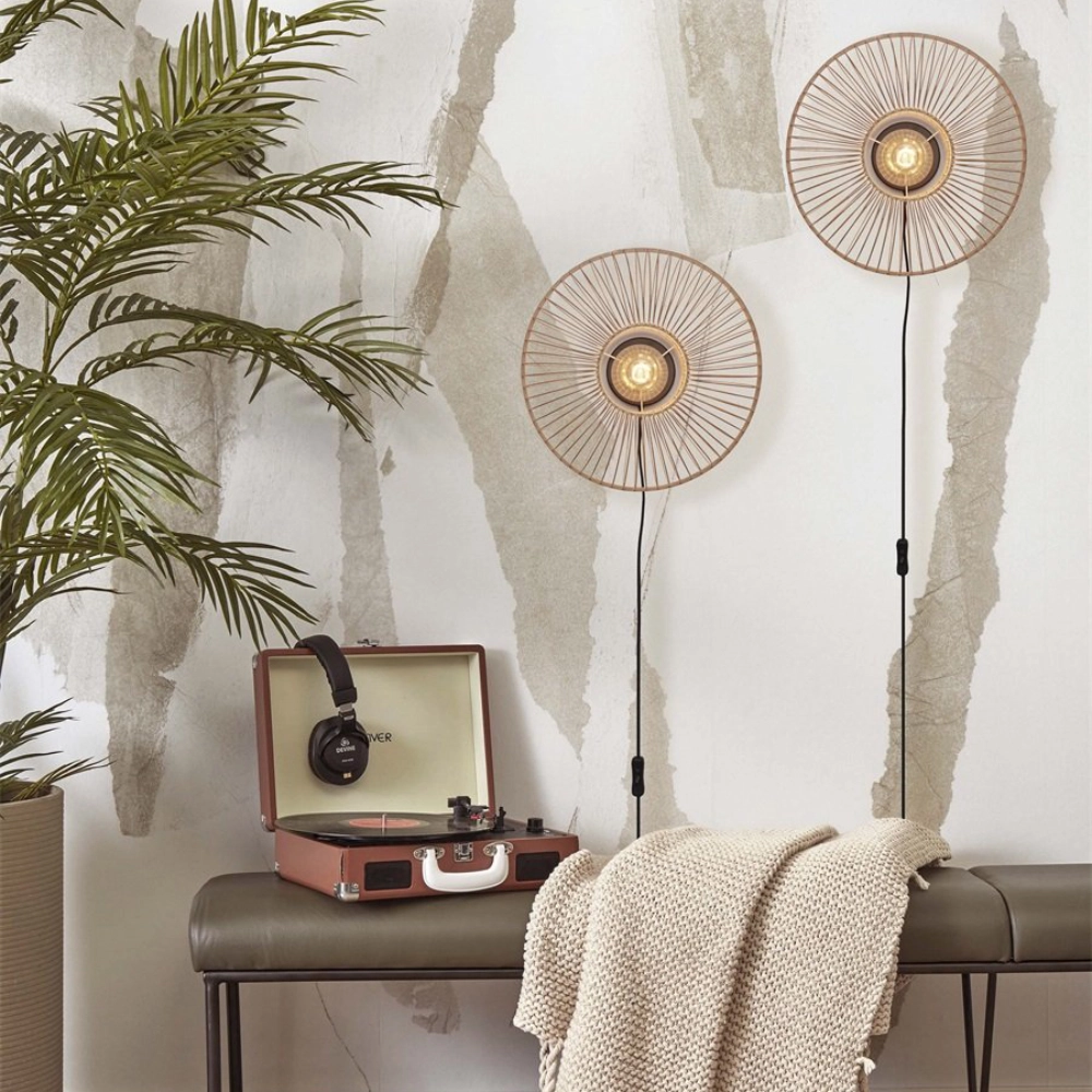 - O candeeiro de parede Hokkaido é feito à mão com bambu sustentável, num padrão radial que evoca o movimento do sol nascente e projeta efeitos de luz e sombra suaves na parede.