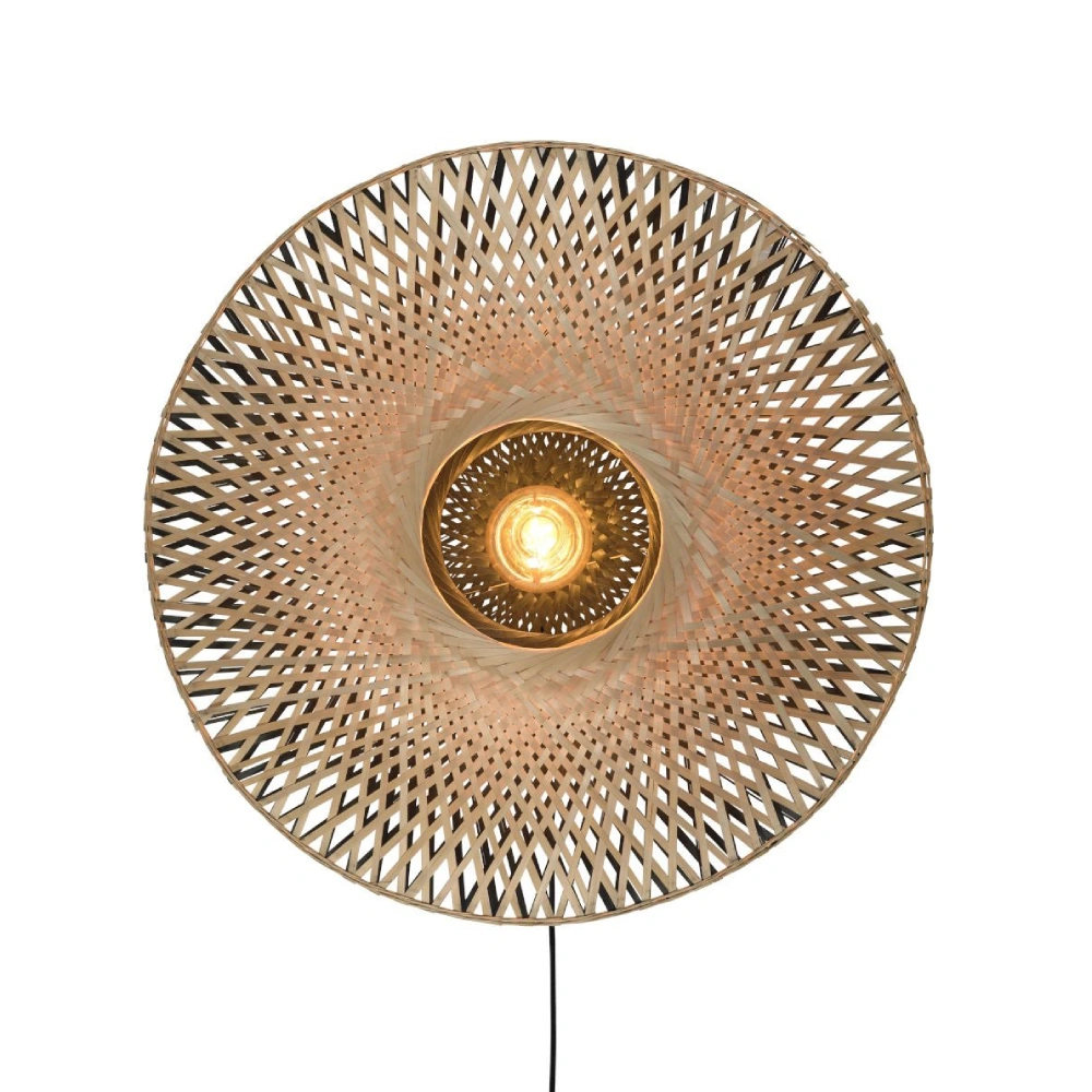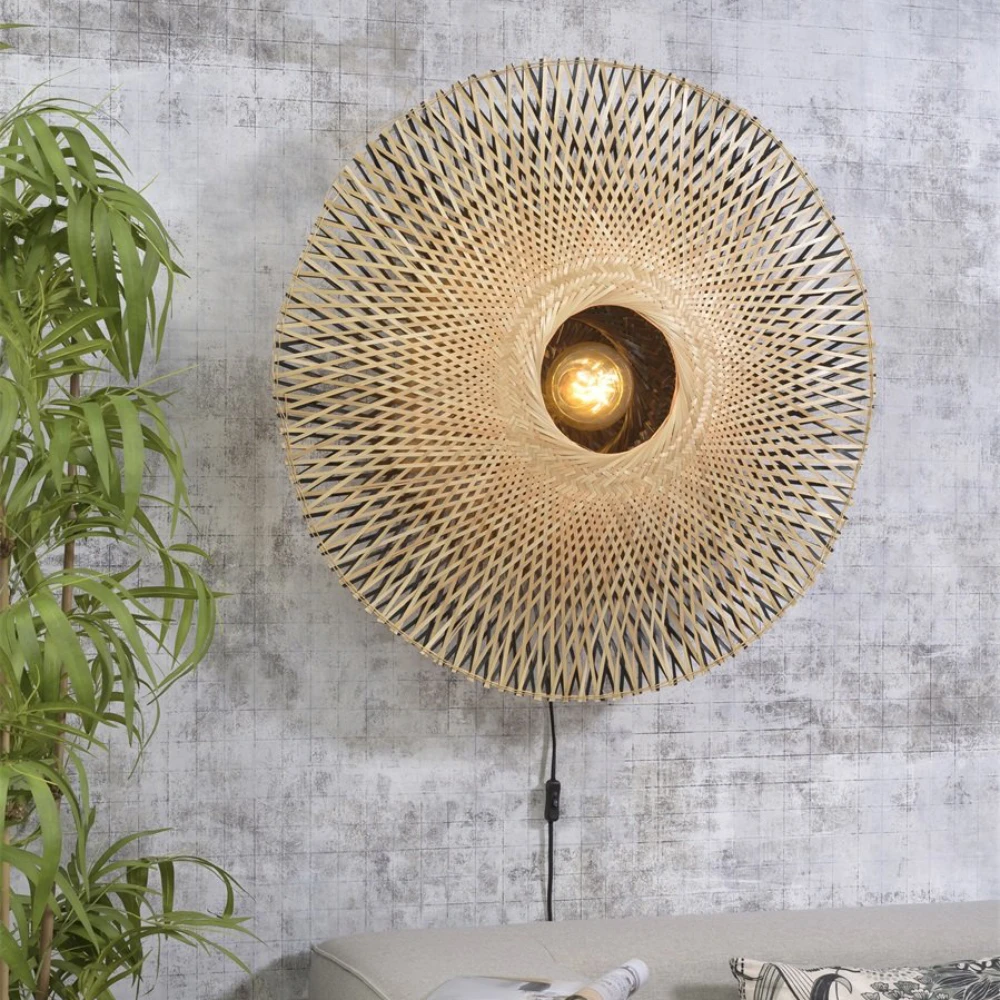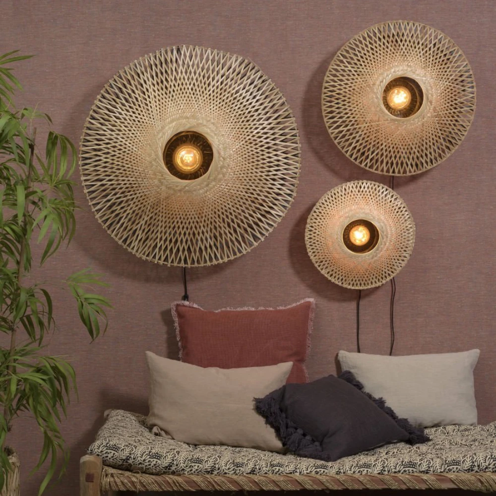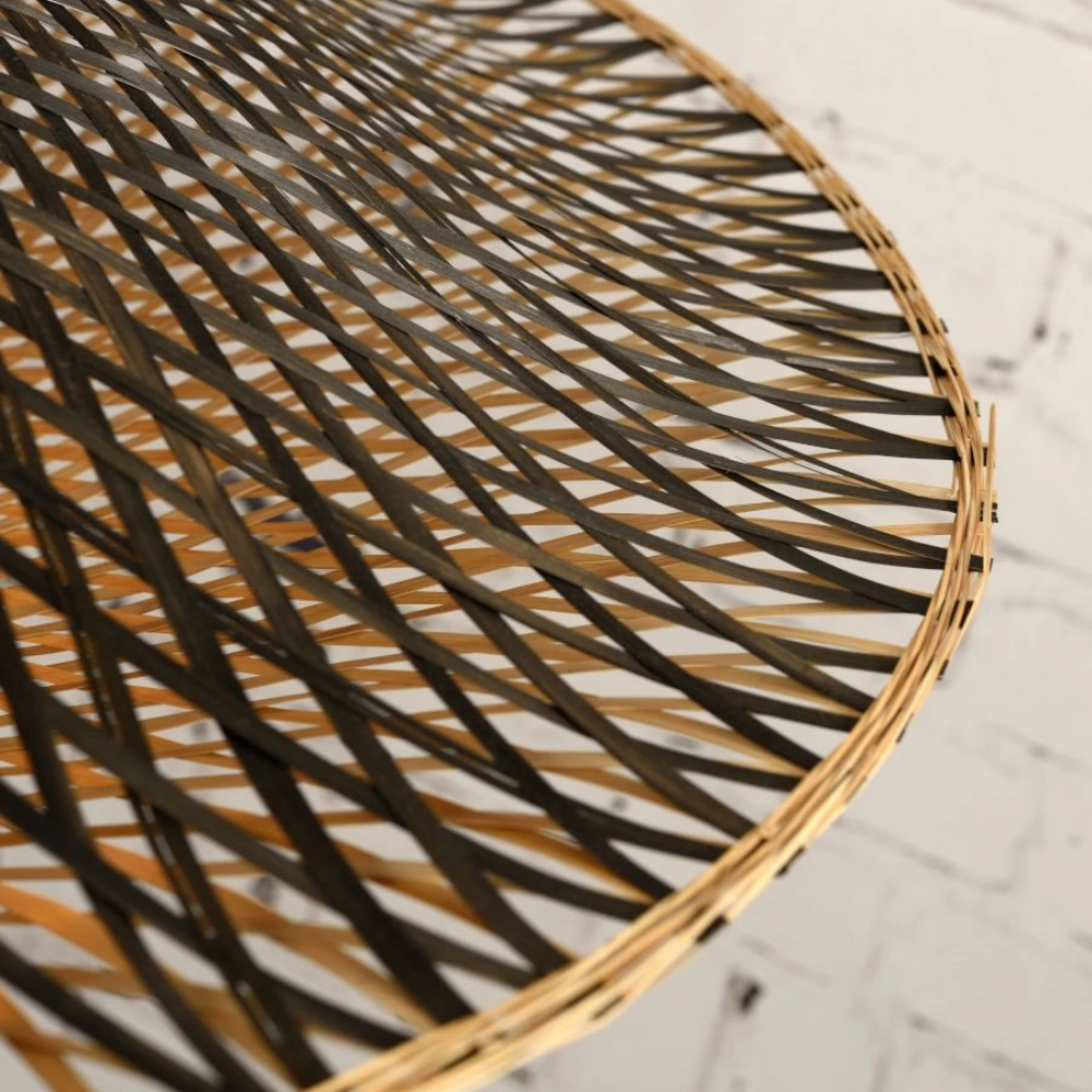 - O abajur exclusivo, feito de tiras de bambu, espalha a luz em todas as direções, criando uma atmosfera acolhedora e convidativa.