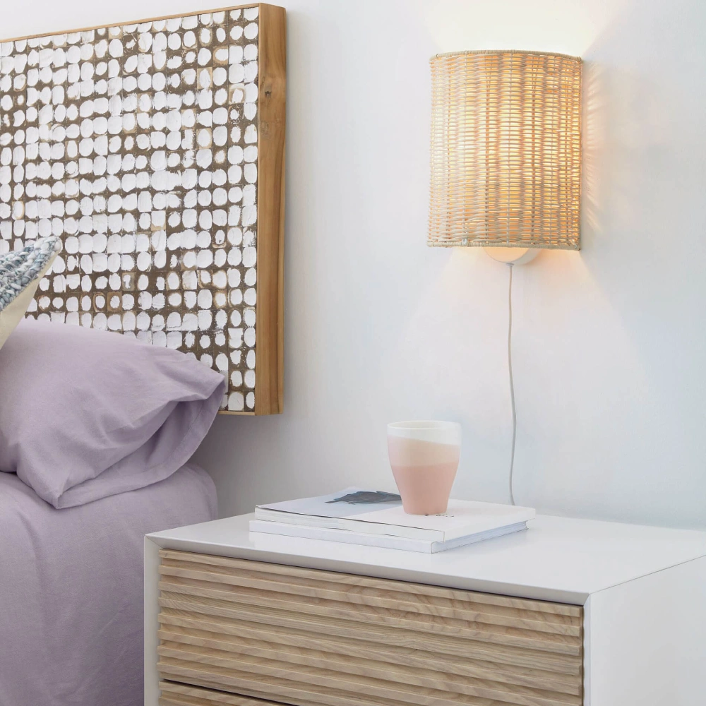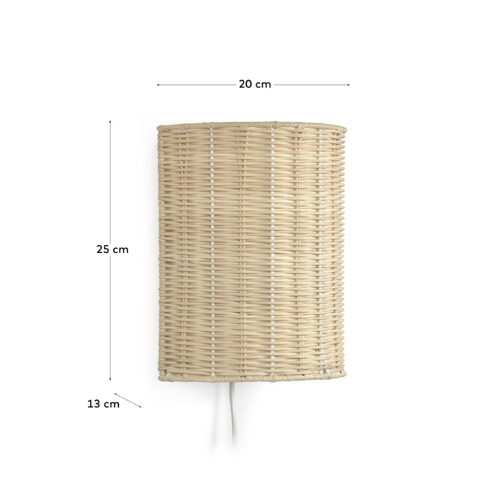 - O candeeiro de parede Kim é artesanalmente trançado em rattan natural, com estrutura leve e visual elegante.