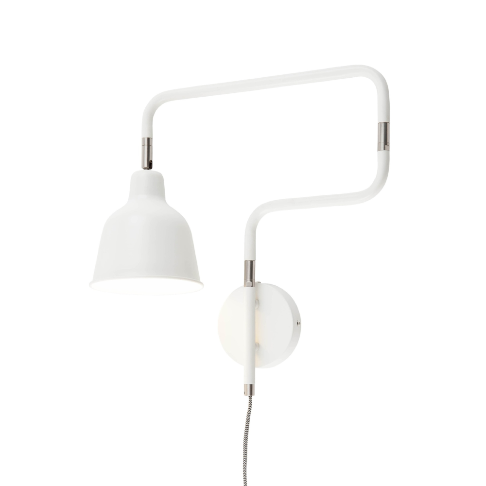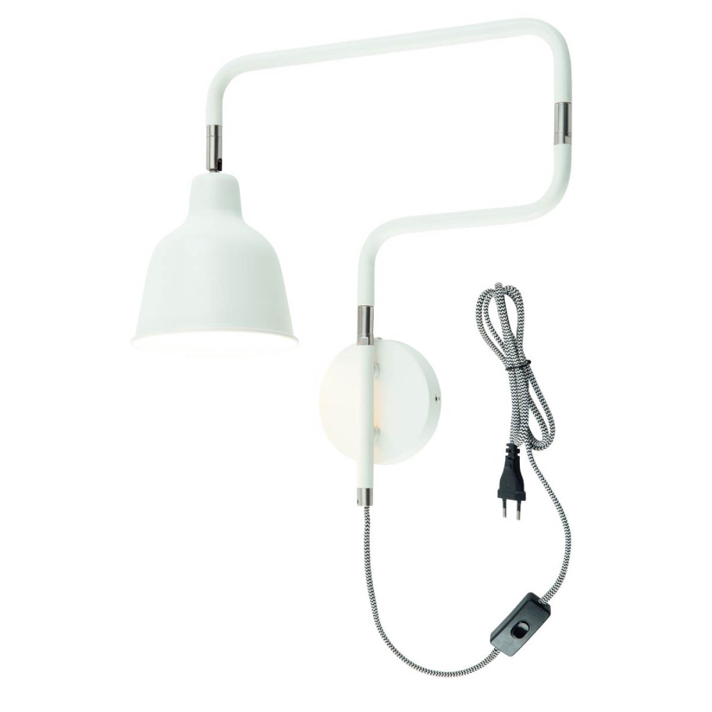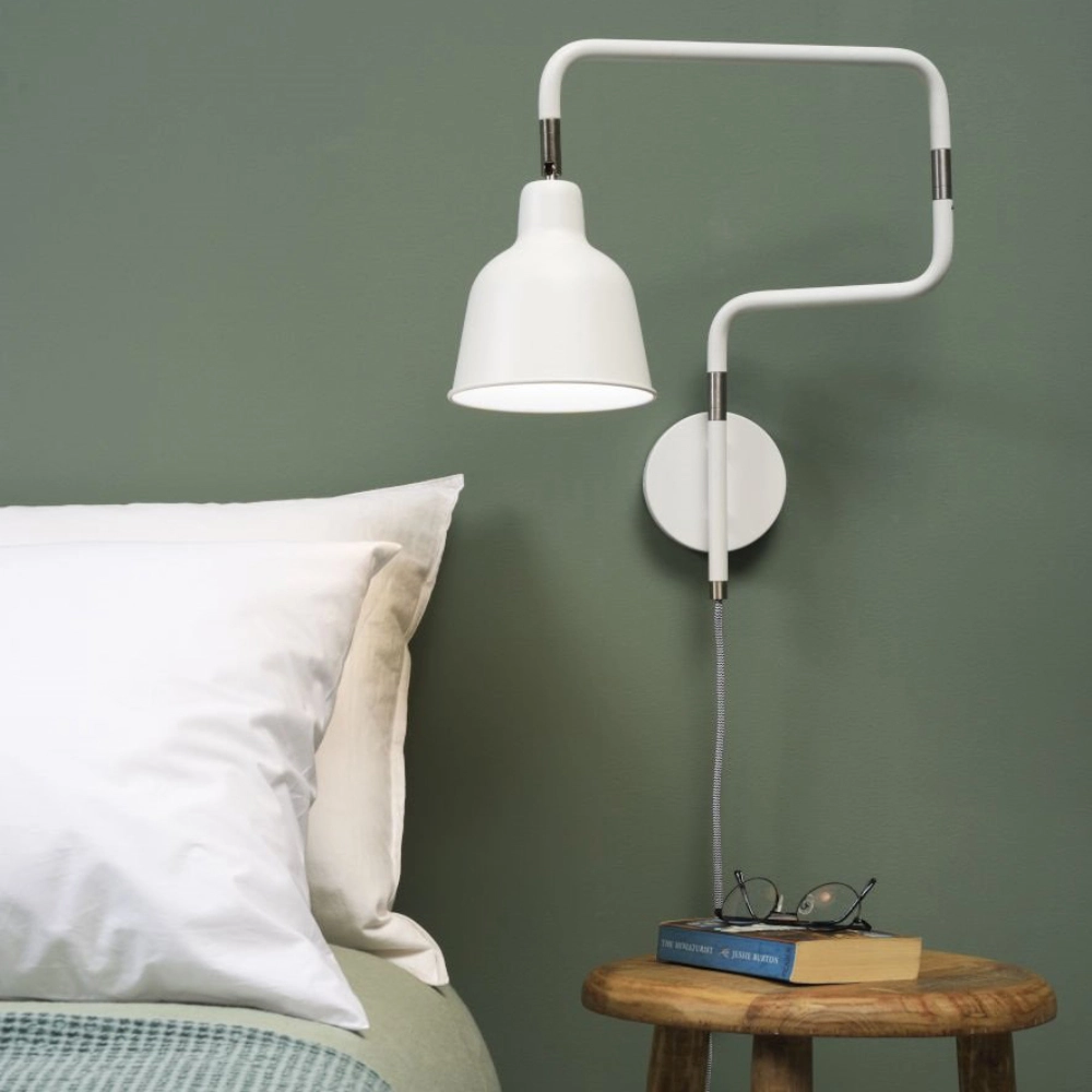 - O candeeiro de parede London da marca It’s About Romi, combina acabamento branco com braço articulado em metal, permitindo ajustar o foco da luz com facilidade.