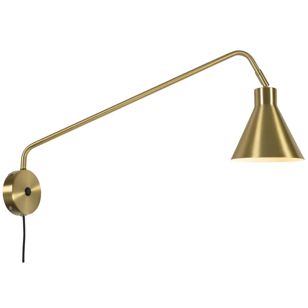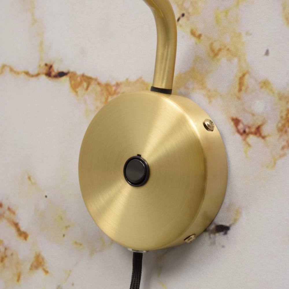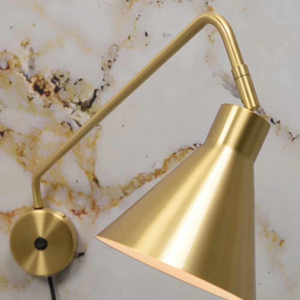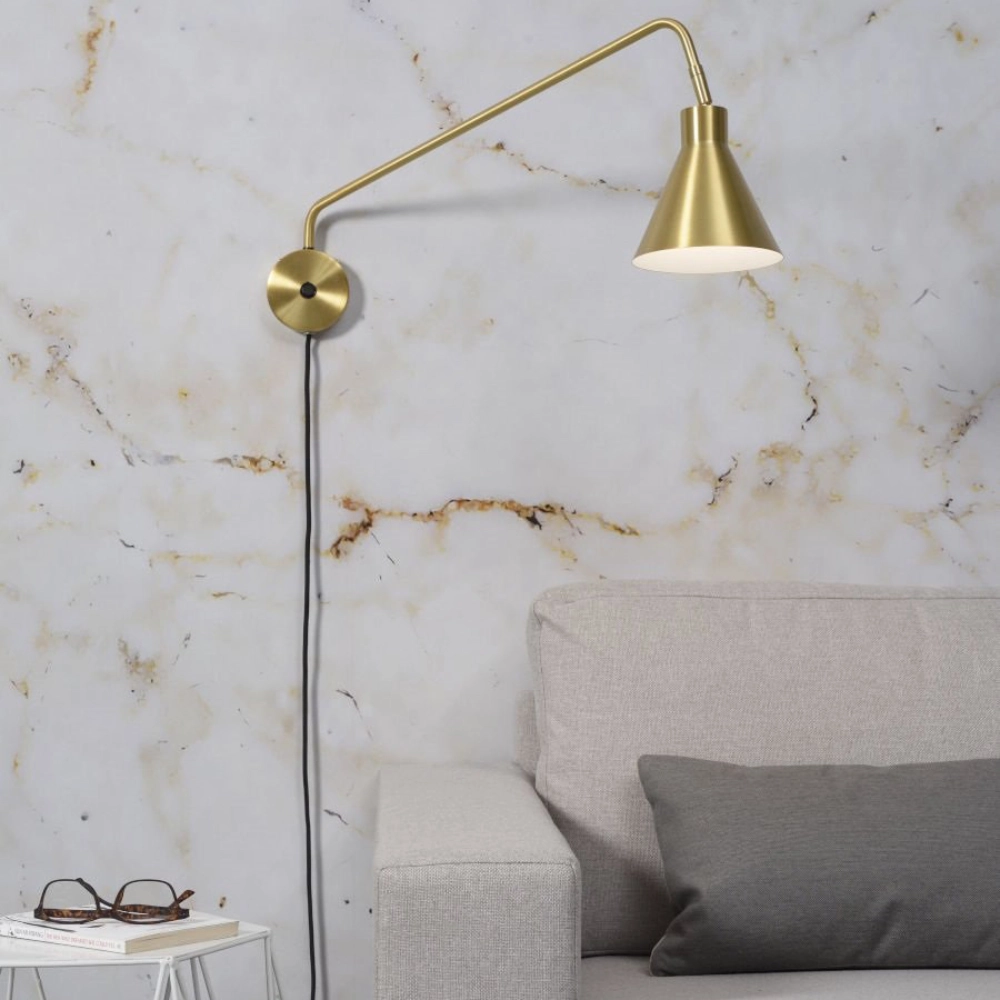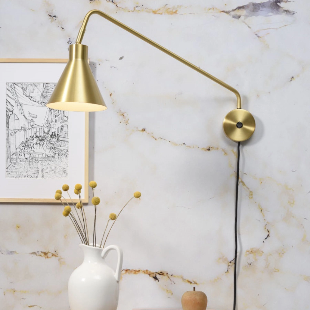- O candeeiro de parede Lyon da marca It’s About Romi, apresenta uma estrutura metálica em tom dourado com braço giratório e abajur articulado, permitindo direcionar a luz conforme necessário.