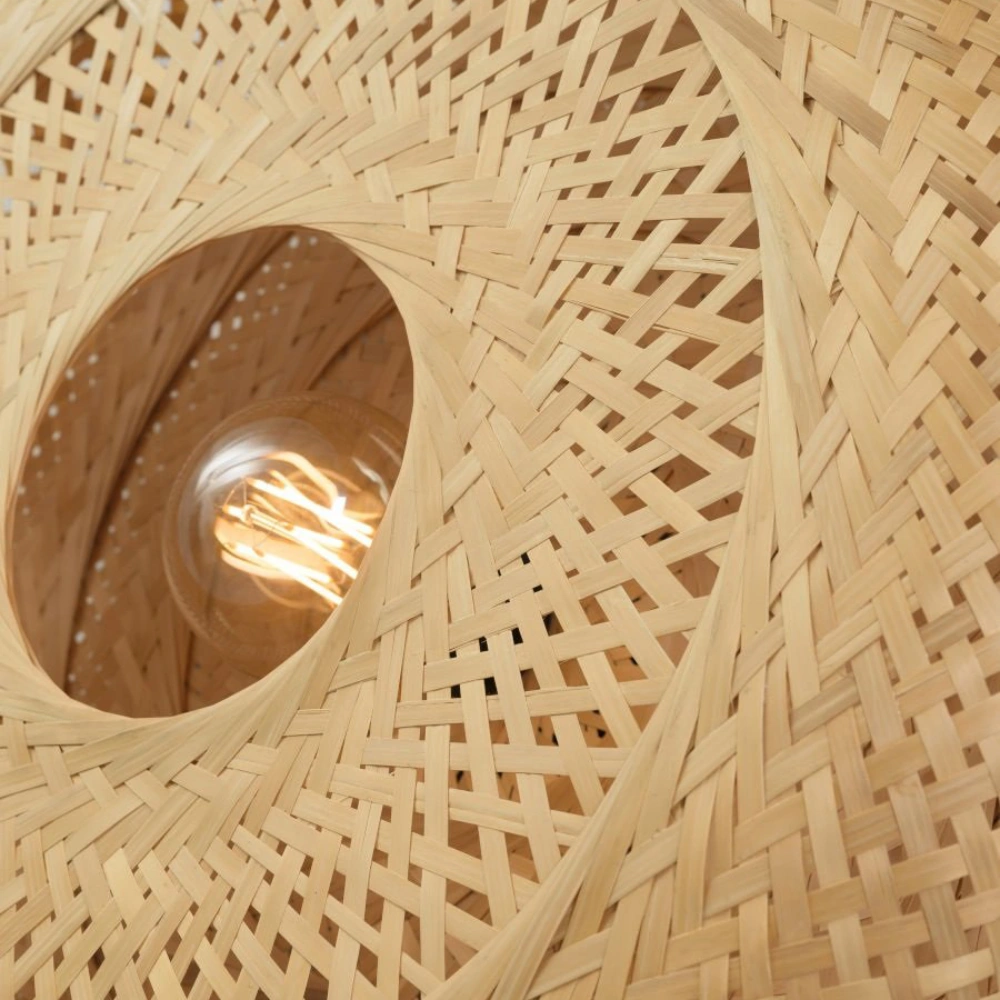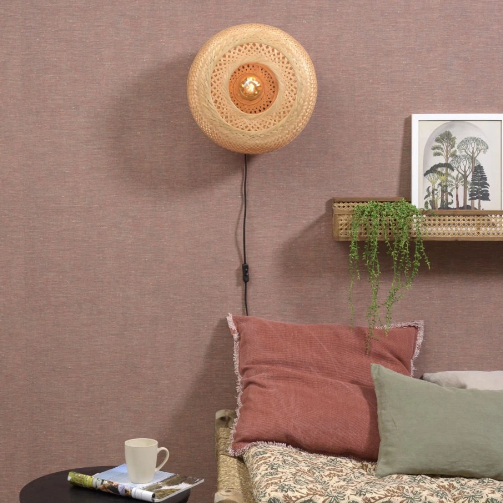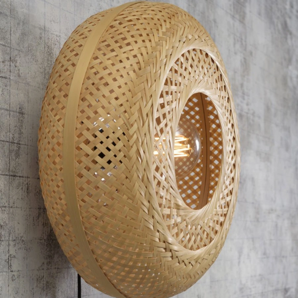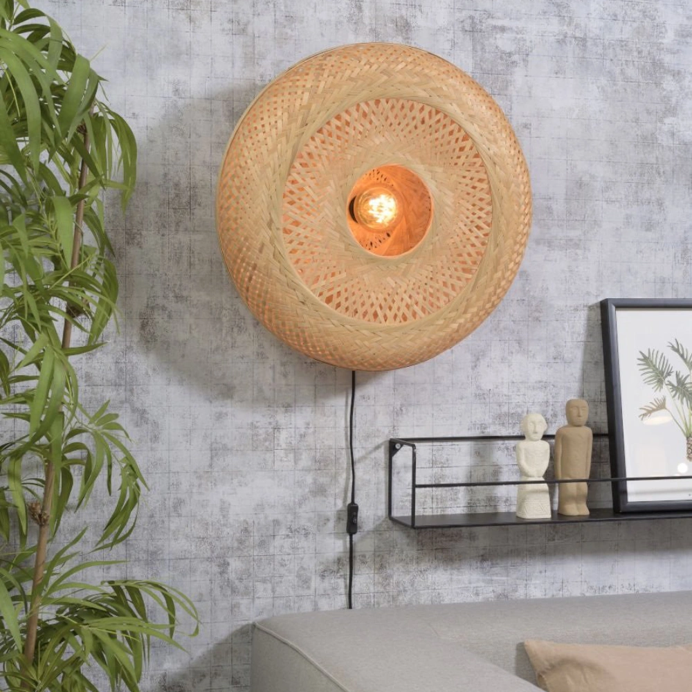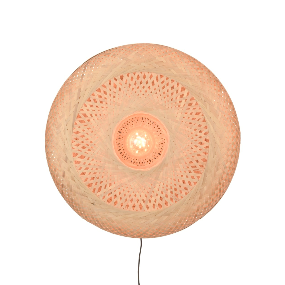 - Inspirado na textura dos cestos artesanais, o candeeiro de parede Palawan é feito à mão em bambu natural com um trançado circular que projeta uma luz suave em padrões geométricos.