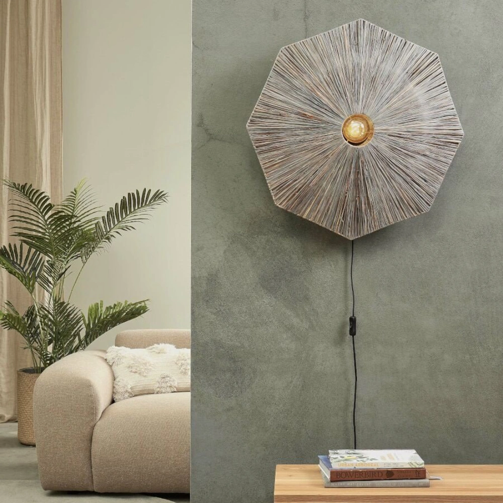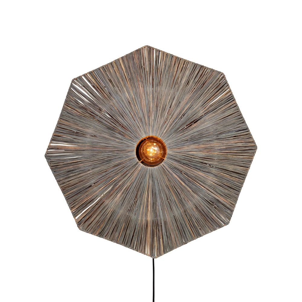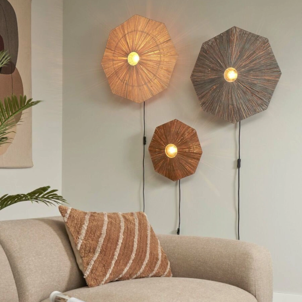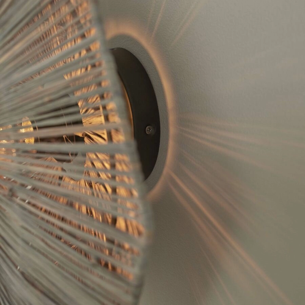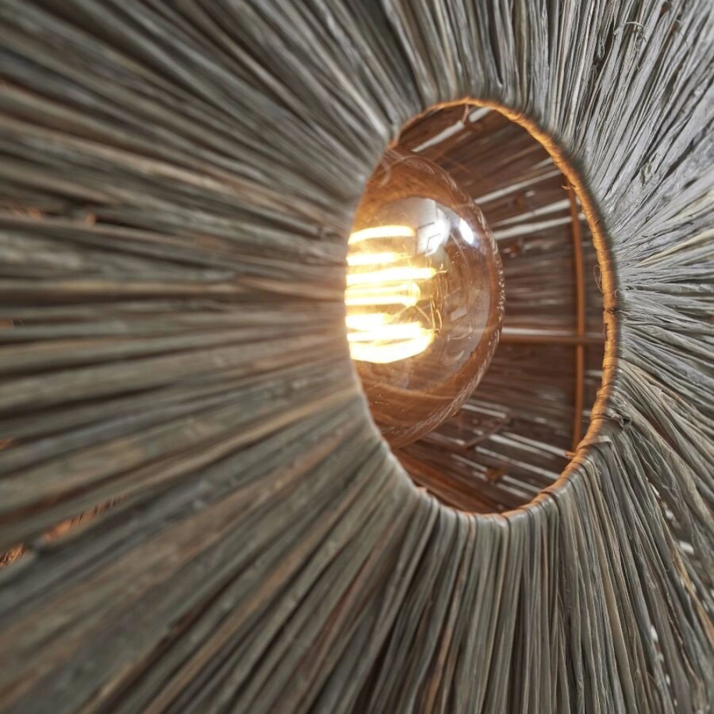 - O candeeiro de parede Panamá é feito à mão em rafia natural, com um padrão circular que transmite um efeito texturado na parede.
