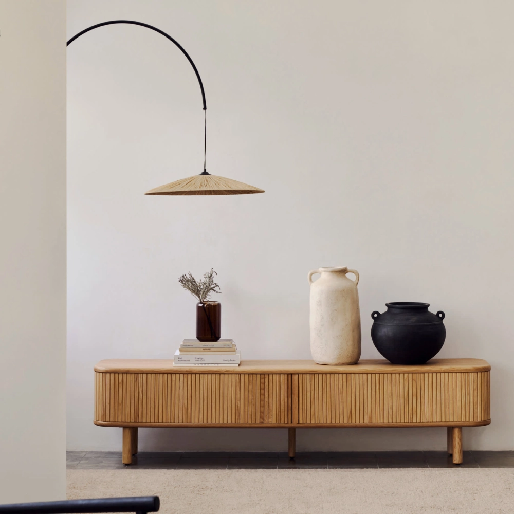 - O candeeiro de parede Rosel é trançado à mão em ráfia natural, com estrutura que permite girar o abajur para direcionar a luz conforme preferir.