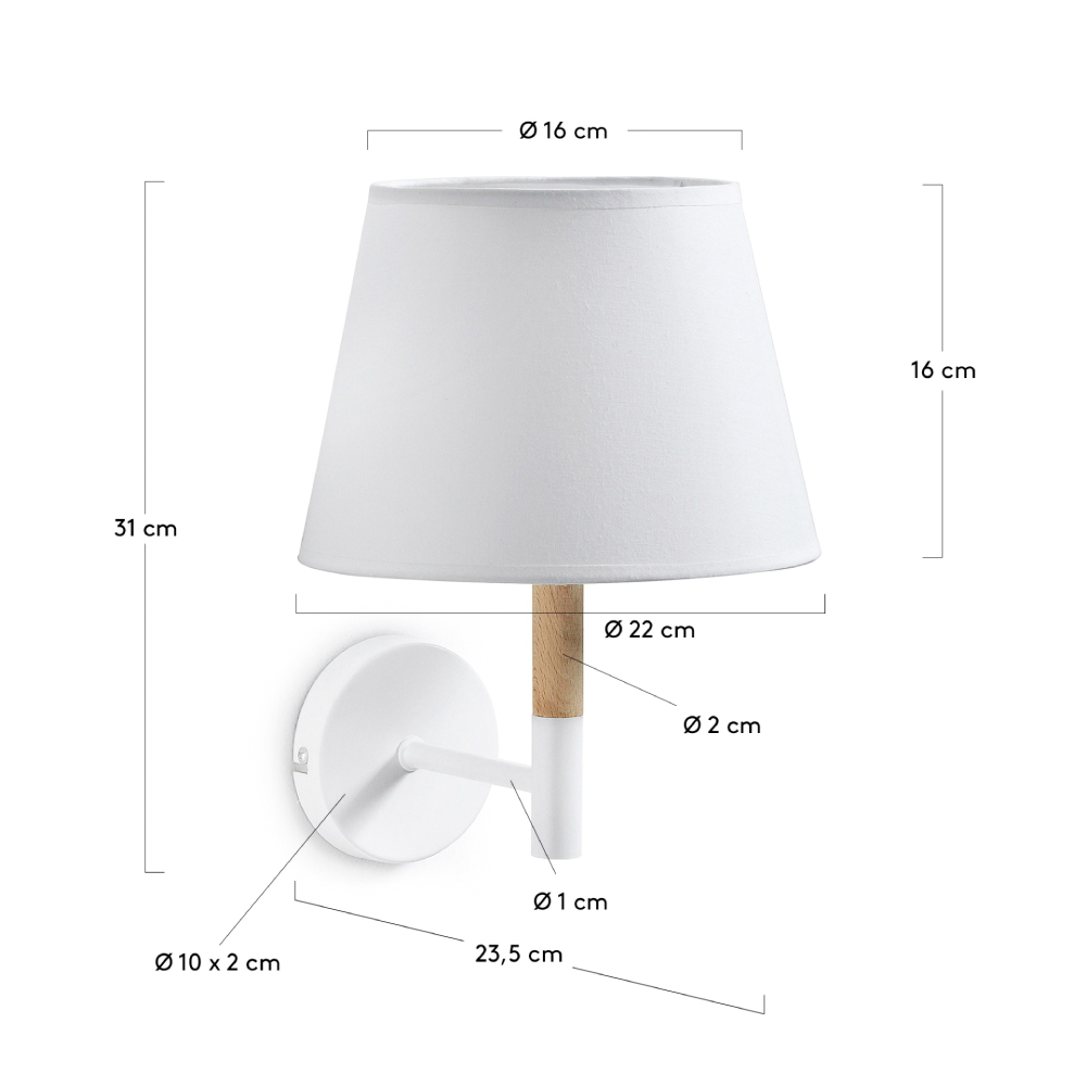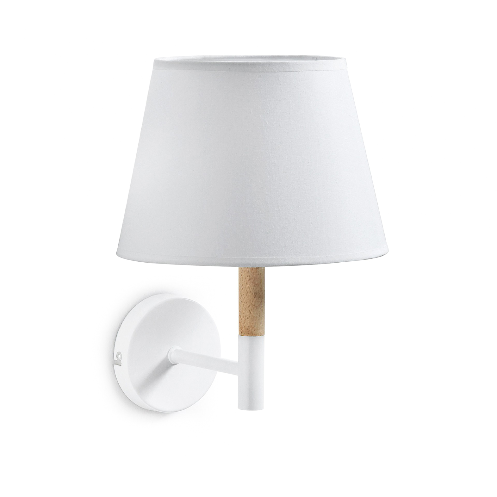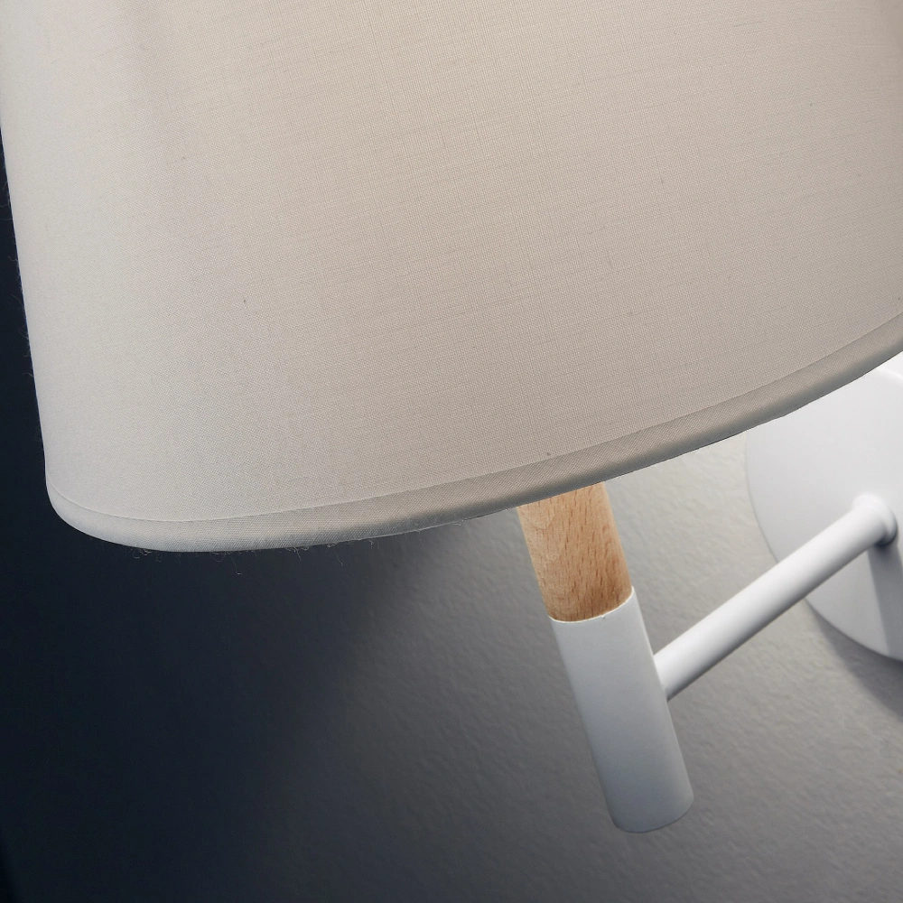 - O candeeiro de parede Olsen combina braço em metal branco com detalhe em madeira natural e abajur em algodão, criando uma estética leve e moderna.