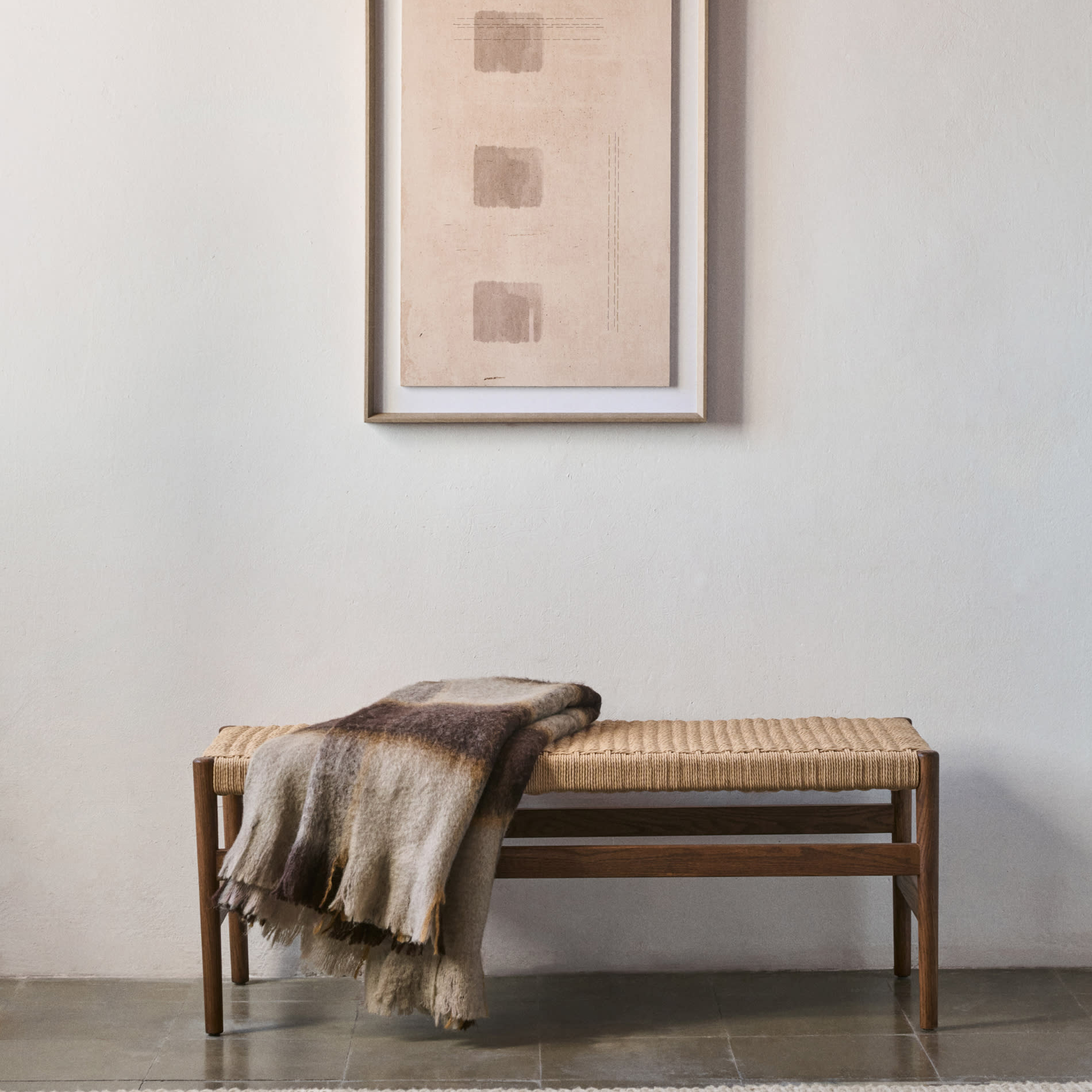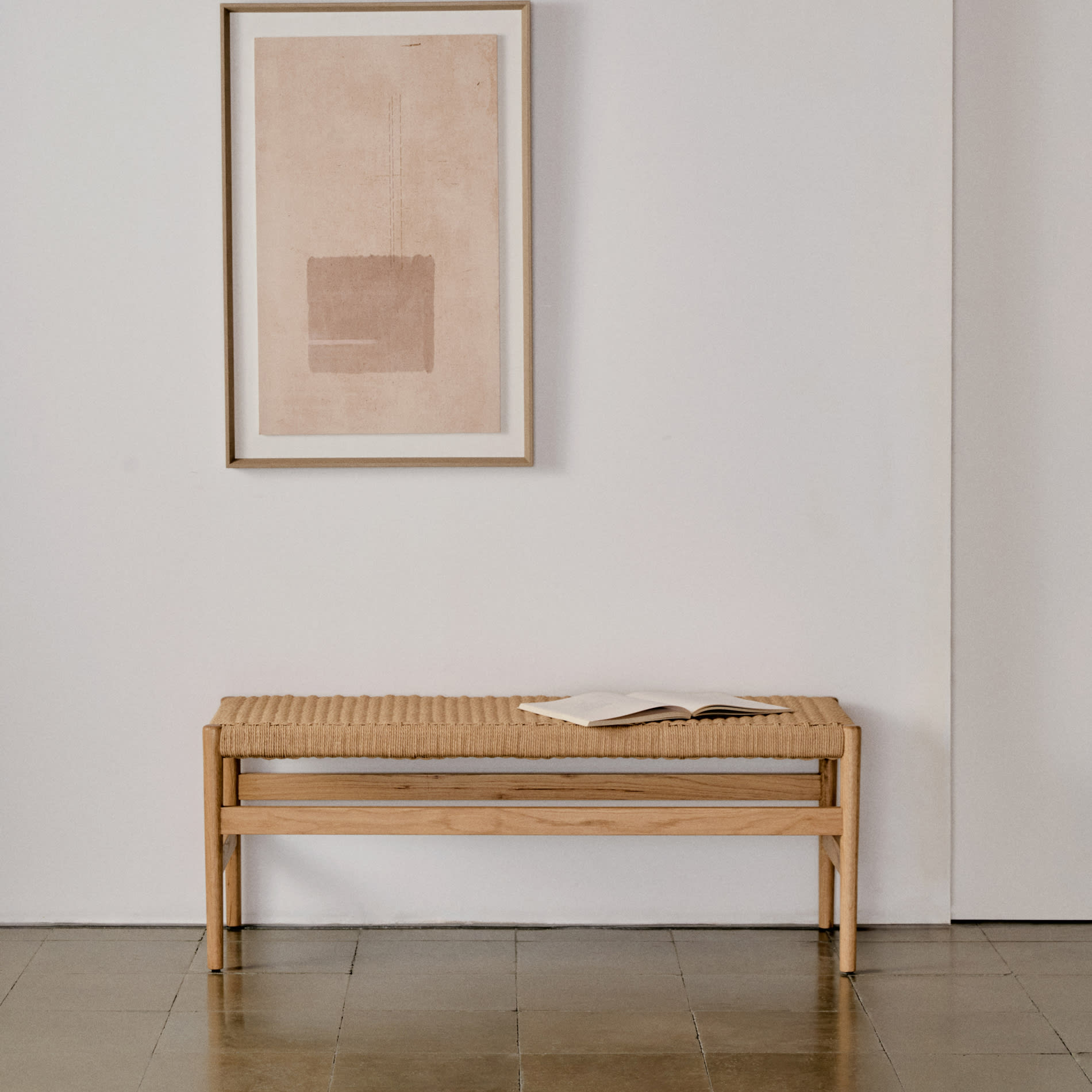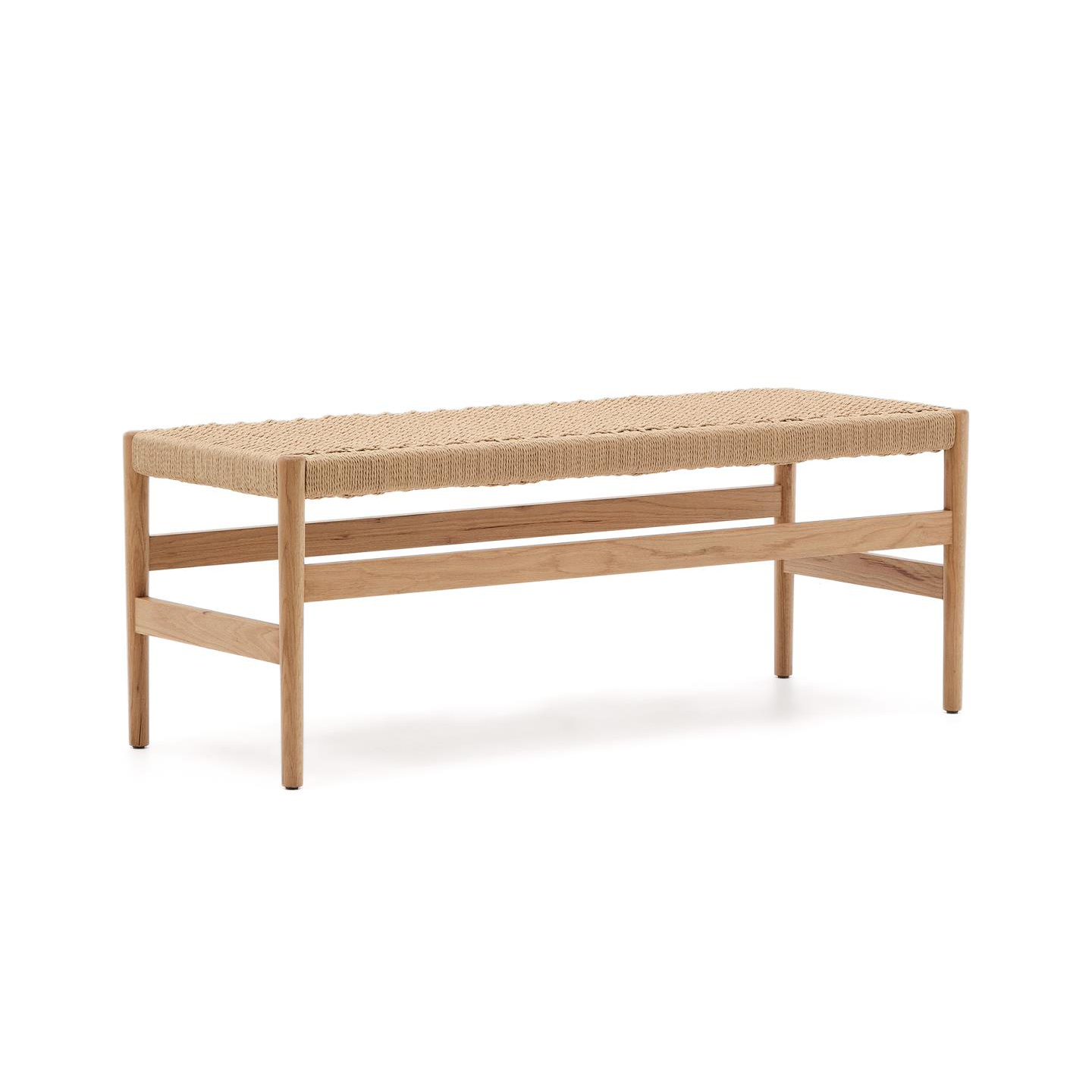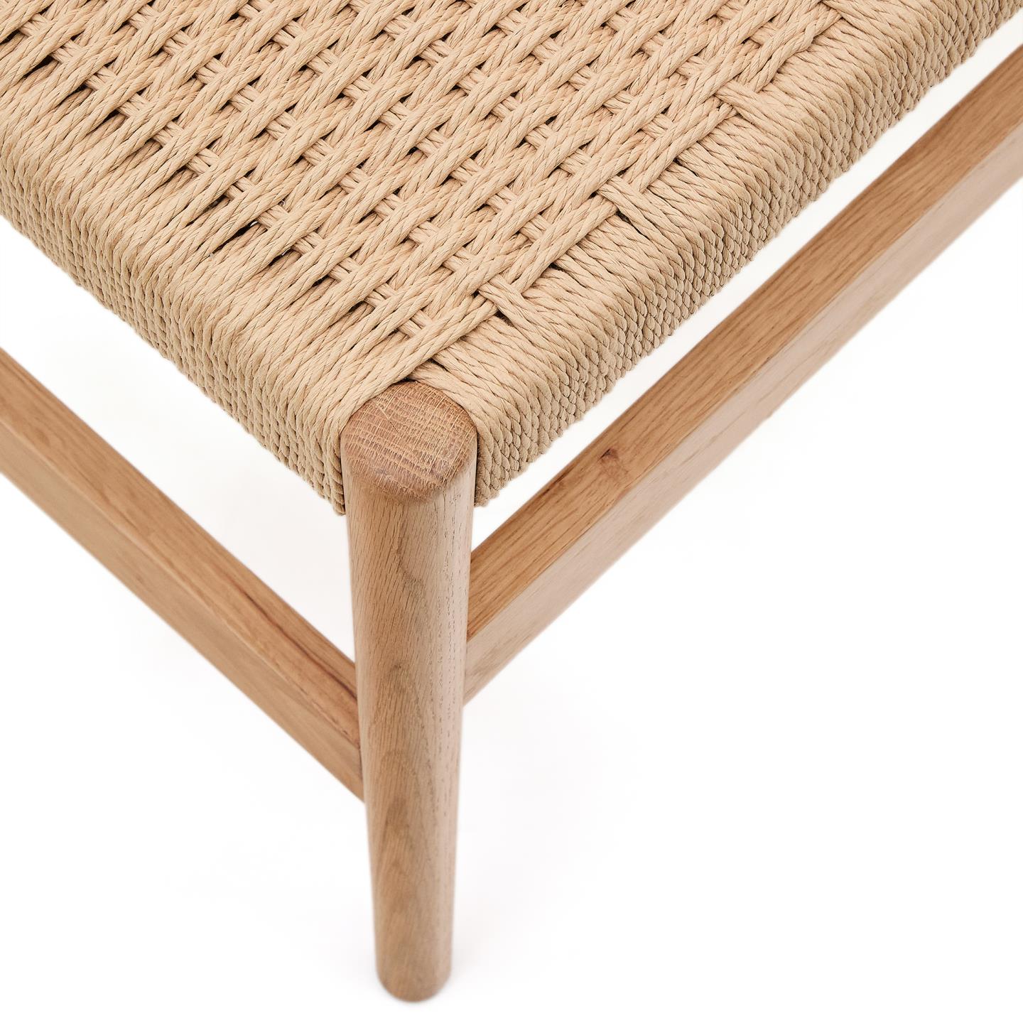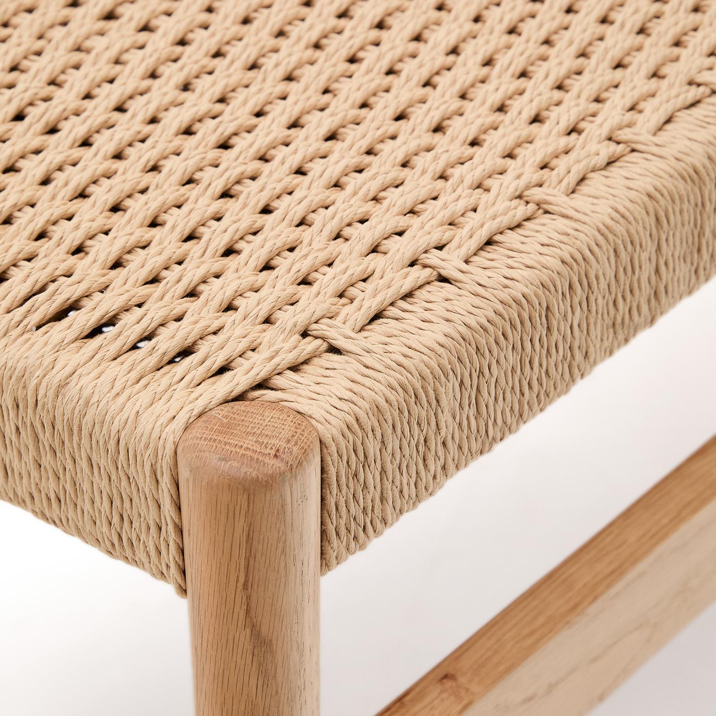 - O banco de apoio Zaida tem um design artesanal com estrutura em madeira maciça de carvalho e assento em corda de papel trançada à mão.