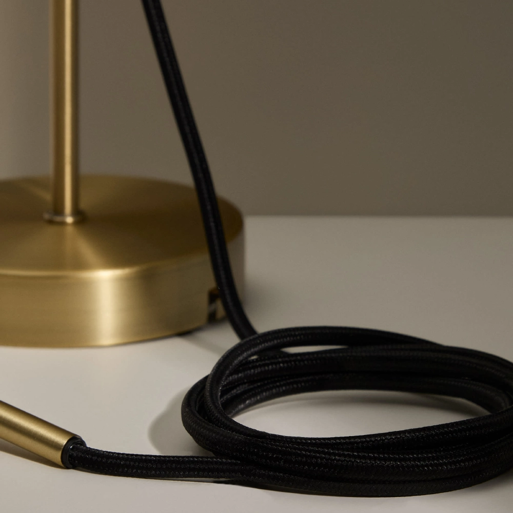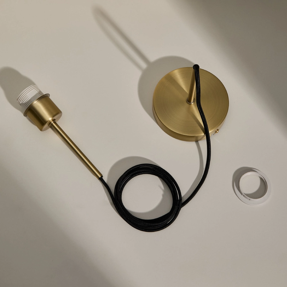 - Kit completo para suspensão de candeeiros, composto por cabo preto de 1,5 m revestido em tecido e casquilho metálico dourado.