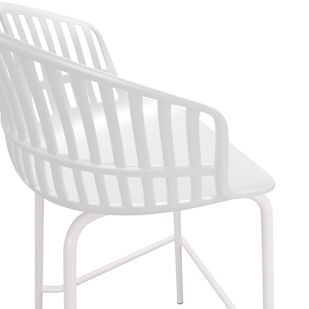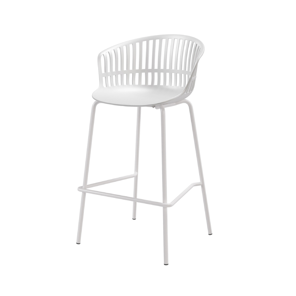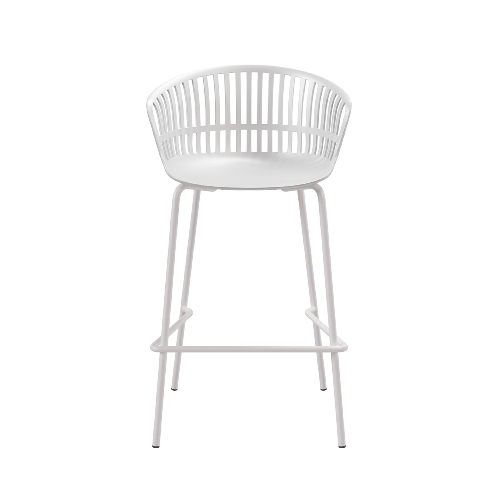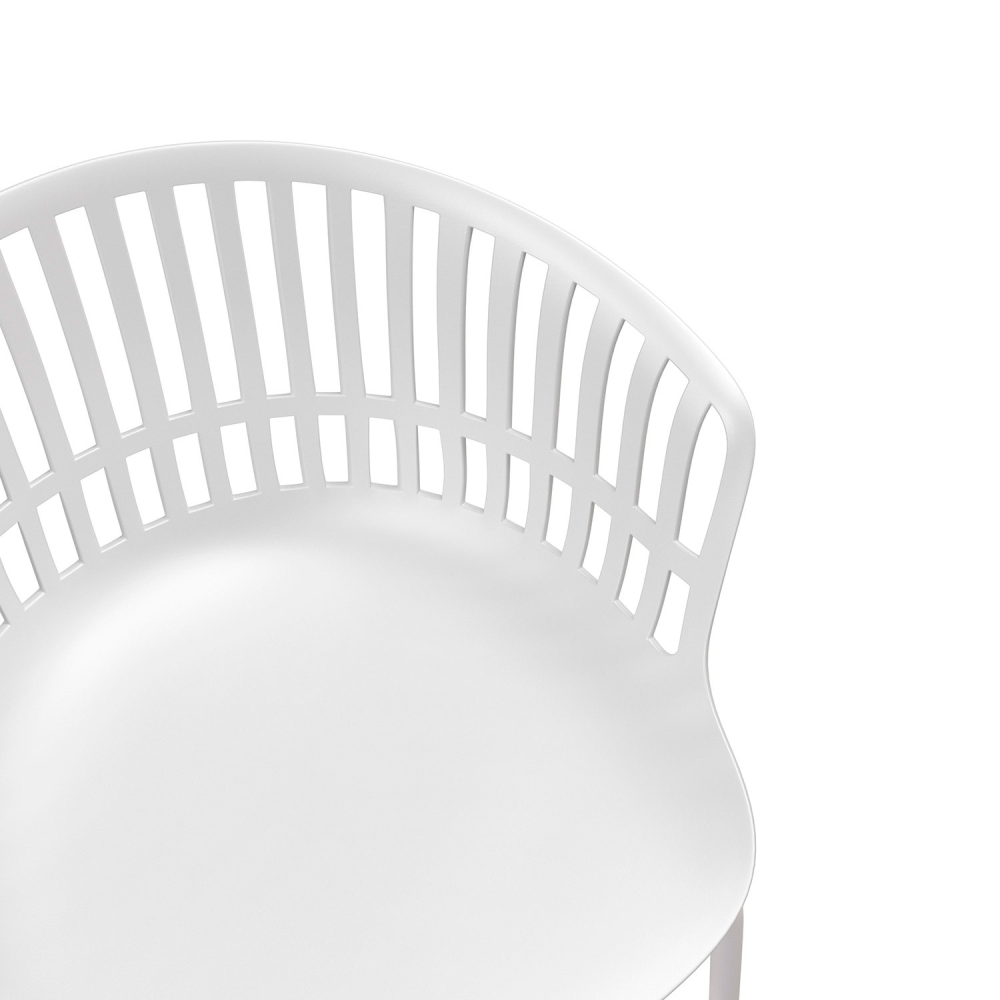 - Fabricada em polipropileno branco e com pernas em metal reforçadas, destaca-se pela durabilidade e estabilidade graças ao assento e encosto integrados numa única peça.