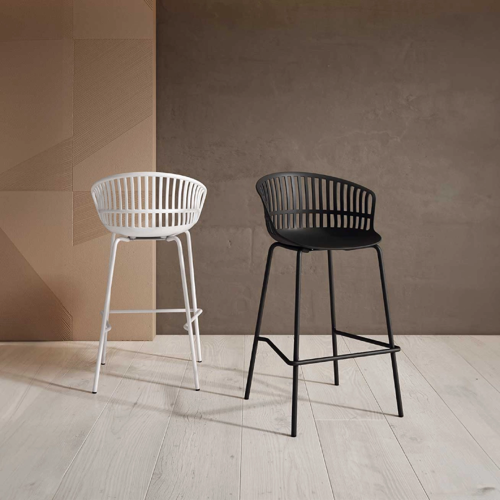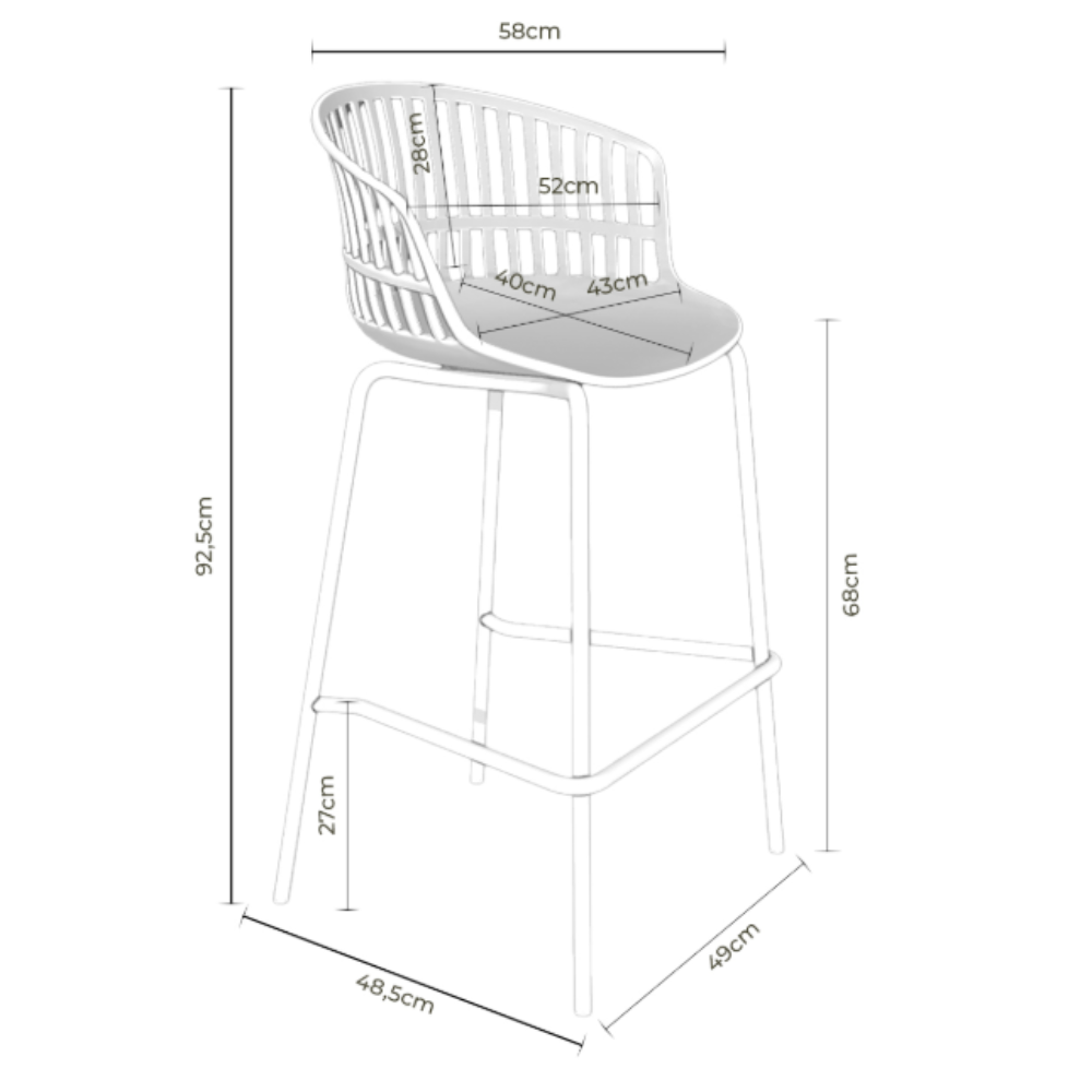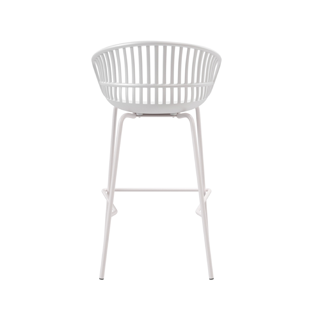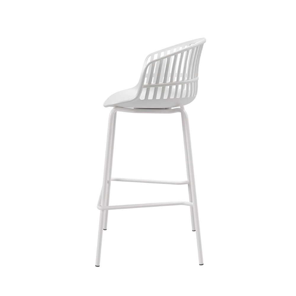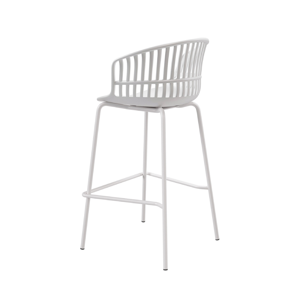- Fabricada em polipropileno branco e com pernas em metal reforçadas, destaca-se pela durabilidade e estabilidade graças ao assento e encosto integrados numa única peça.