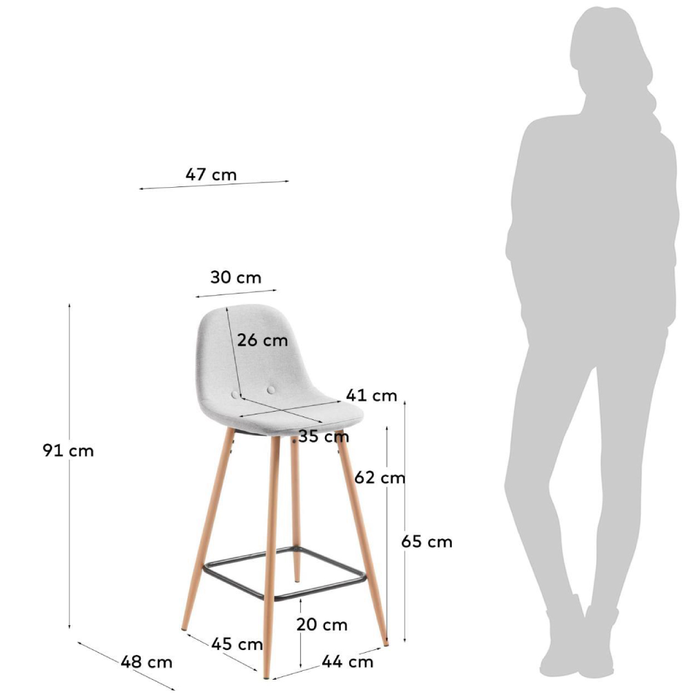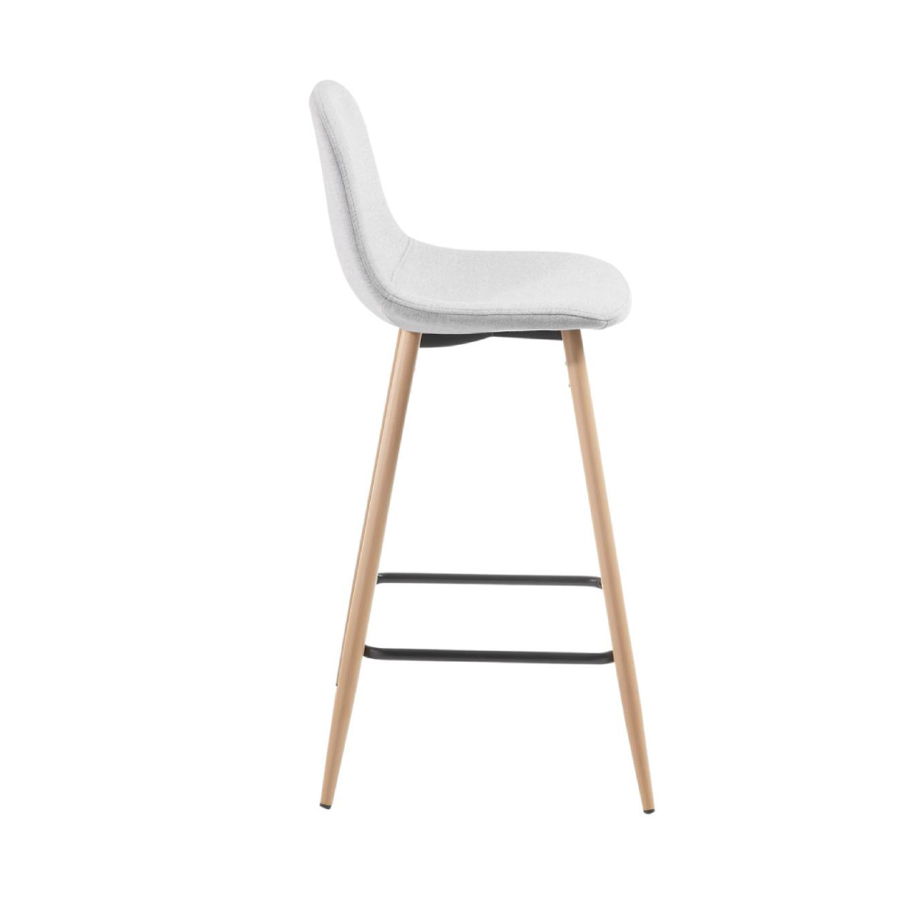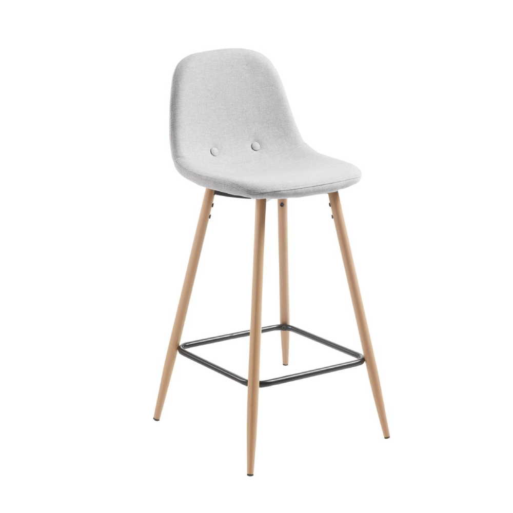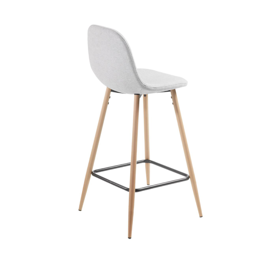 - O assento estofado em tecido cinza claro oferece ergonomia e um toque suave, enquanto as pernas em metal com efeito madeira acrescentam estabilidade e elegância discreta.