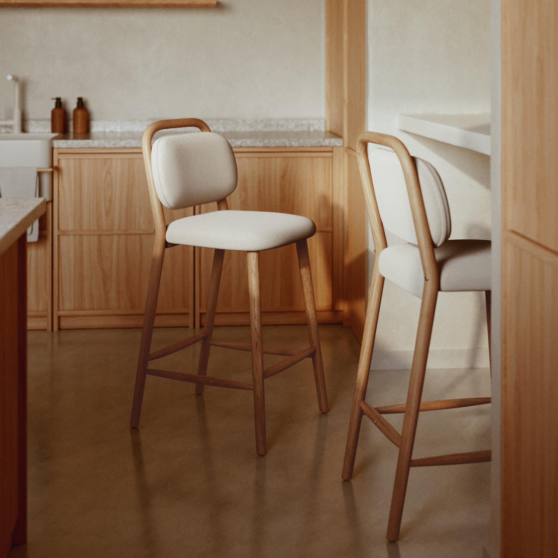 - A cadeira de bar Heldan é uma peça artesanal desenvolvida em madeira, aplicando a técnica da curvatura ao vapor.