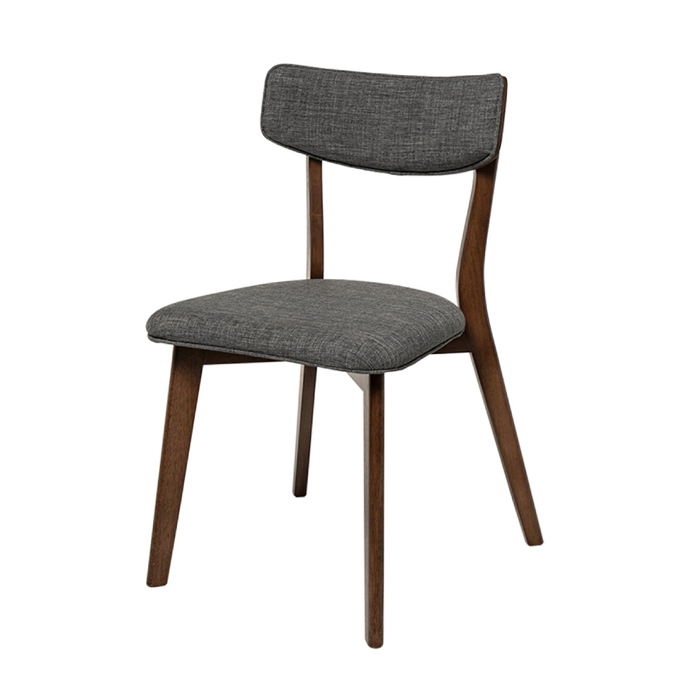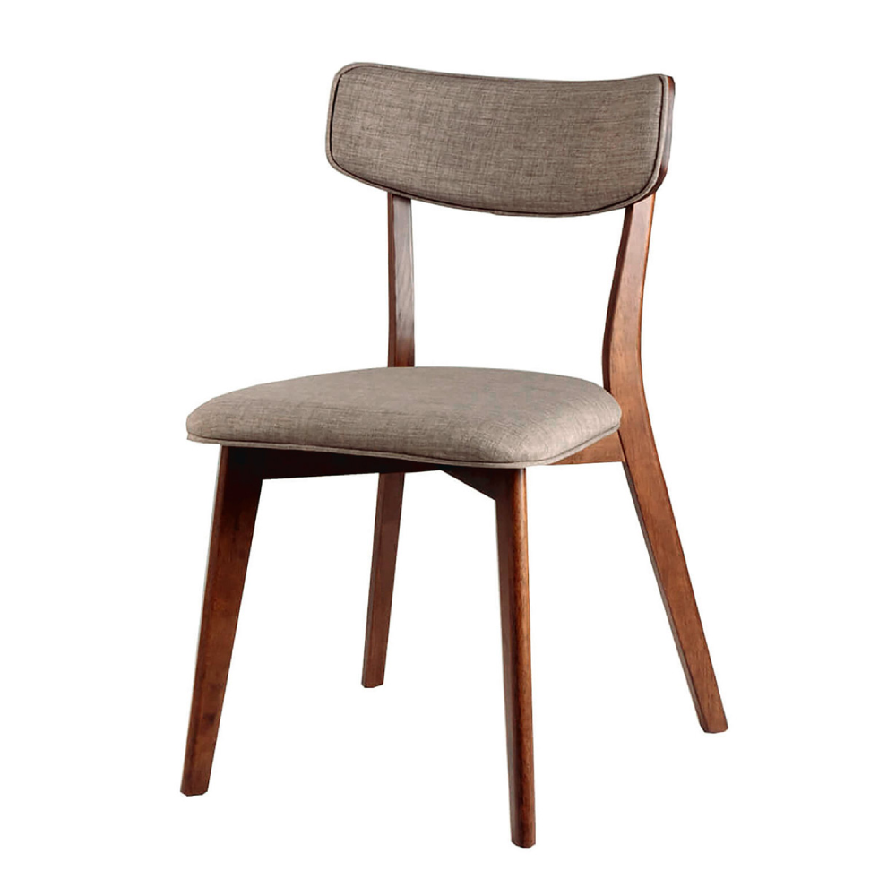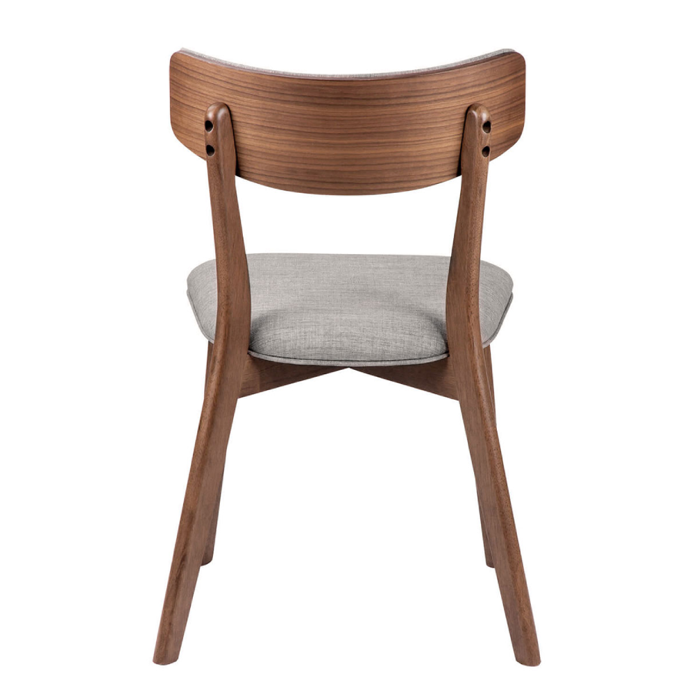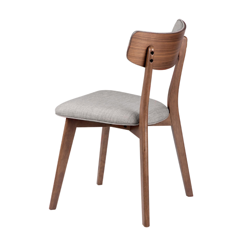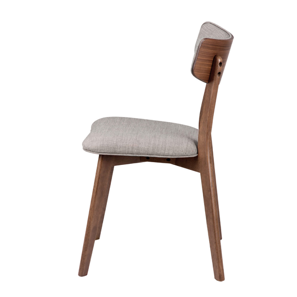 - O encosto curvo e estilizado em folheado de nogueira confere-lhe um toque sofisticado, enquanto o assento estofado em tecido poliéster garante comodidade nas refeições.