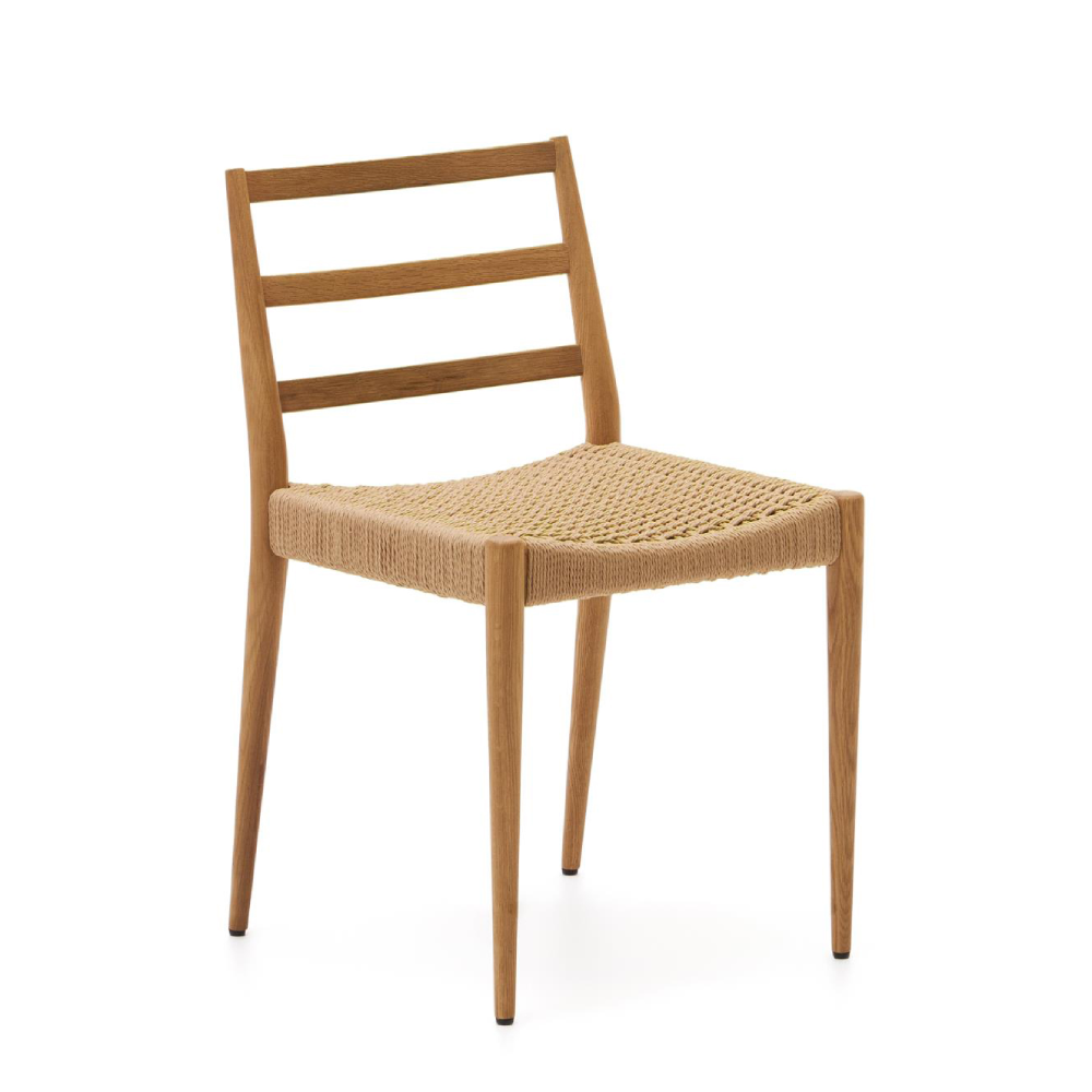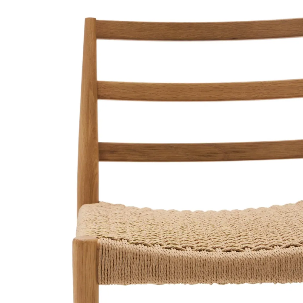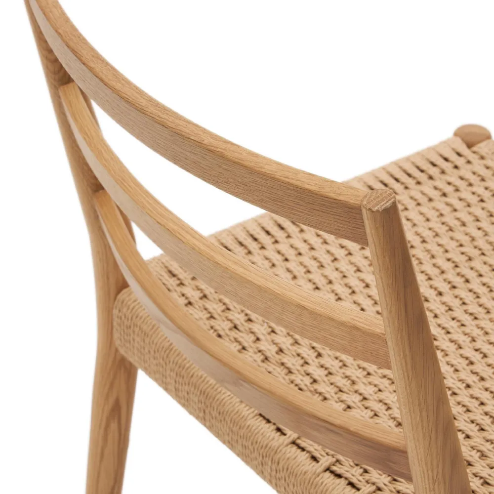 - A cadeira Anilla une o charme natural da madeira maciça de carvalho ao detalhe artesanal do assento em corda de papel entrançada à mão.