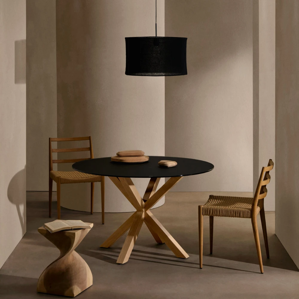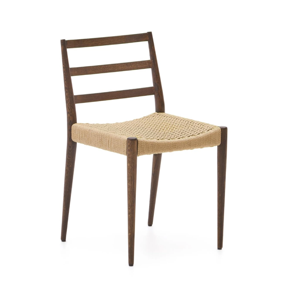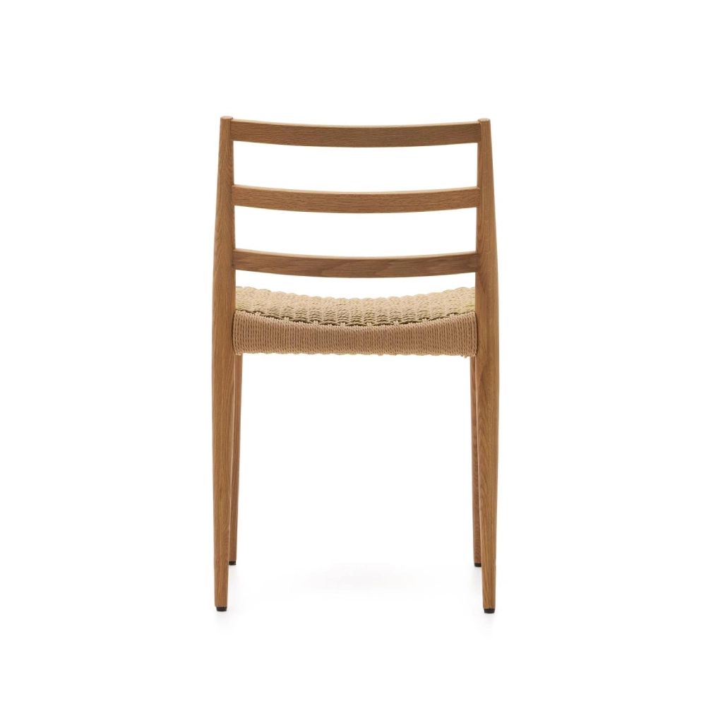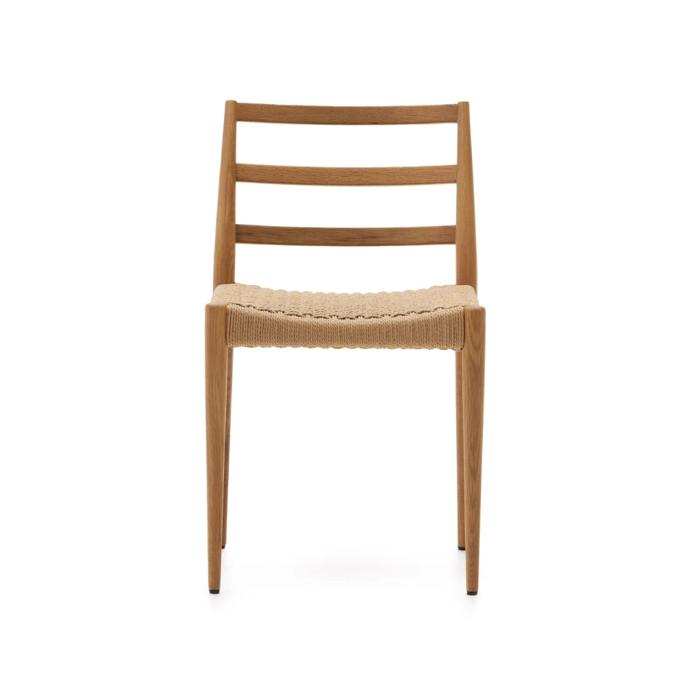 - A cadeira Anilla une o charme natural da madeira maciça de carvalho ao detalhe artesanal do assento em corda de papel entrançada à mão.