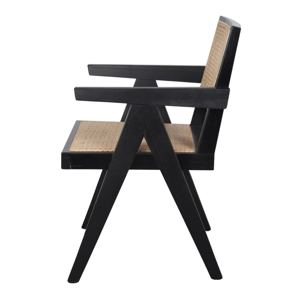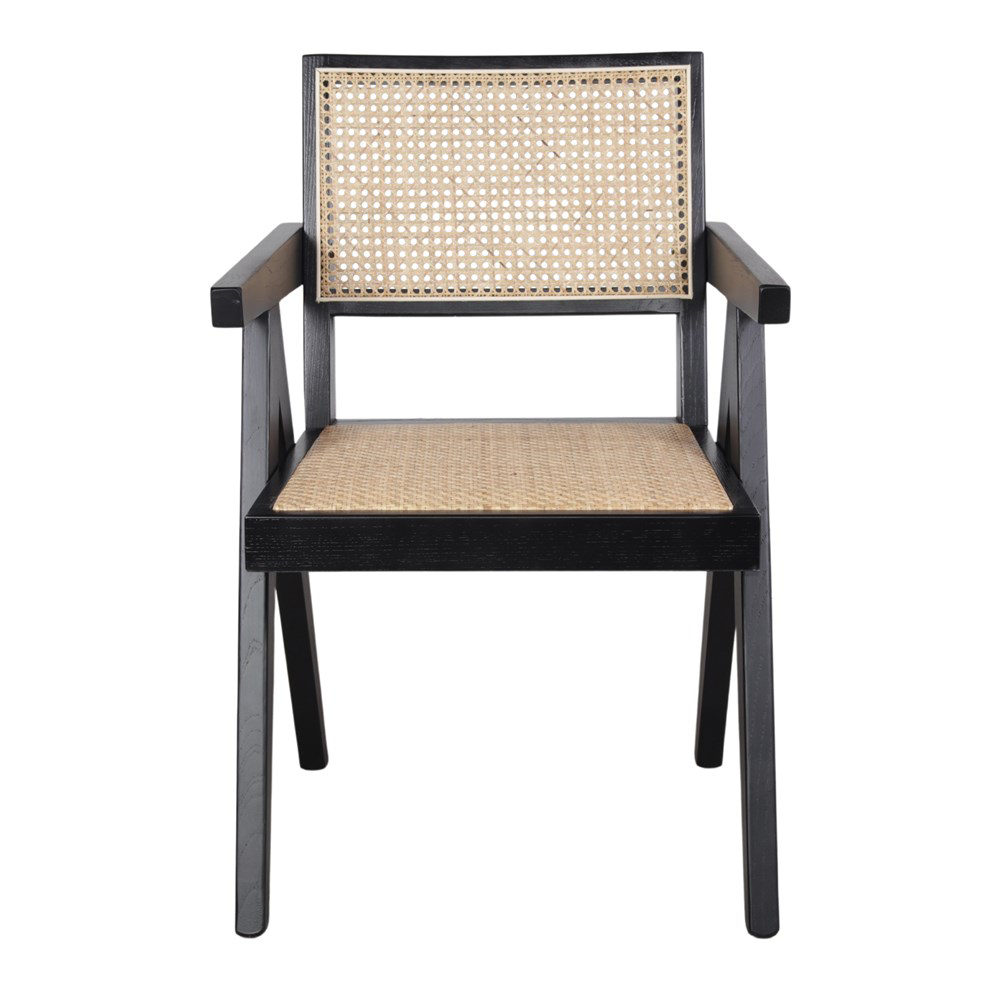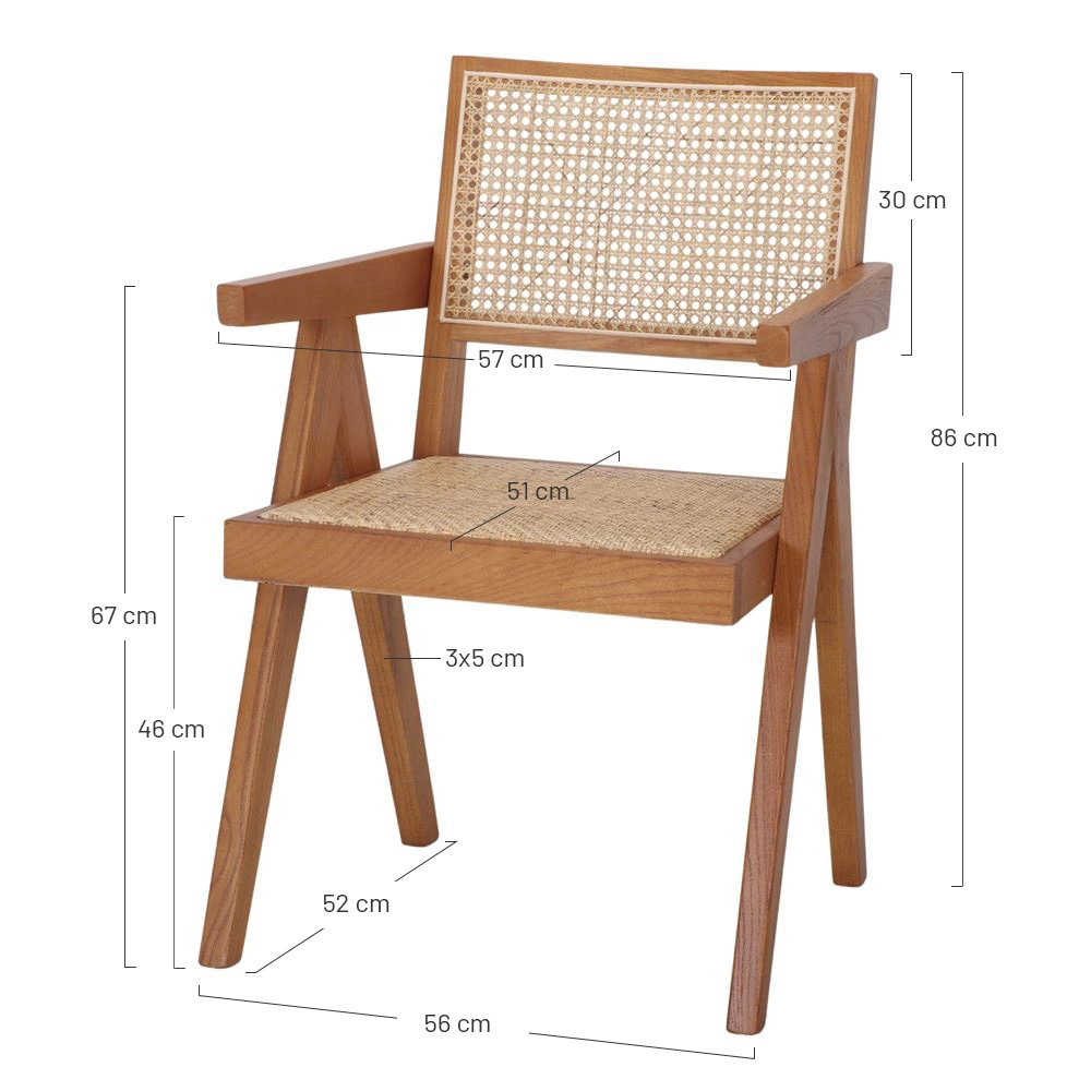 - Produzida em madeira maciça de olmo com acabamento preto, encosto e assento em fibras de rattan entrançadas que oferece elegância e durabilidade.