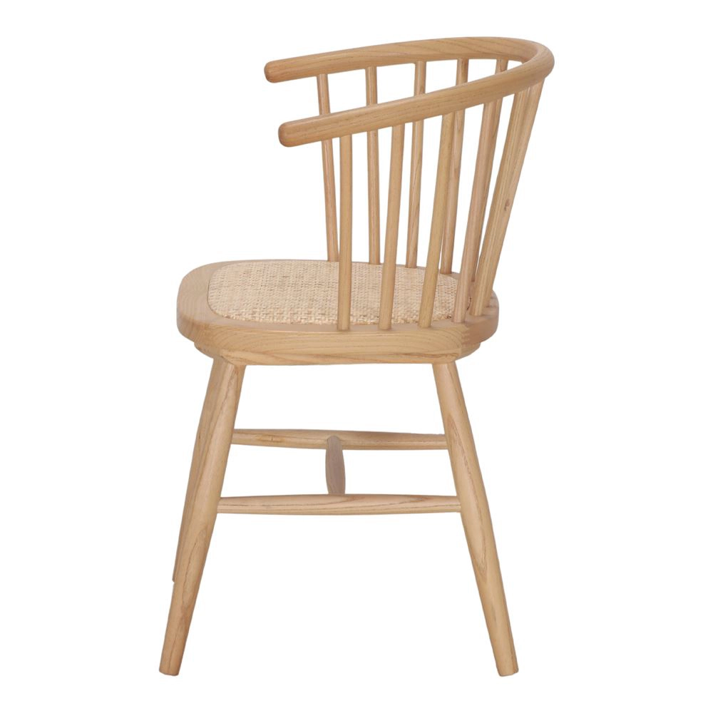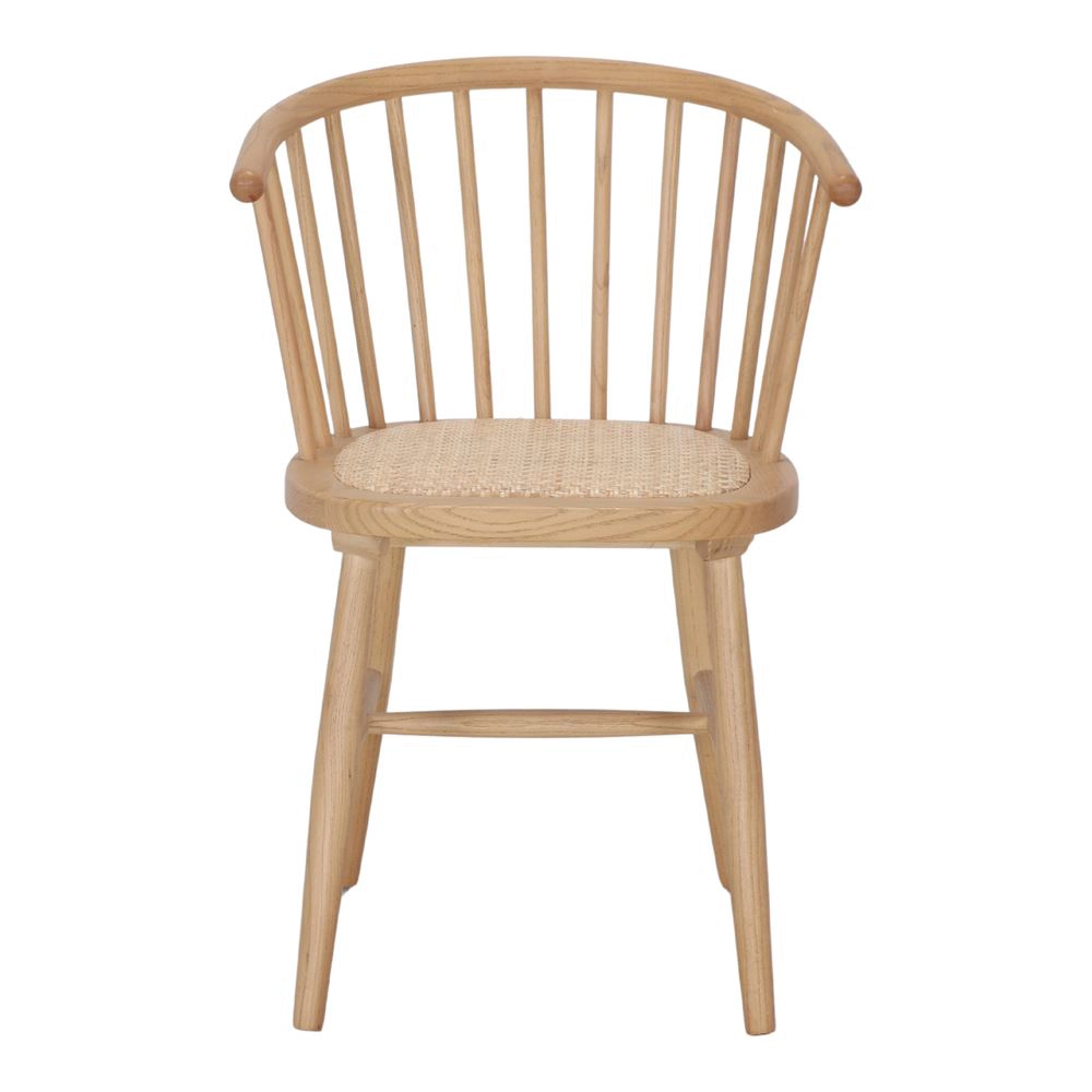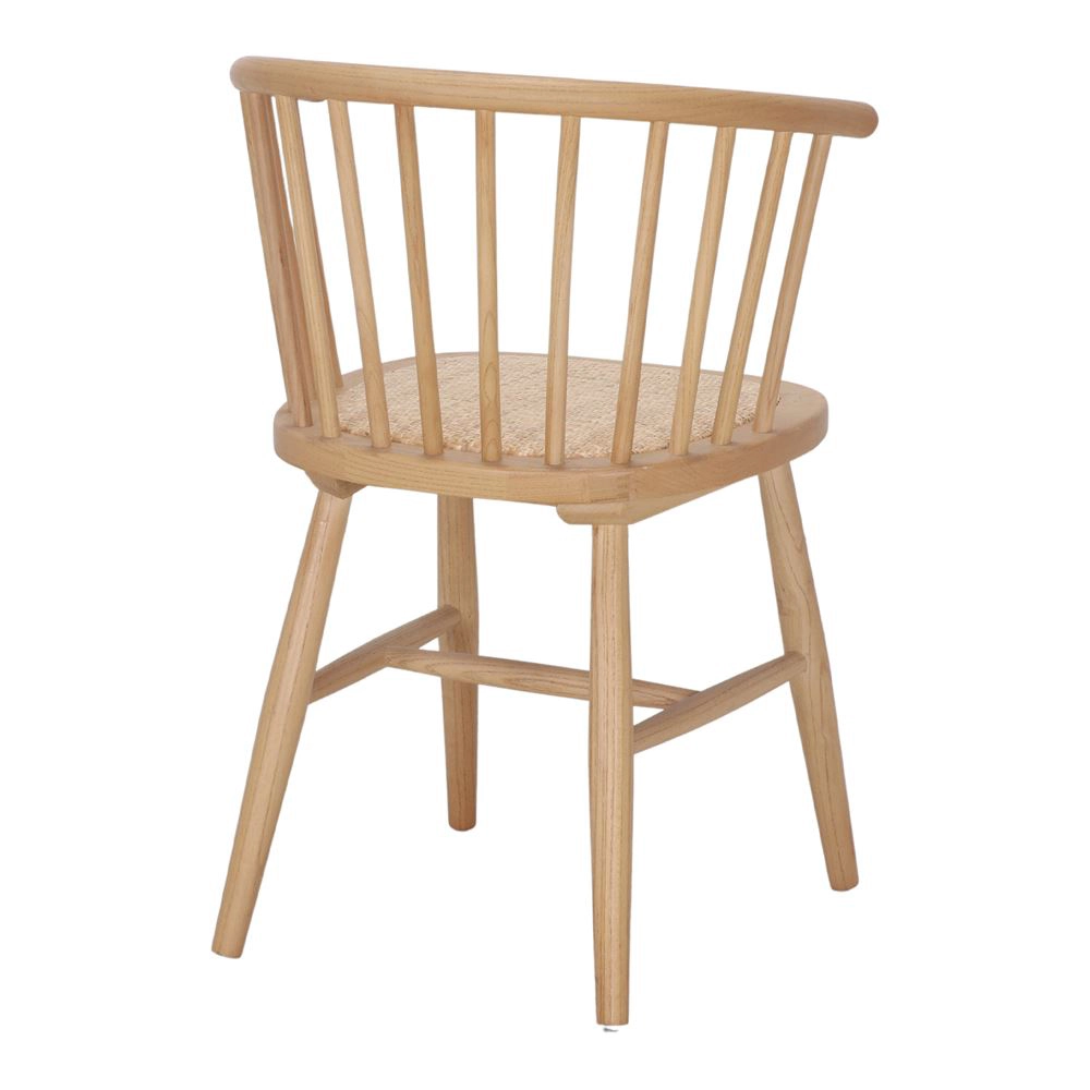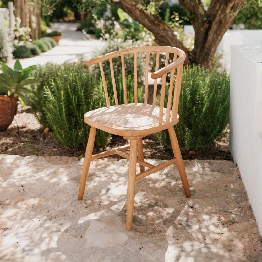 - A cadeira de jantar Cher destaca-se pelo seu design vintage com linhas arredondadas e estrutura em madeira maciça de olmo, combinando conforto e estética natural.