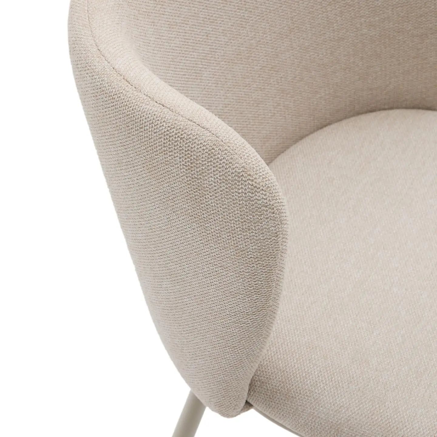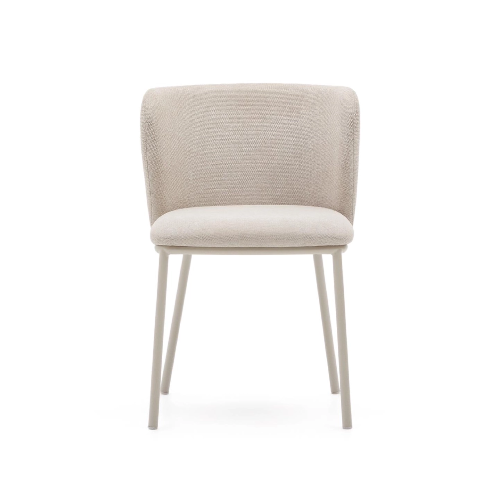 - A Cadeira Cilia destaca-se pelo estofado em chenille bege, suave e acolhedor, sobre uma estrutura metálica com acabamento bege mate.