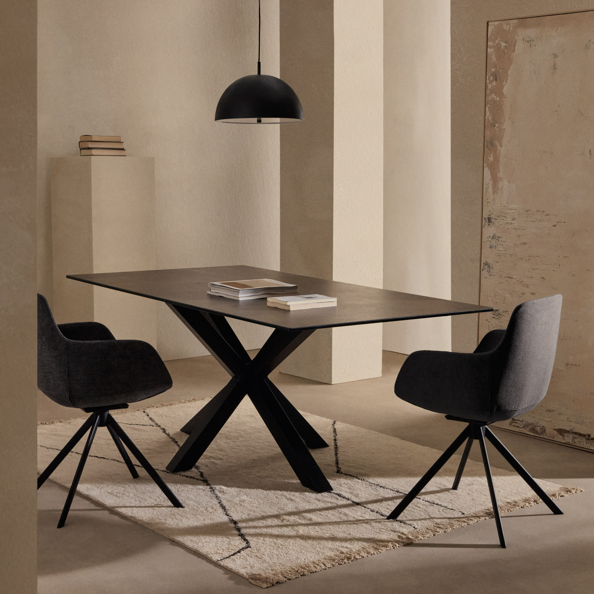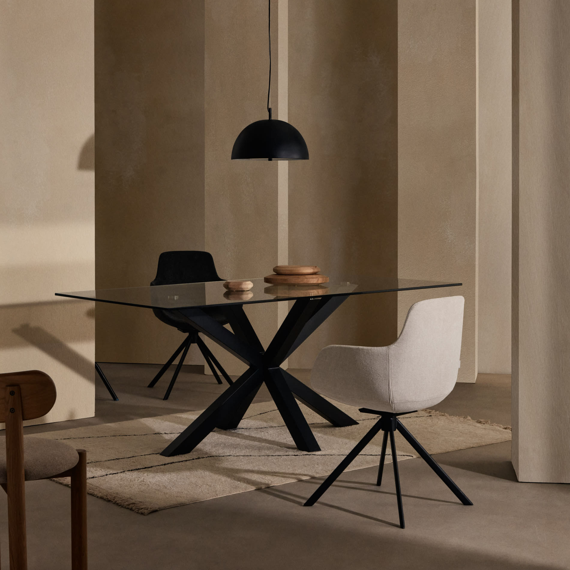 - Assento giratório com sistema de retorno automático e pernas em metal com acabamento preto mate.