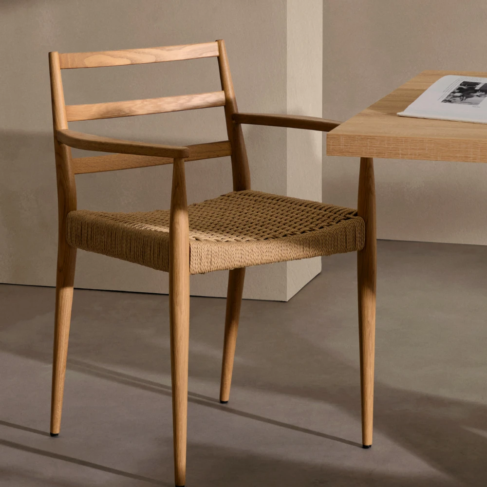 - Anilla combina a qualidade da madeira maciça de carvalho com um assento em corda de papel trançada à mão.