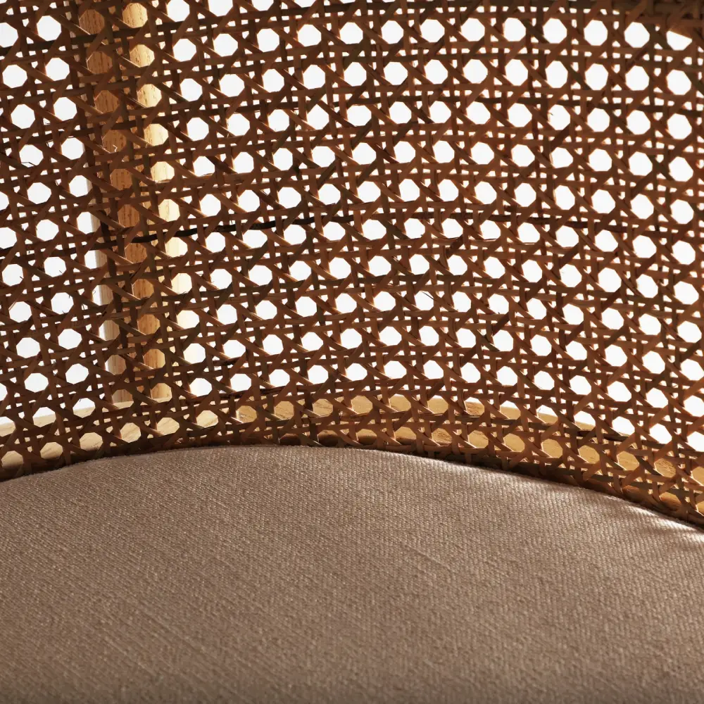 - O assento estofado em tom claro proporciona conforto adicional, enquanto o encosto em trama de rattan garante leveza visual e um toque artesanal.
