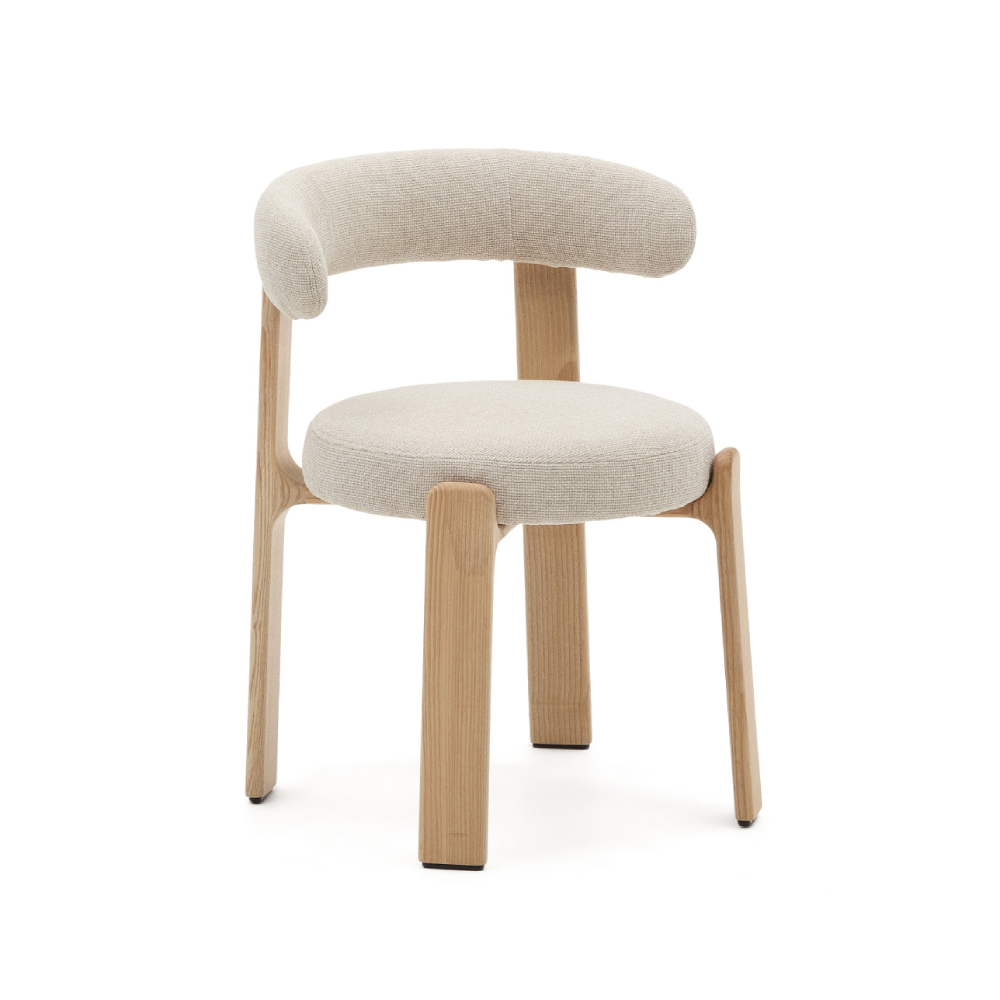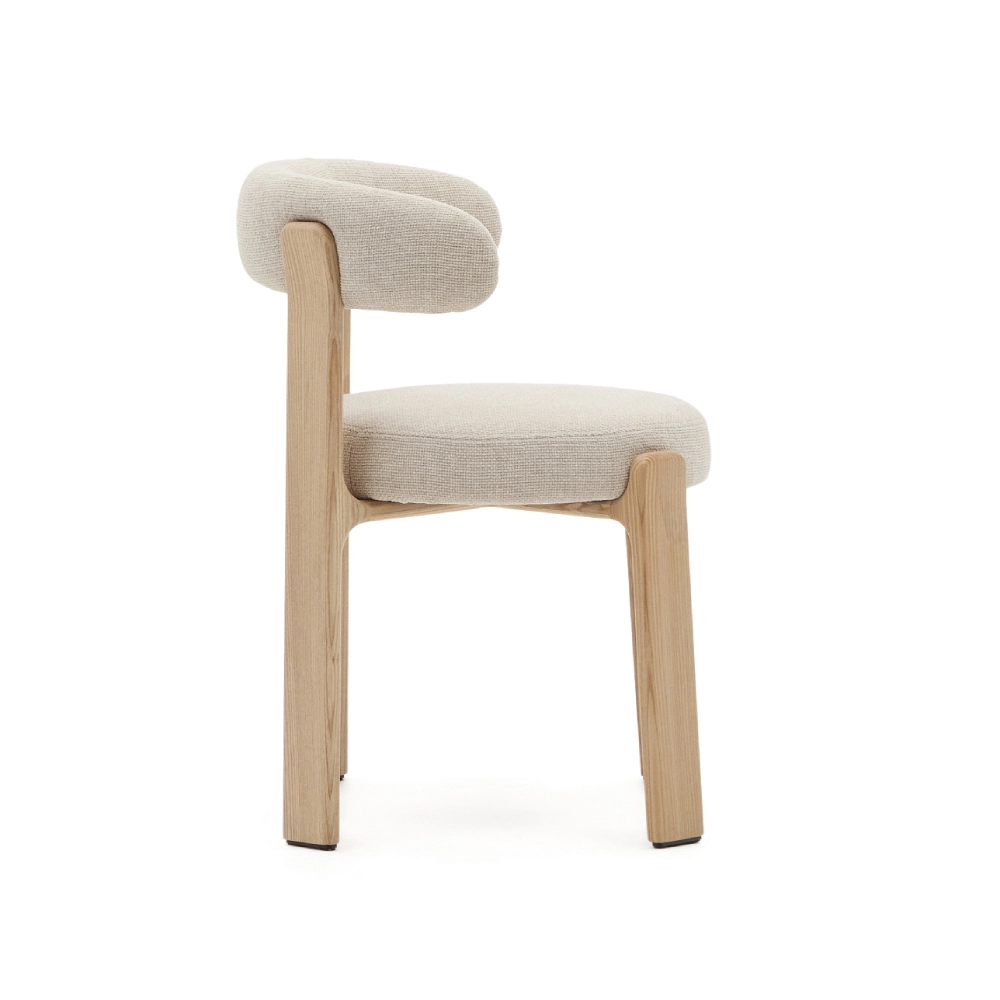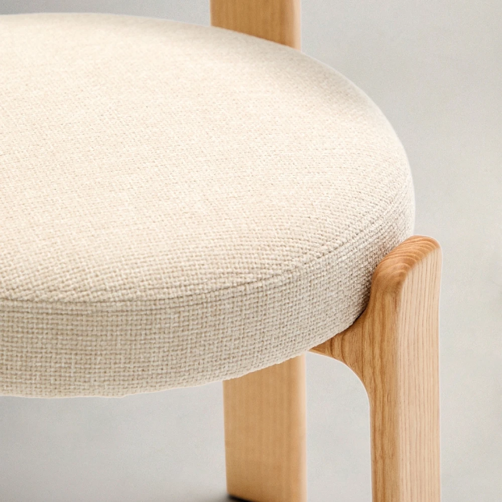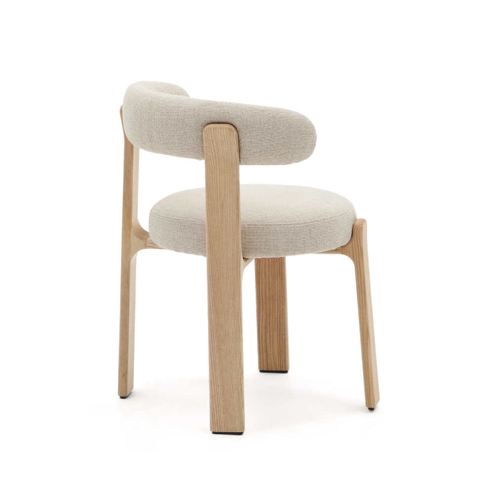 - O assento e o encosto curvado são estofados em chenille com poliéster reciclado de estrutura grande em bege bicolor, conferindo conforto e textura suave ao toque.