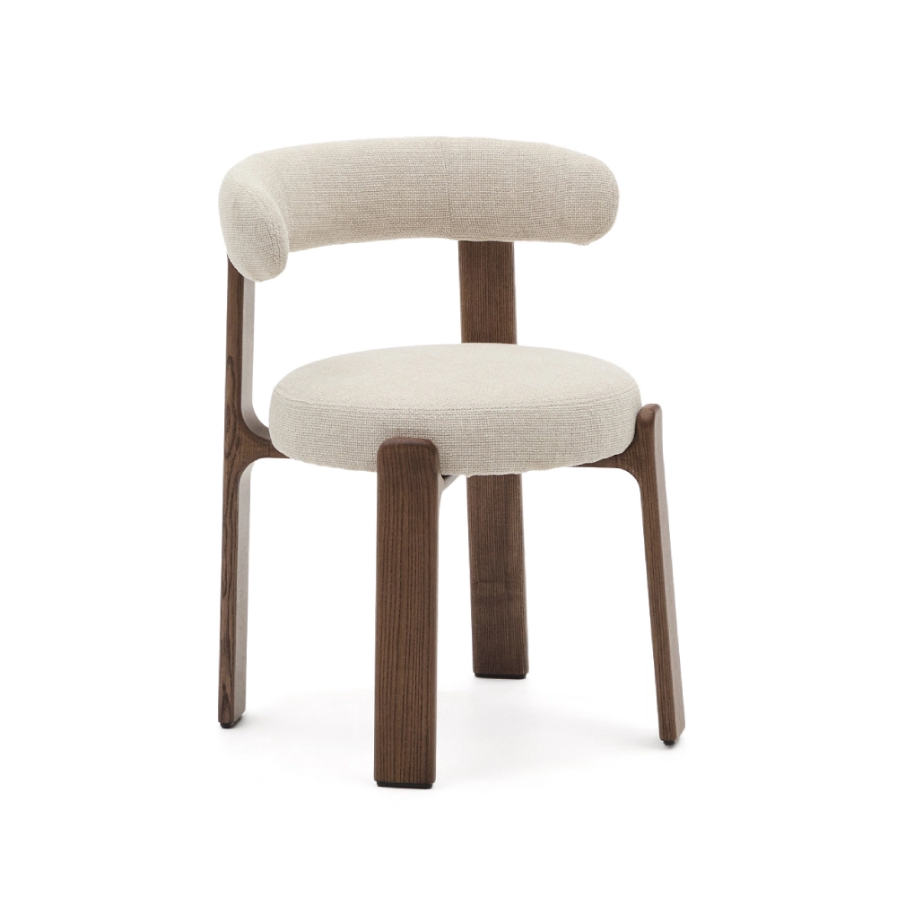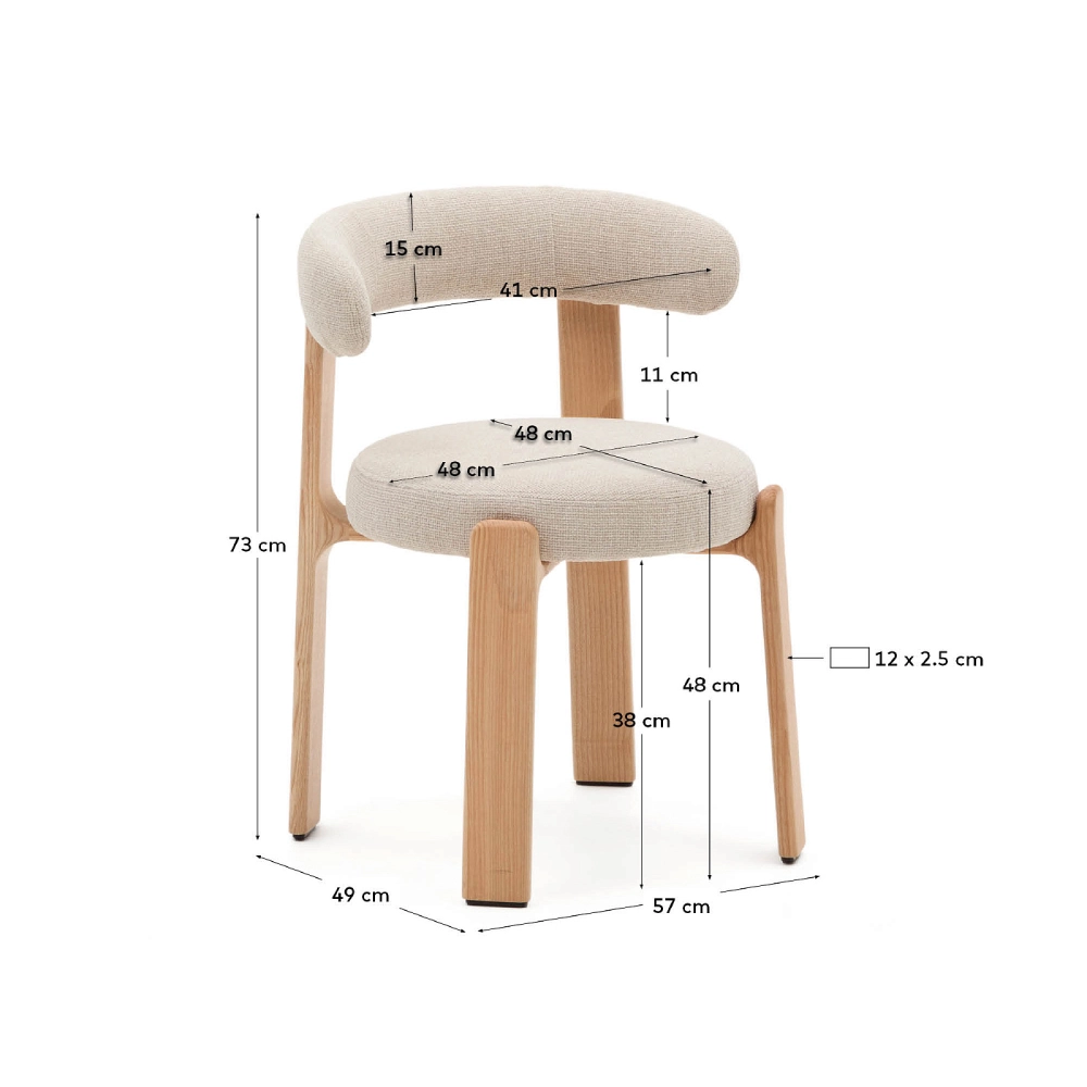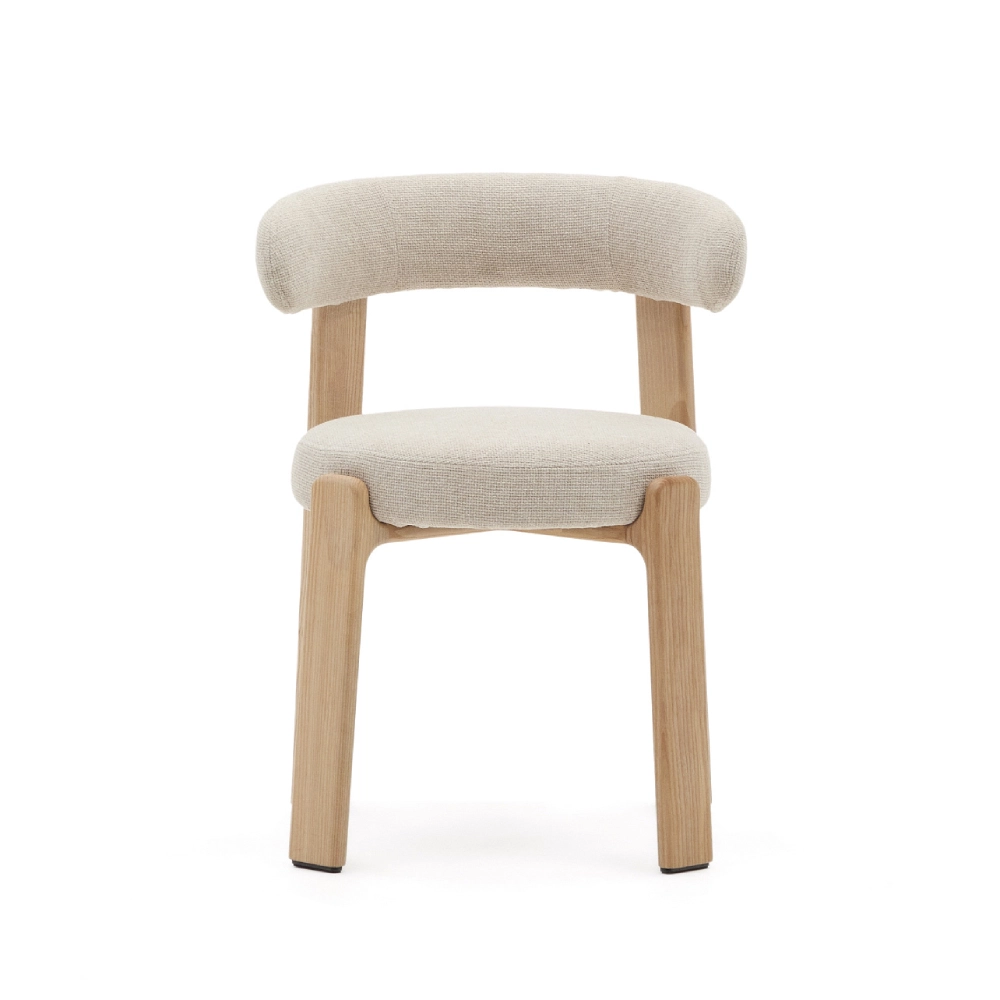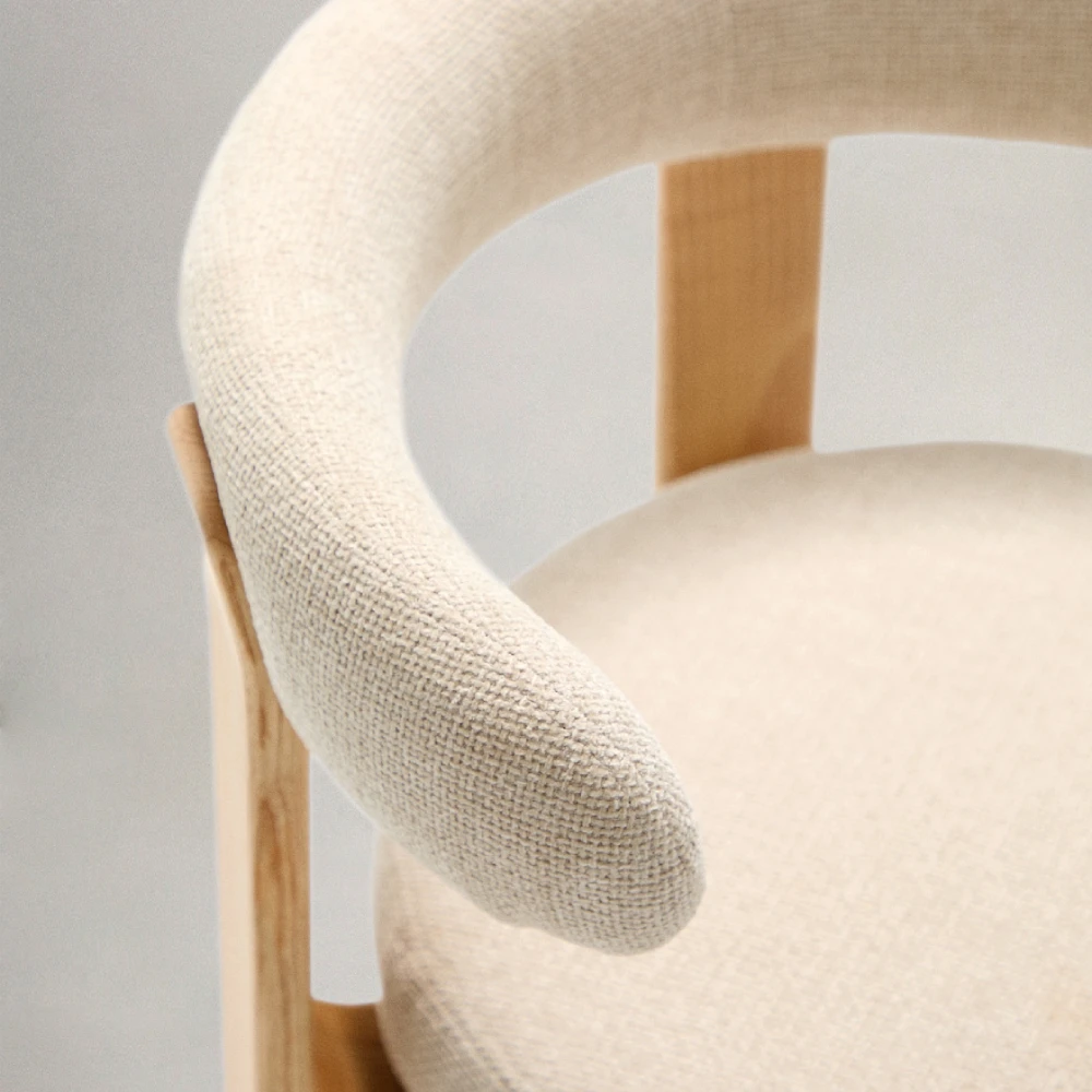 - O assento e o encosto curvado são estofados em chenille com poliéster reciclado de estrutura grande em bege bicolor, conferindo conforto e textura suave ao toque.
