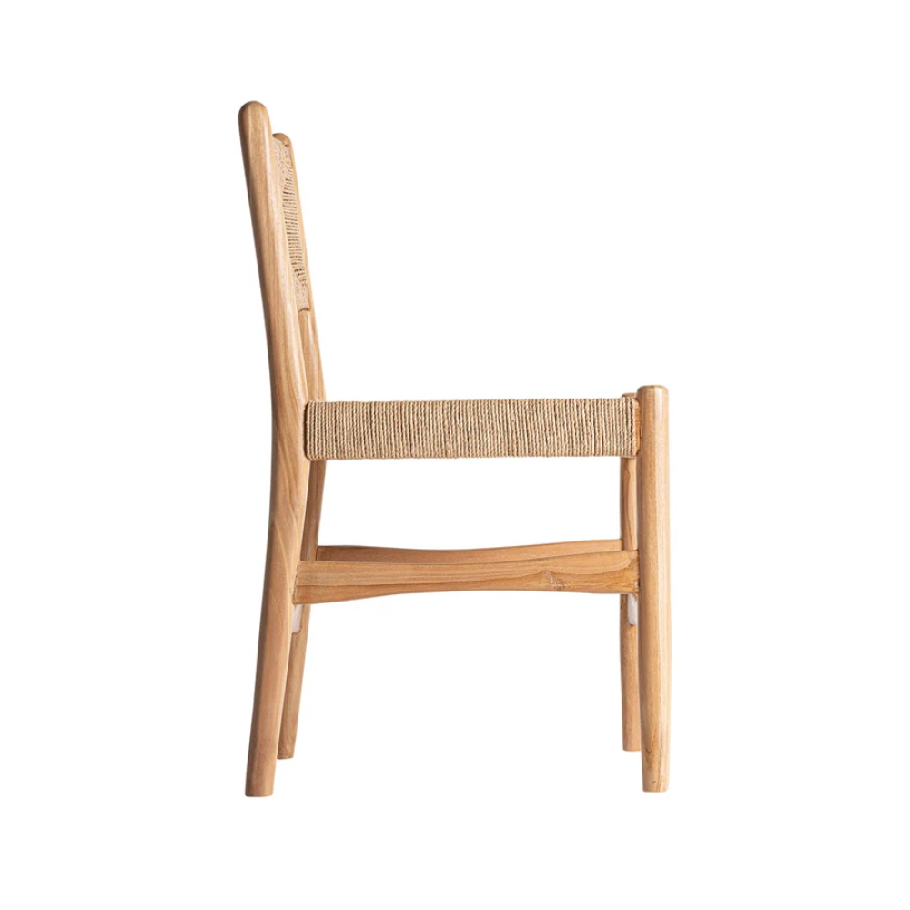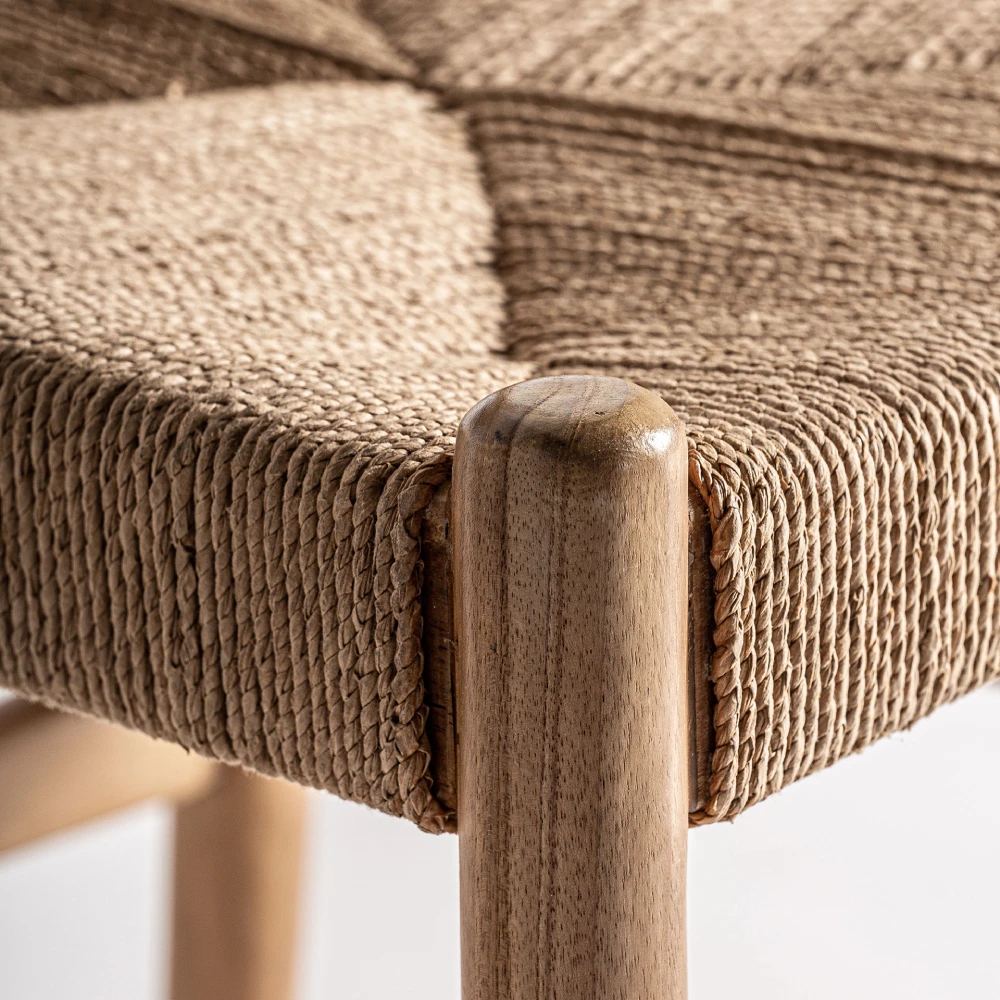 - O assento firme e o encosto em fibras naturais oferecem apoio ergonómico e um toque rústico elegante, enquanto a estrutura robusta em teca garante durabilidade e estabilidade.