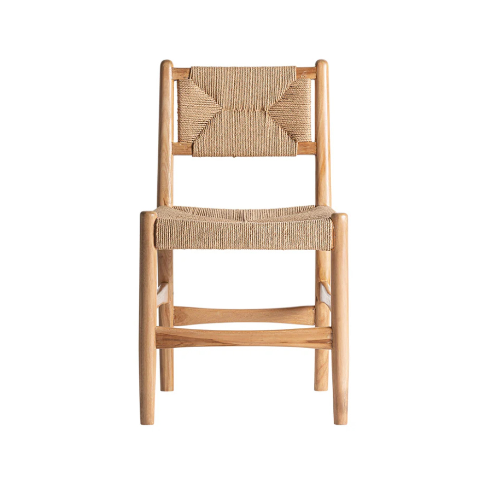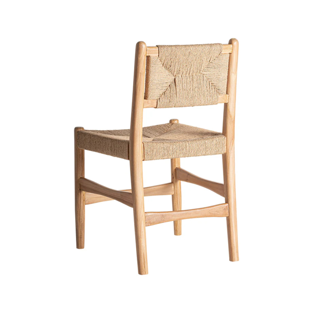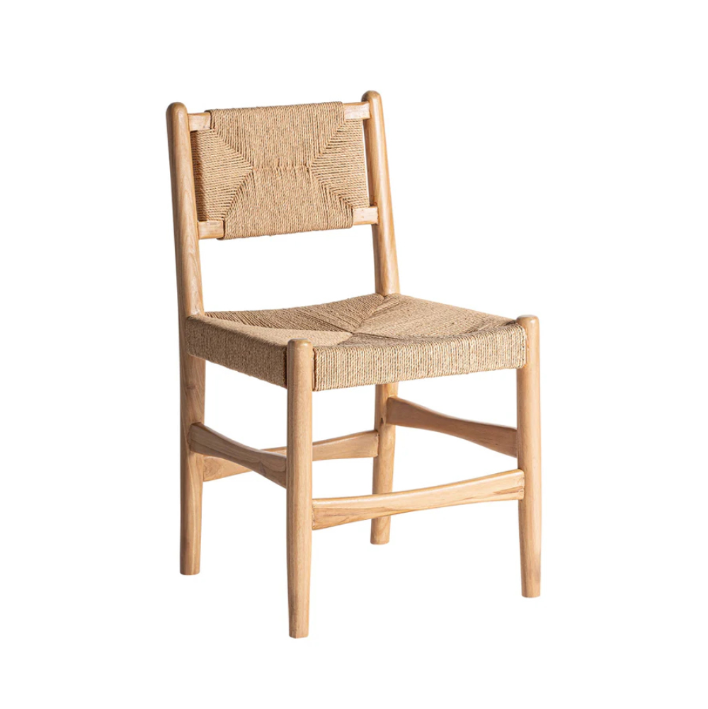 - A cadeira de jantar Agia da marca Vical Home combina o calor natural da madeira de teca maciça com a textura artesanal da corda de cânhamo entrançada.