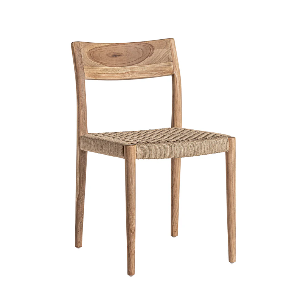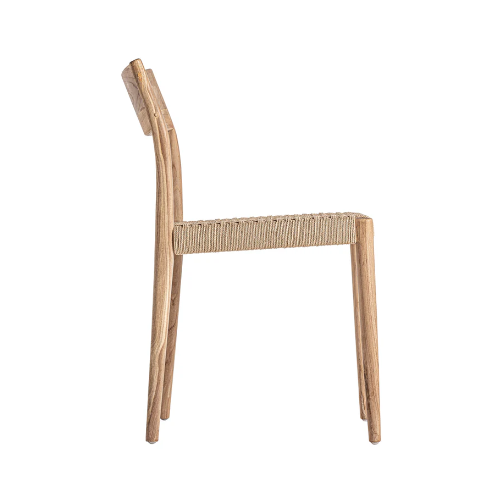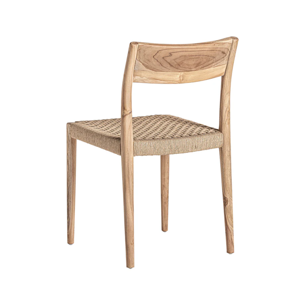 - A estrutura em madeira maciça de teca, com veios marcados e tom natural, assegura estabilidade e durabilidade, enquanto o assento em corda natural entrançada à mão acrescenta textura, respirabilidade e conforto.