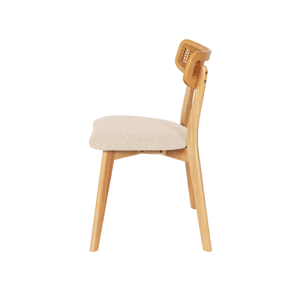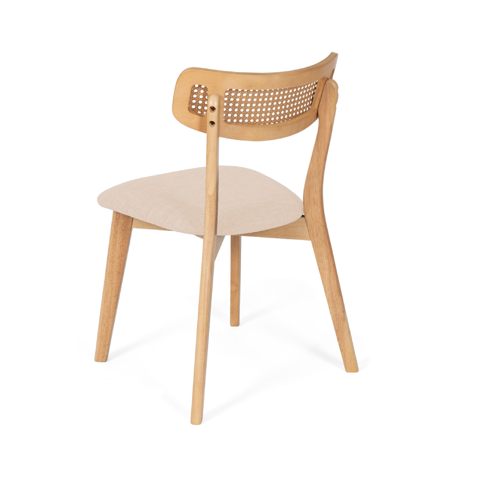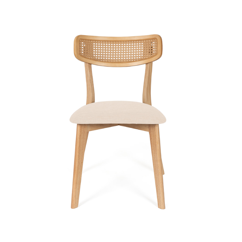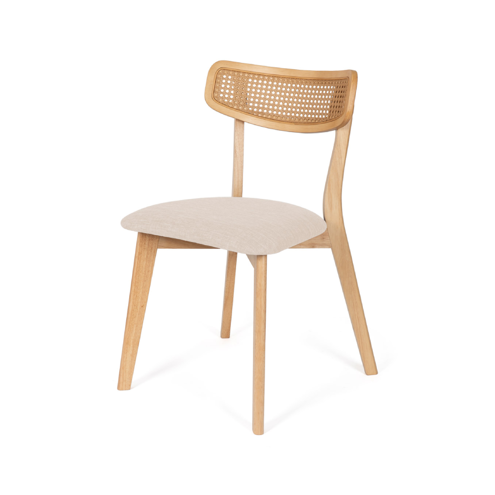 - Combina uma estrutura em madeira de carvalho com assento estofado em tom bege, criando uma peça equilibrada entre conforto, leveza visual e robustez.