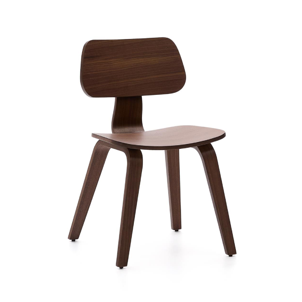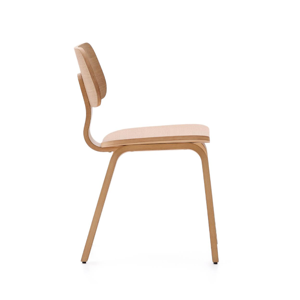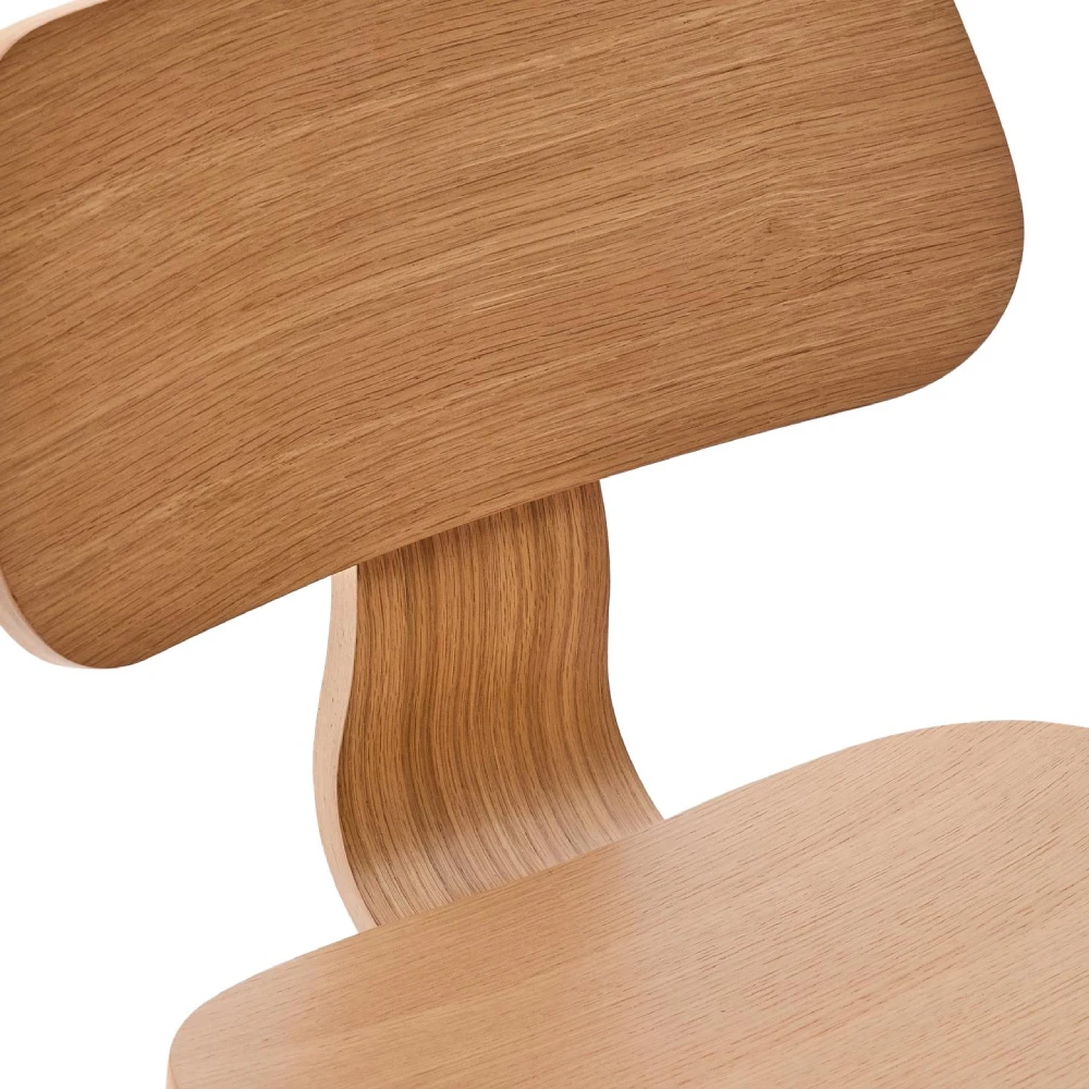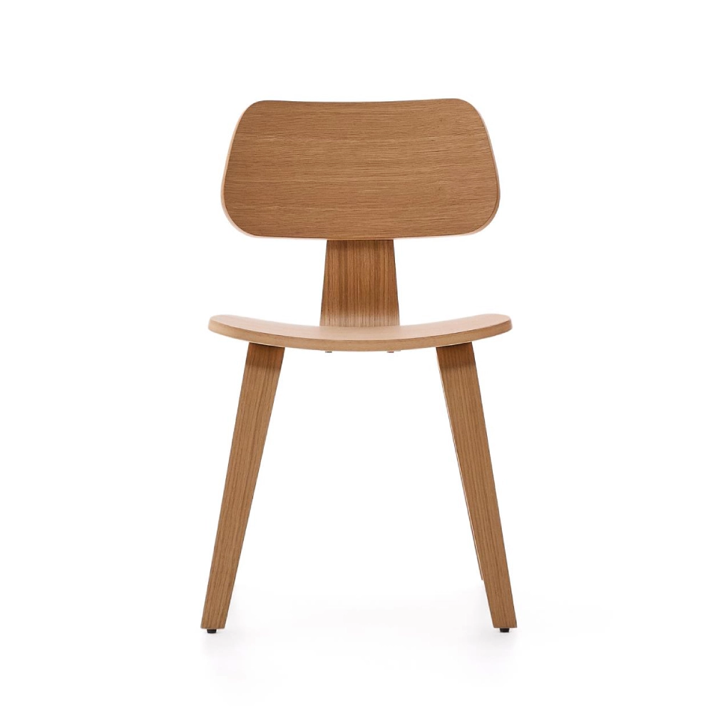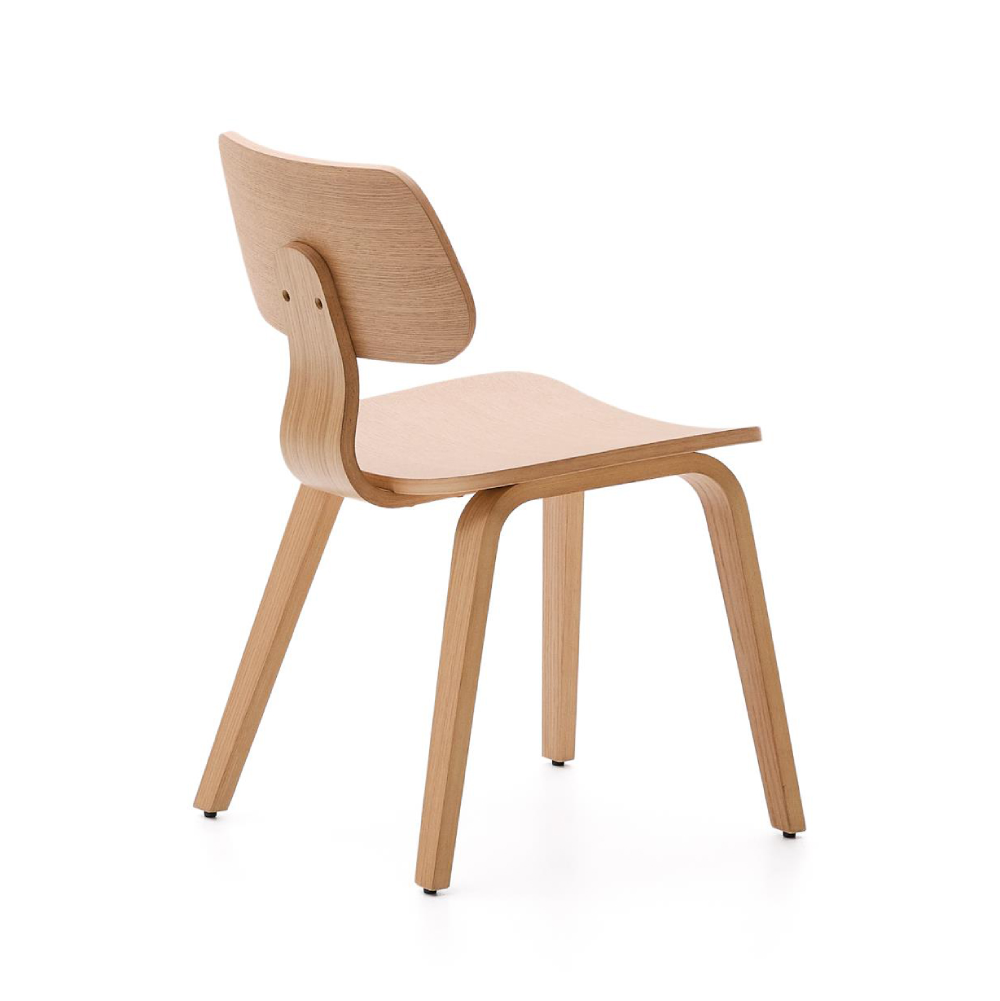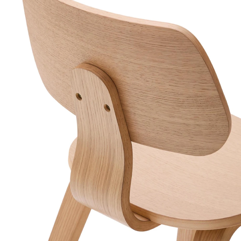 - A Cadeira Gene combina madeira de seringueira natural com contraplacado de carvalho no encosto, destacando linhas curvas e estética leve.