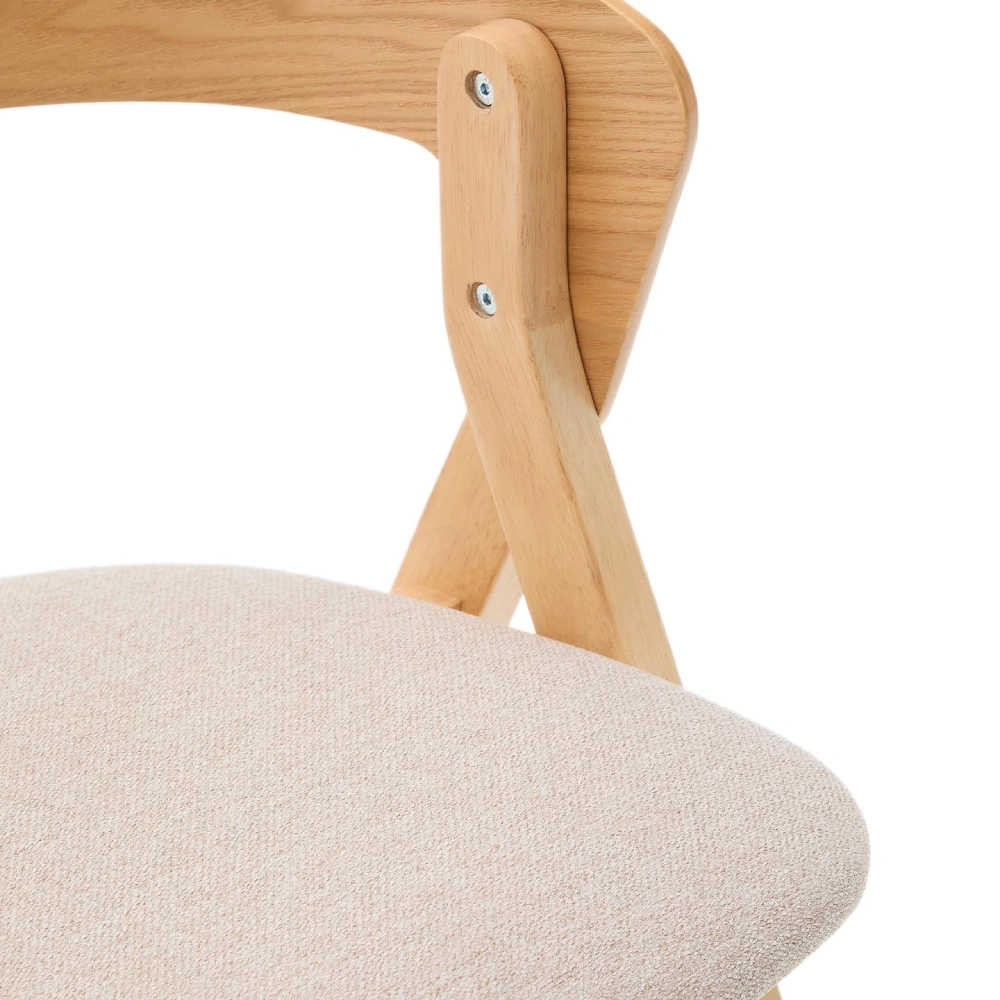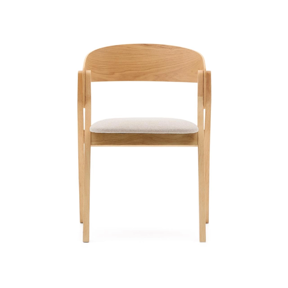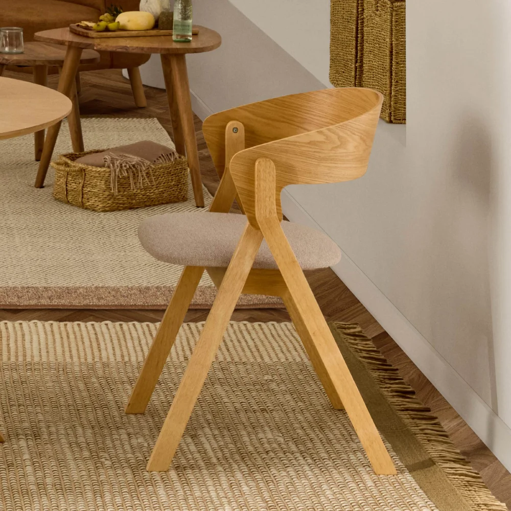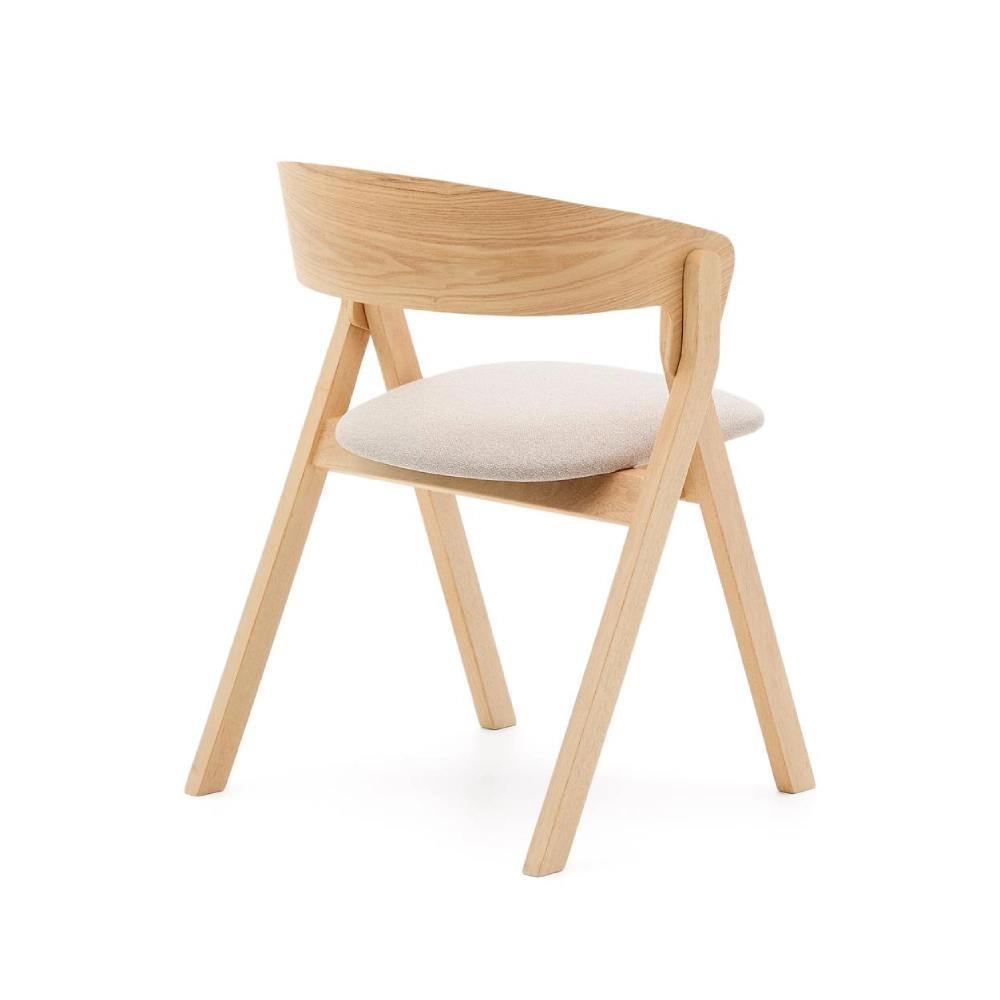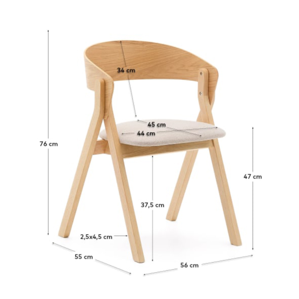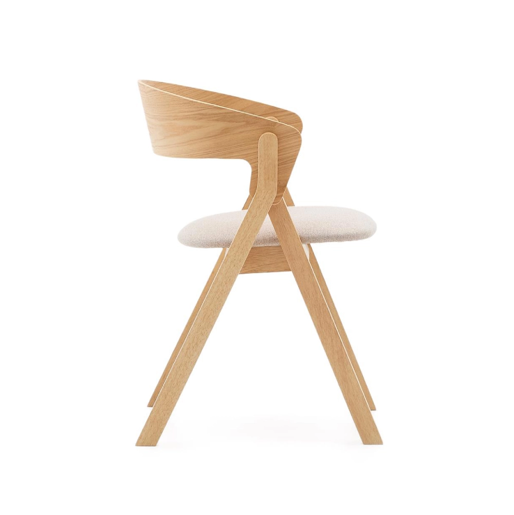 - Apresenta uma estrutura em madeira maciça de seringueira combinada com encosto em chapa de freixo e assento estofado em tecido chenille bege reciclado.