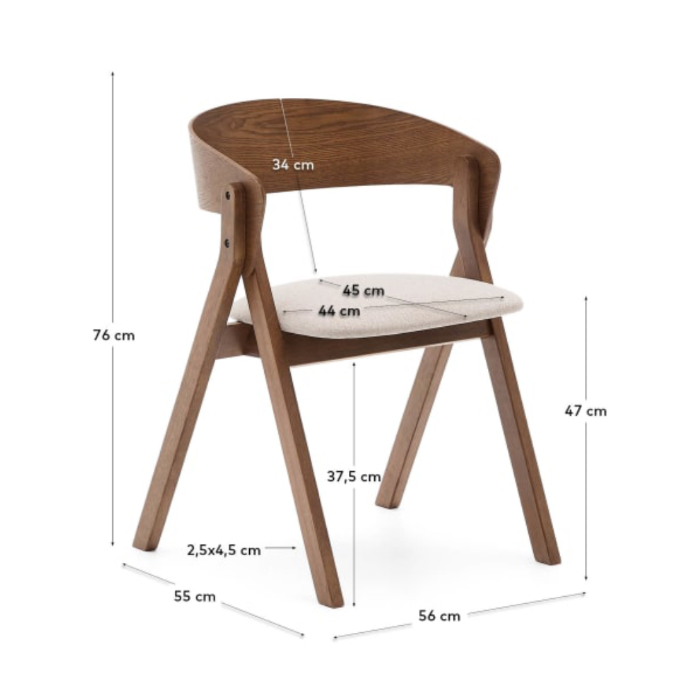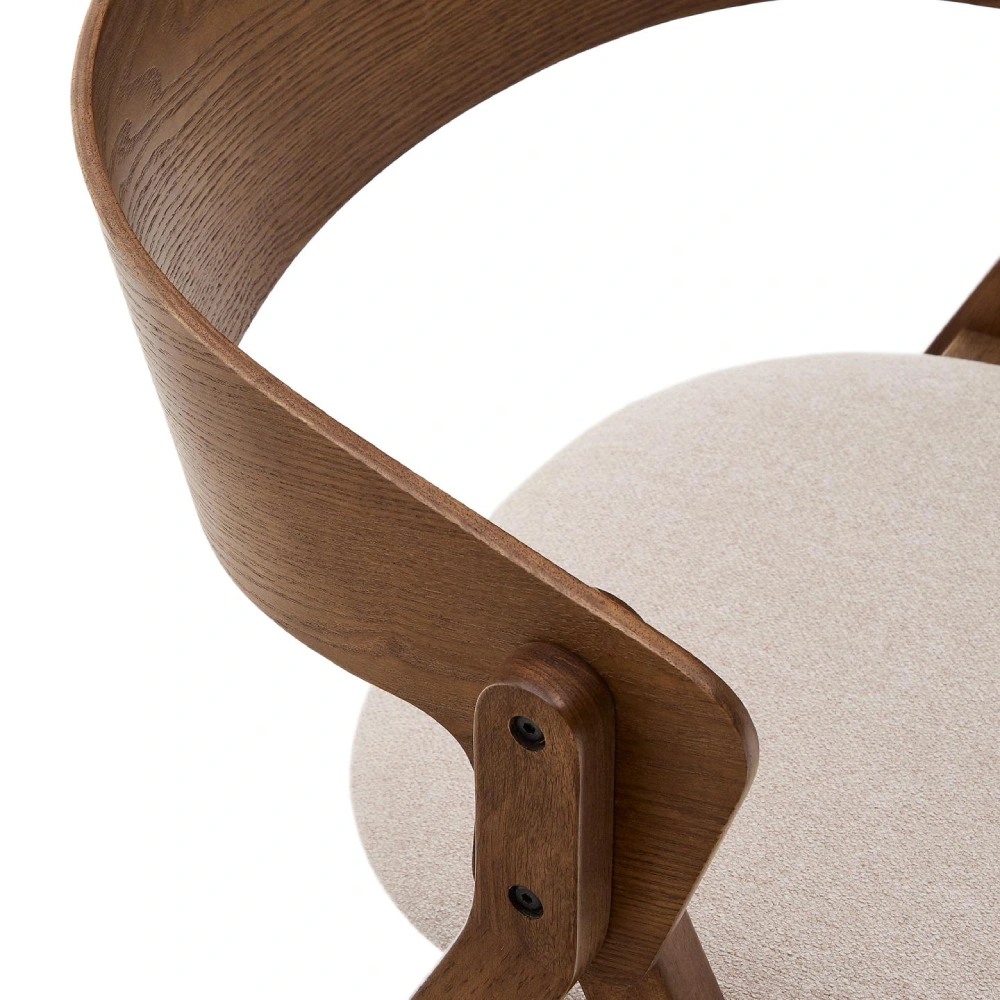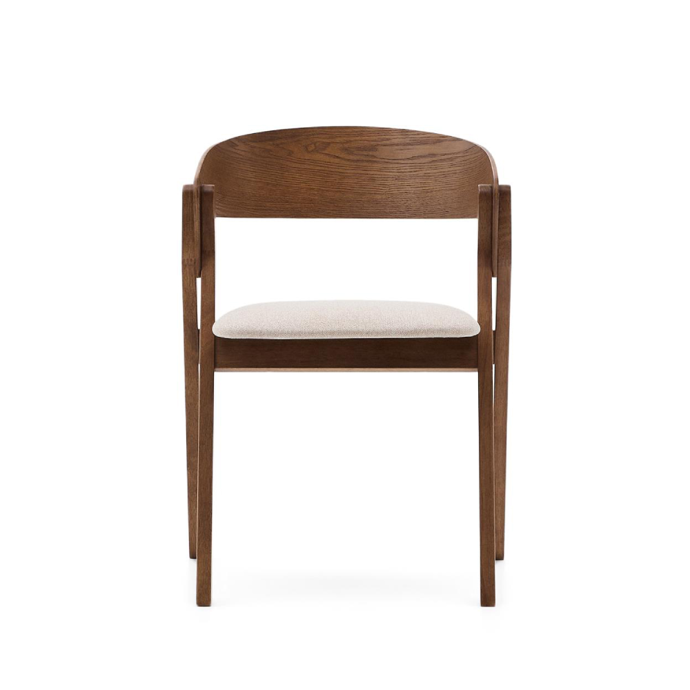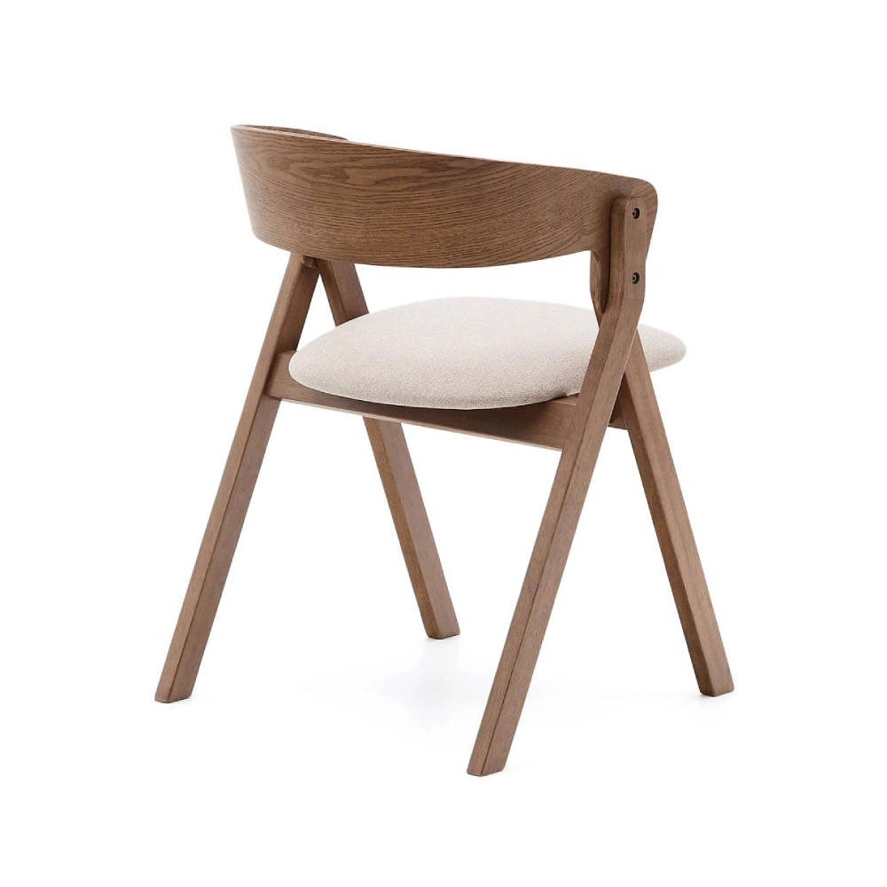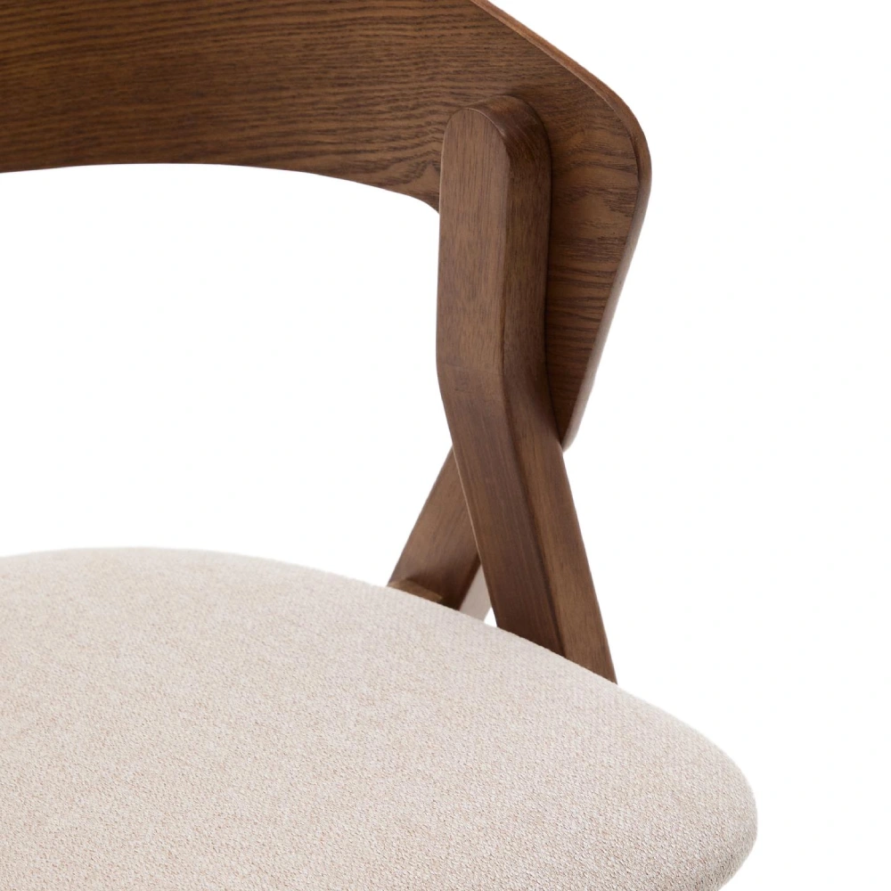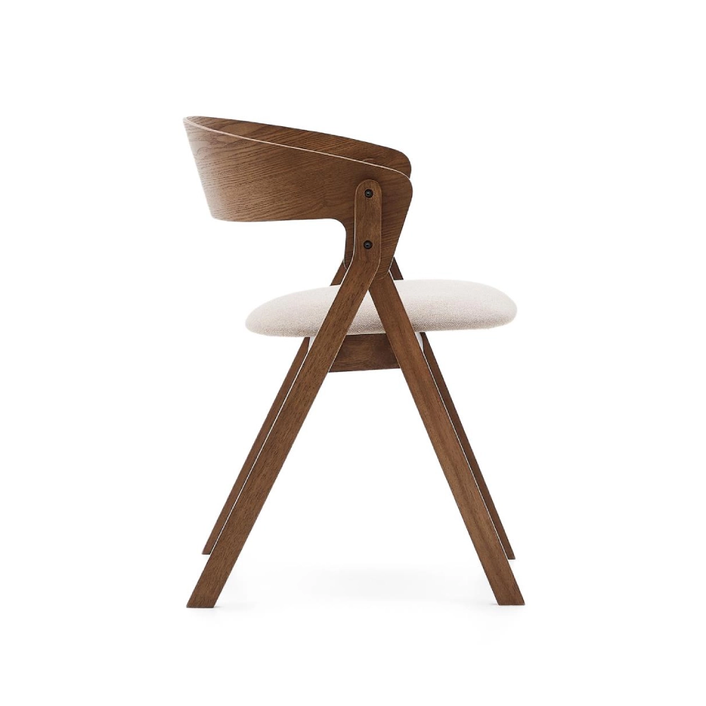 - A Cadeira Gida combina pernas robustas em madeira maciça de seringueira com acabamento em tom wengué e assento estofado em chenille bege de poliéster reciclado.