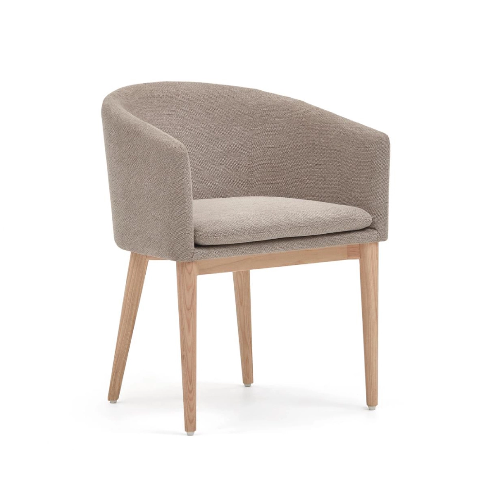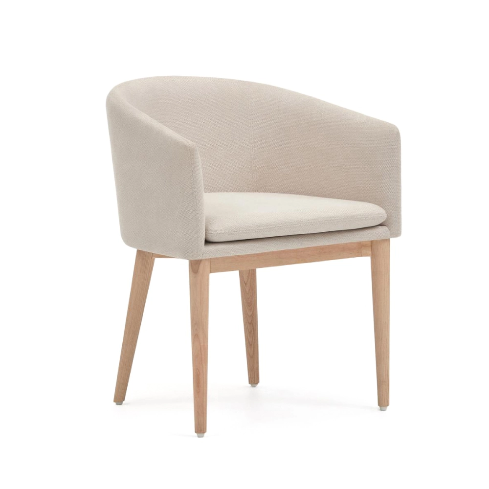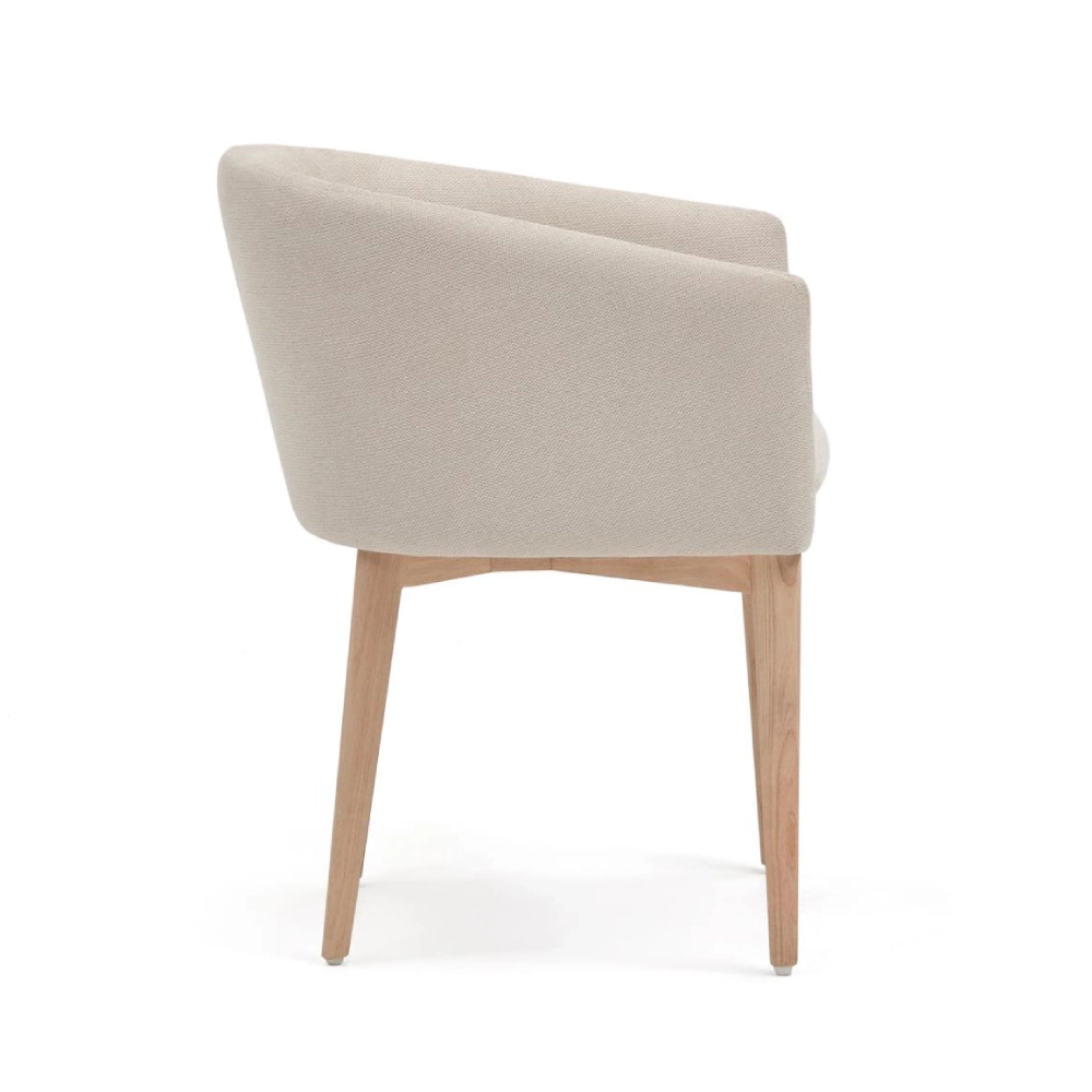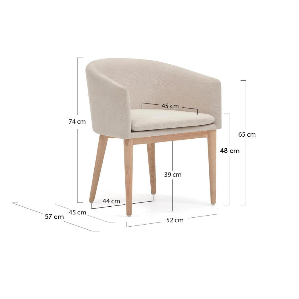 - O encosto envolvente com apoio de braços garante ergonomia, enquanto as pernas em madeira maciça de freixo conferem estabilidade e um toque natural.