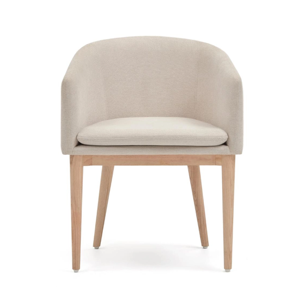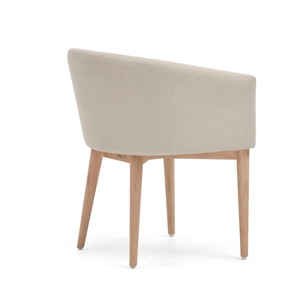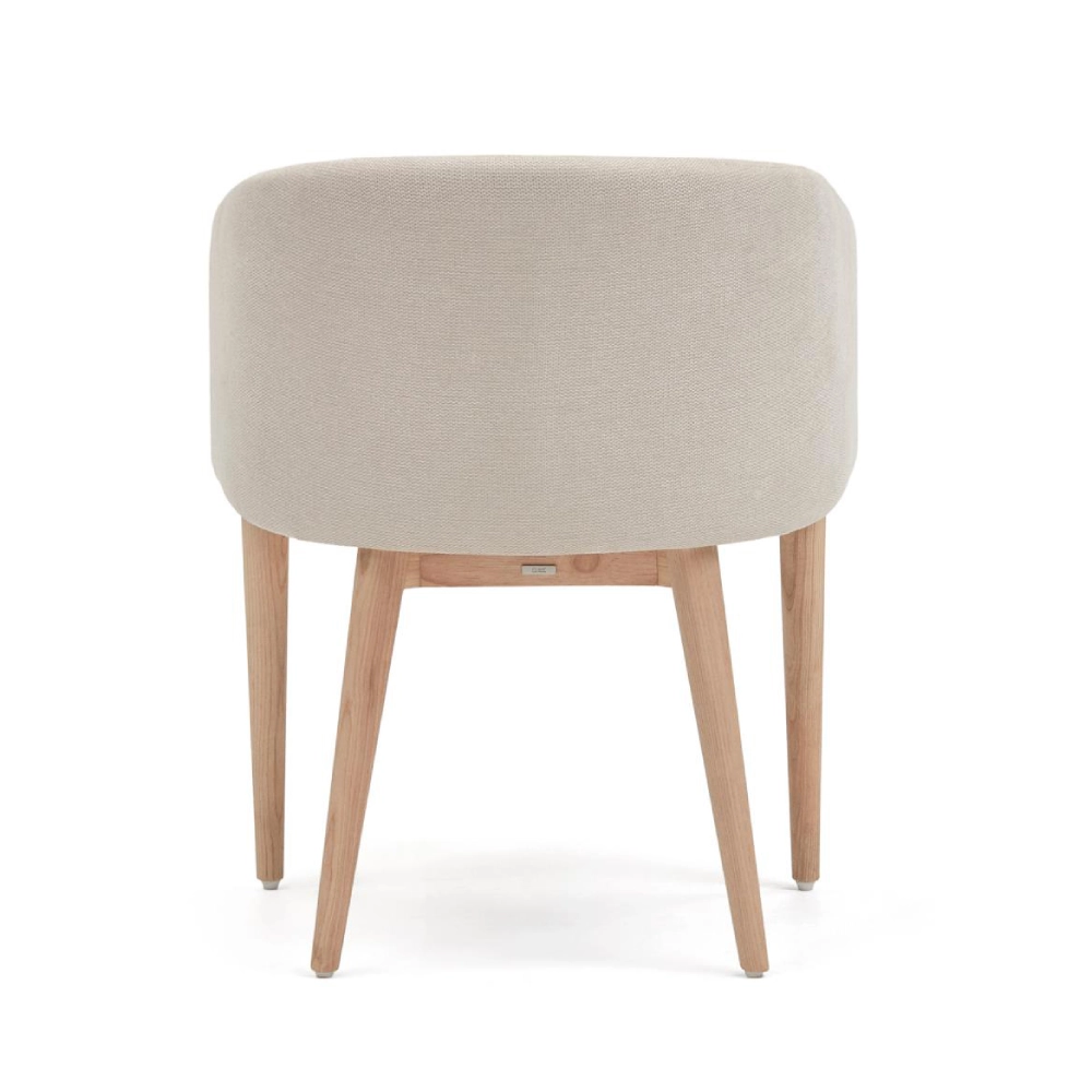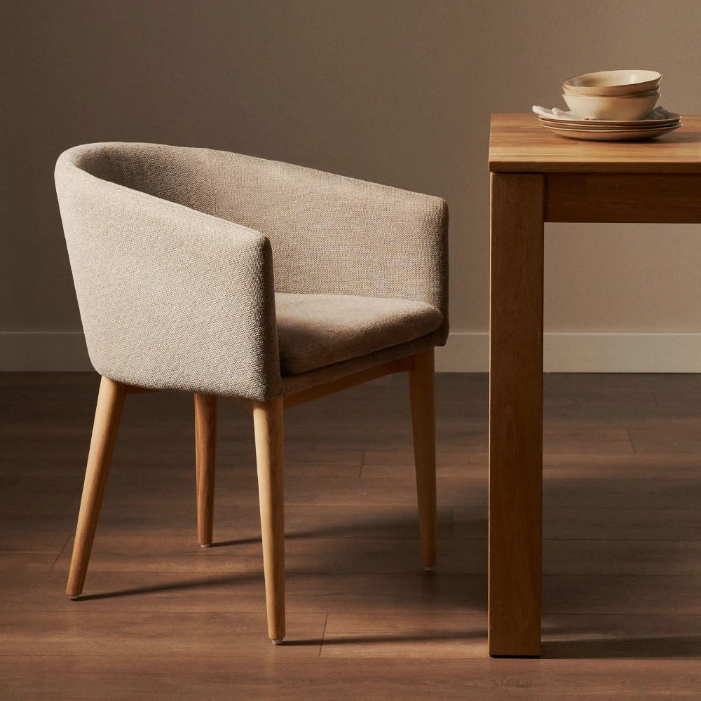 - O encosto envolvente com apoio de braços garante ergonomia, enquanto as pernas em madeira maciça de freixo conferem estabilidade e um toque natural.
