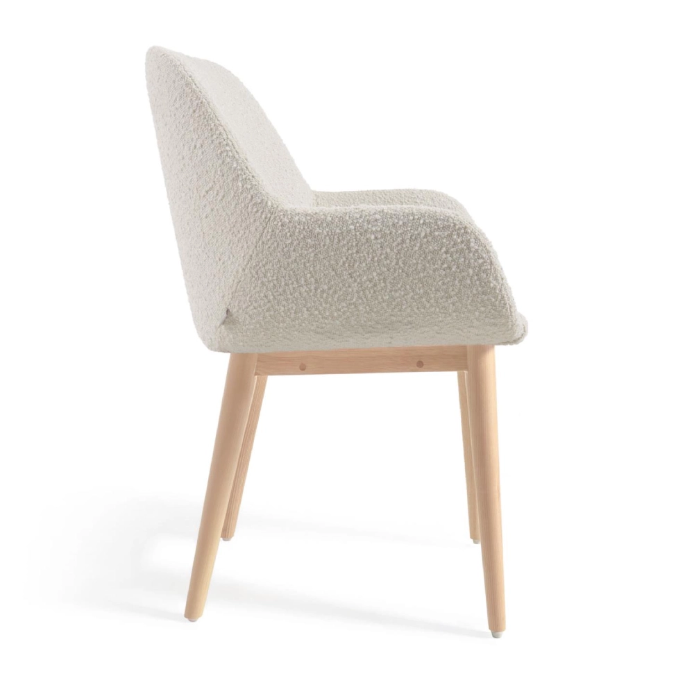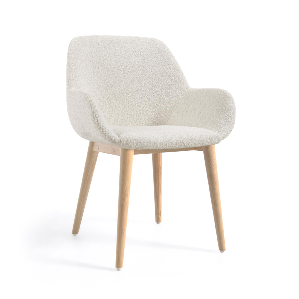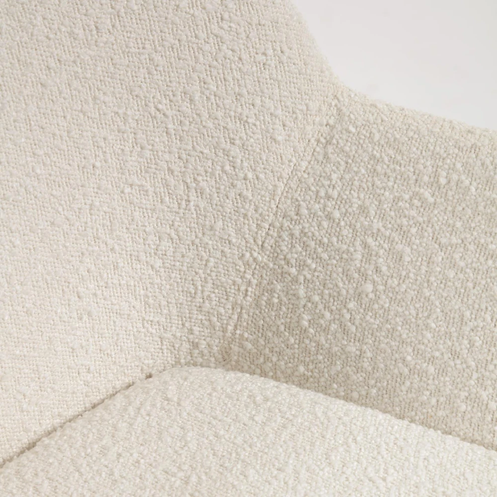 - O assento e encosto estofados em tecido bouclé branco oferecem suavidade e elegância, enquanto as pernas em madeira maciça de freixo acrescentam resistência e naturalidade.