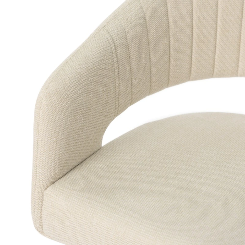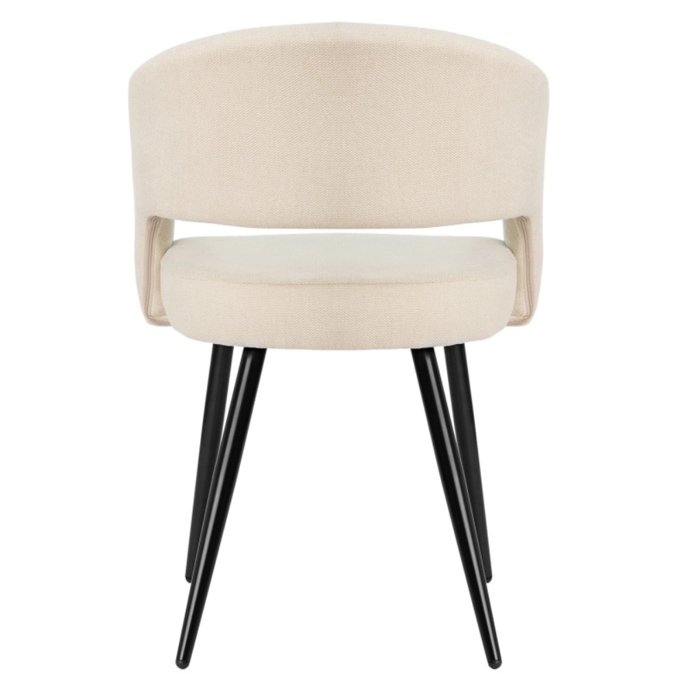 - O design é valorizado pelo recorte elegante na parte inferior do encosto, que acrescenta personalidade e leveza ao conjunto.