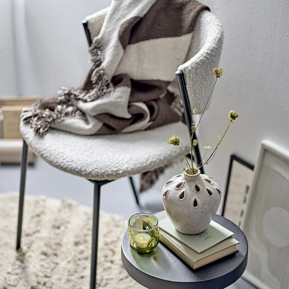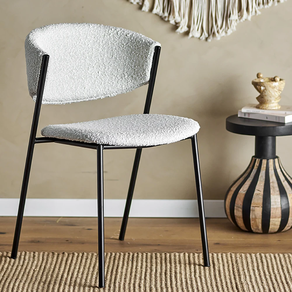 - A cadeira de jantar Marlo da Bloomingville alia a elegância do design nórdico minimalista ao conforto do assento estofado em tecido bouclé branco.