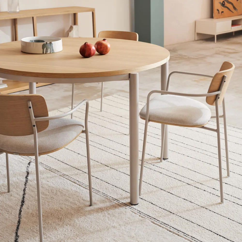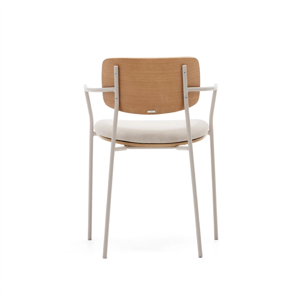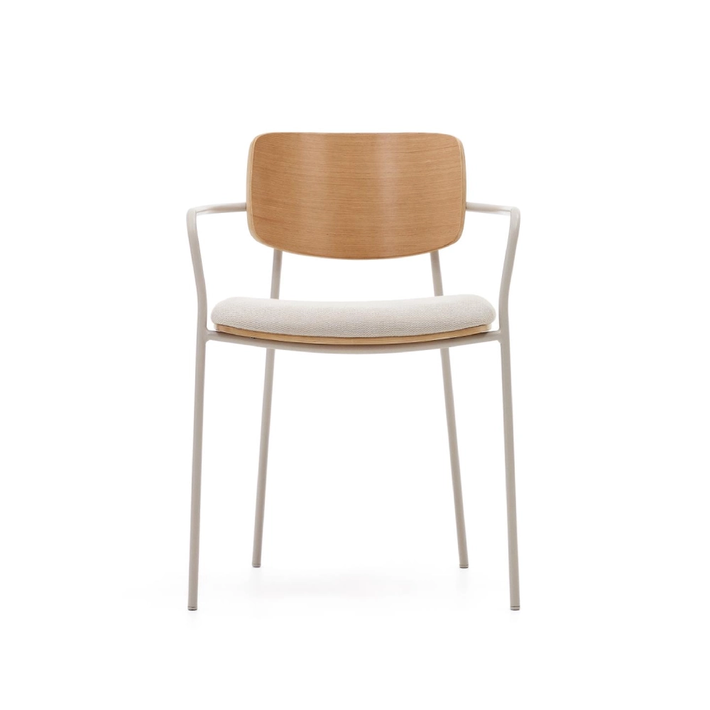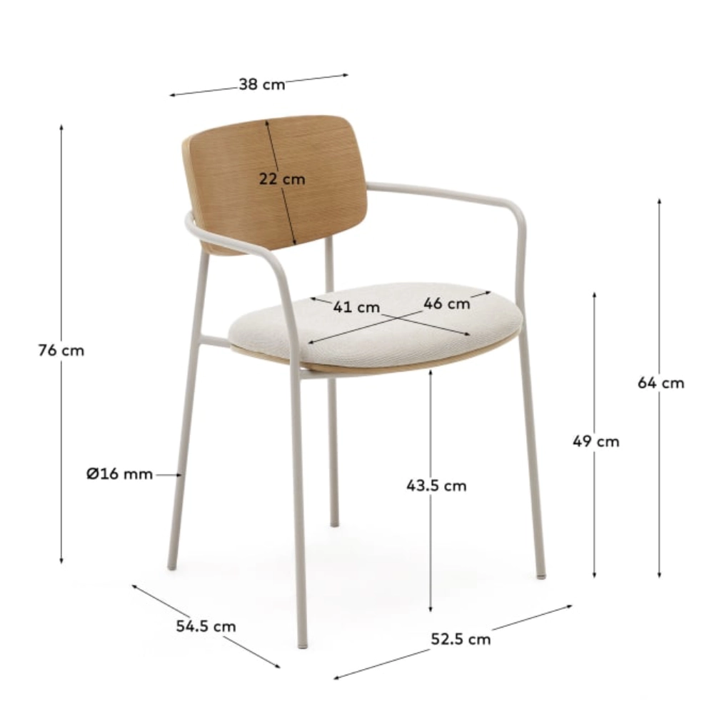 - A estrutura em metal pintado mate com braços integrados garante resistência e um visual leve, enquanto o encosto em chapa de carvalho acrescenta calor natural.