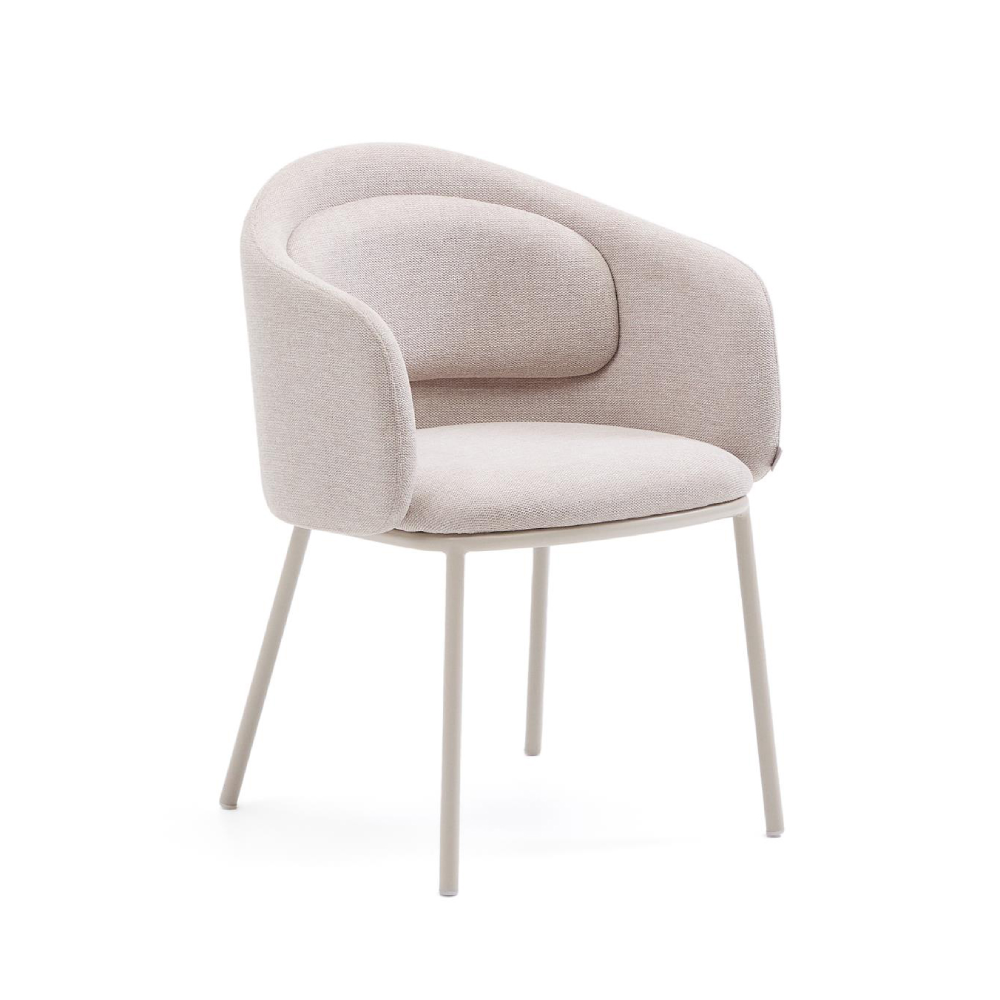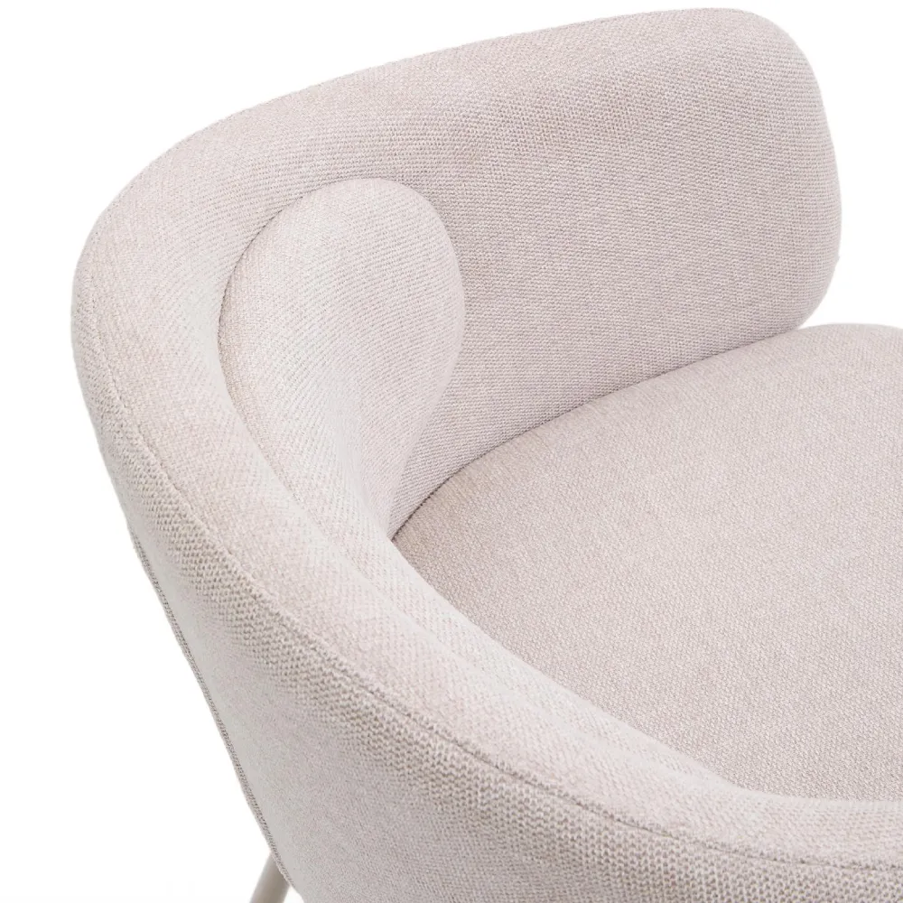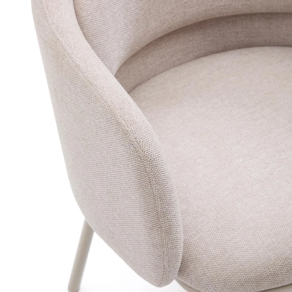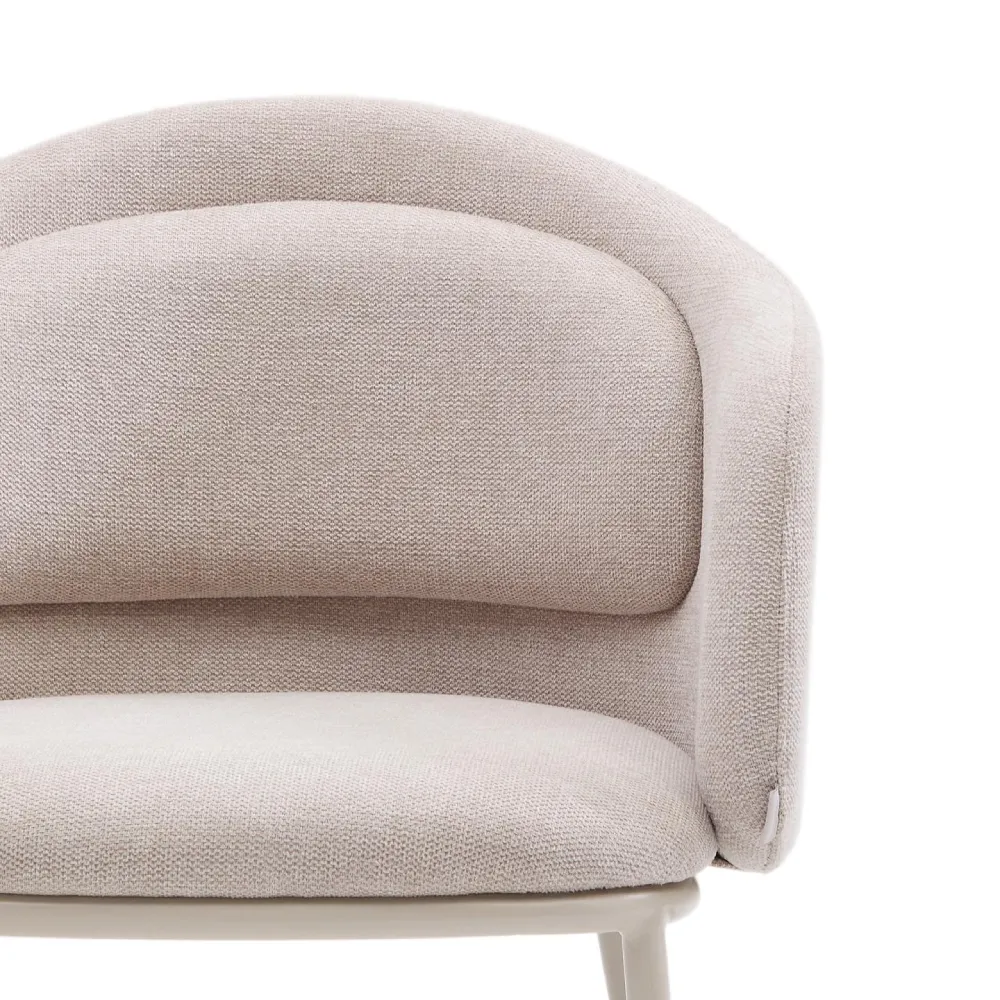 - O assento estofado em chenille bege oferece suavidade e aconchego visual, enquanto a estrutura metálica com acabamento bege mate confere estabilidade e leveza.