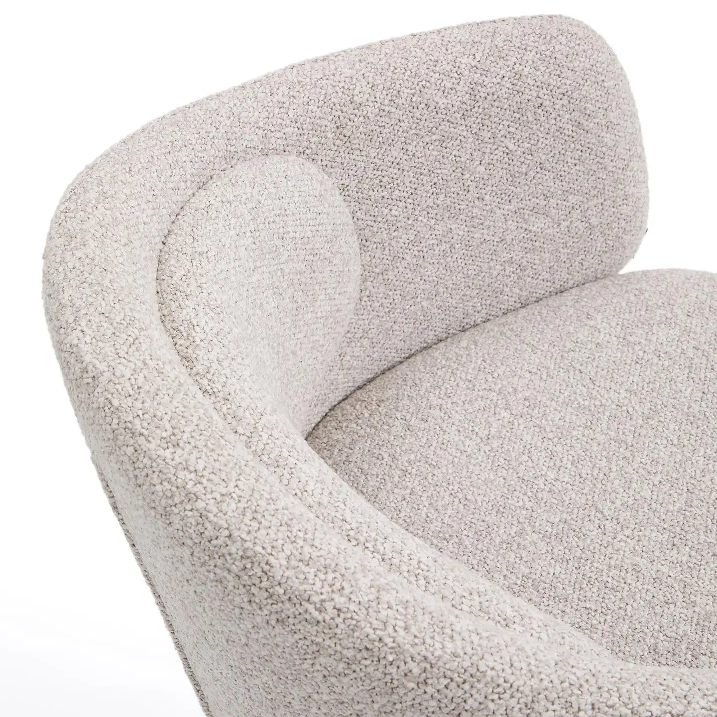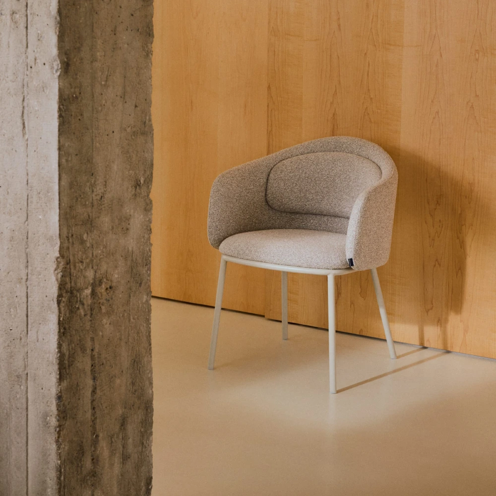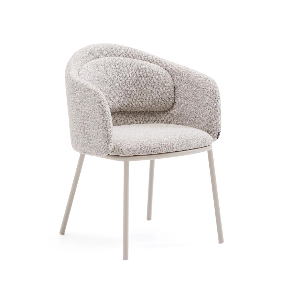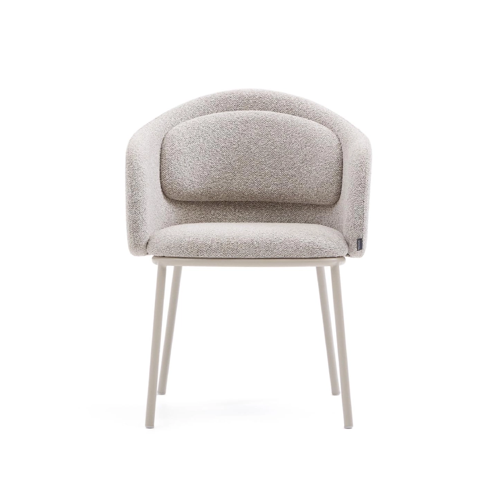 - O assento em chenille grosso bege oferece textura e conforto acolhedor, enquanto as pernas em metal com pintura em pó epóxi bege conferem leveza e estabilidade.
